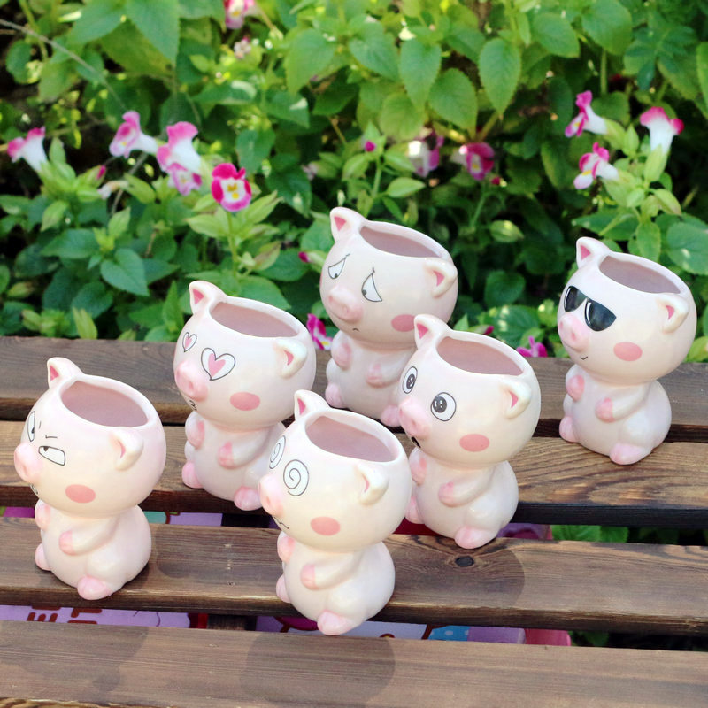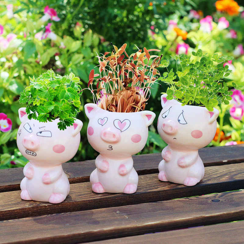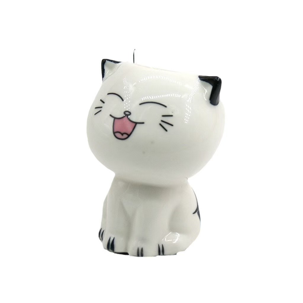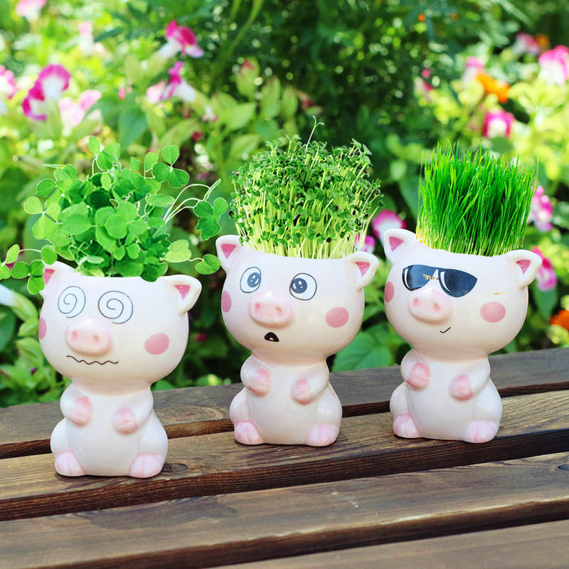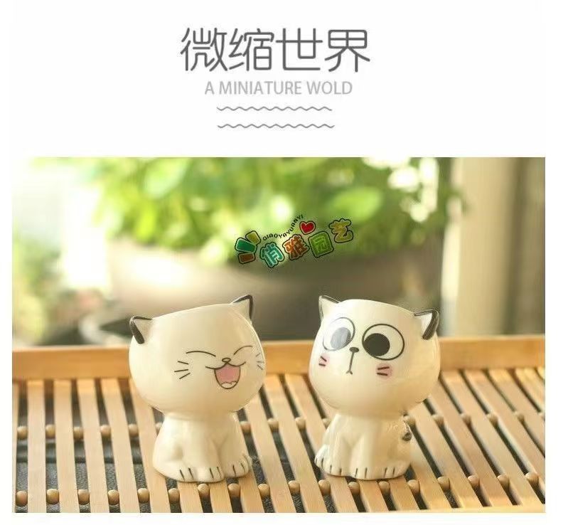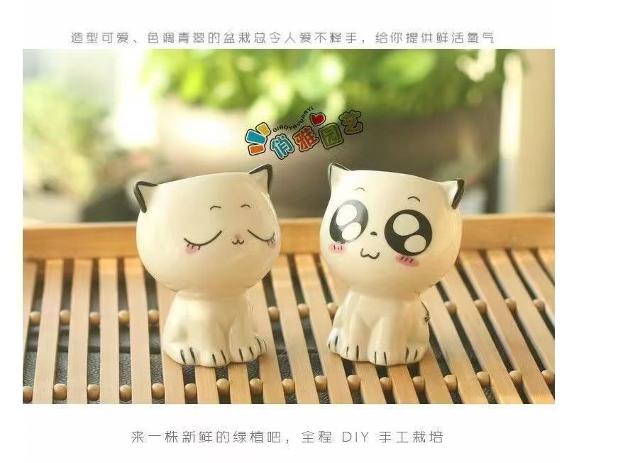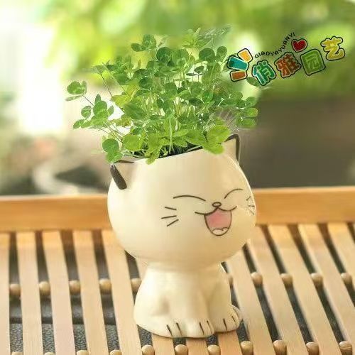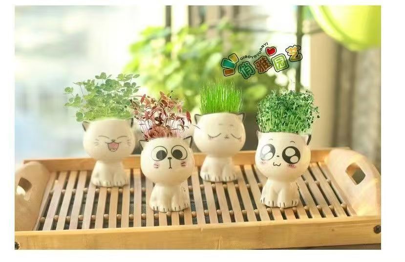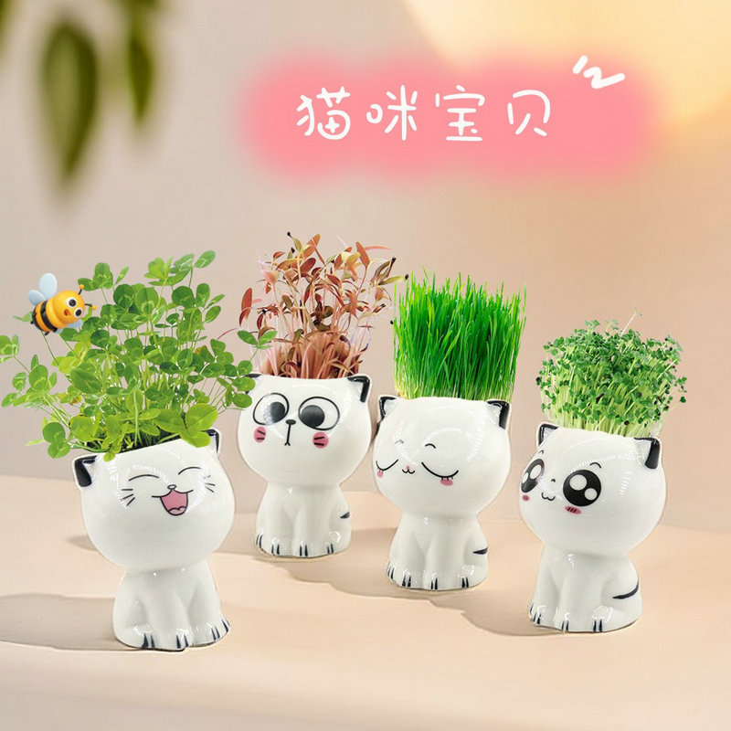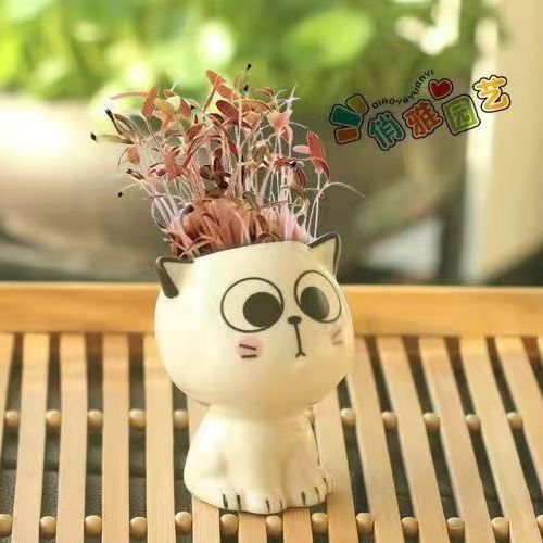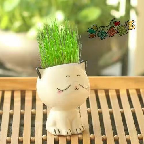 Керамическая кукла с длинной травяной головой, мультяшный кот, продажа милых поделок с выражением кошки, растения в горшках, офисные маленькие зеленые растения