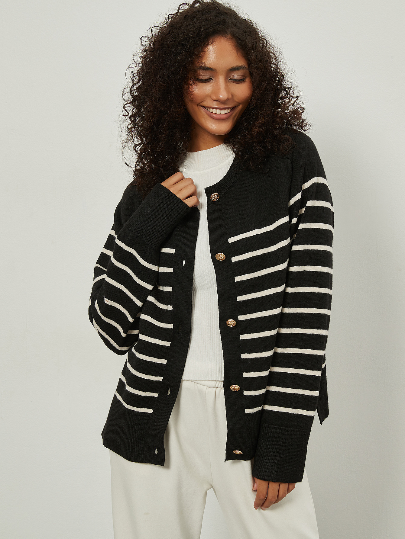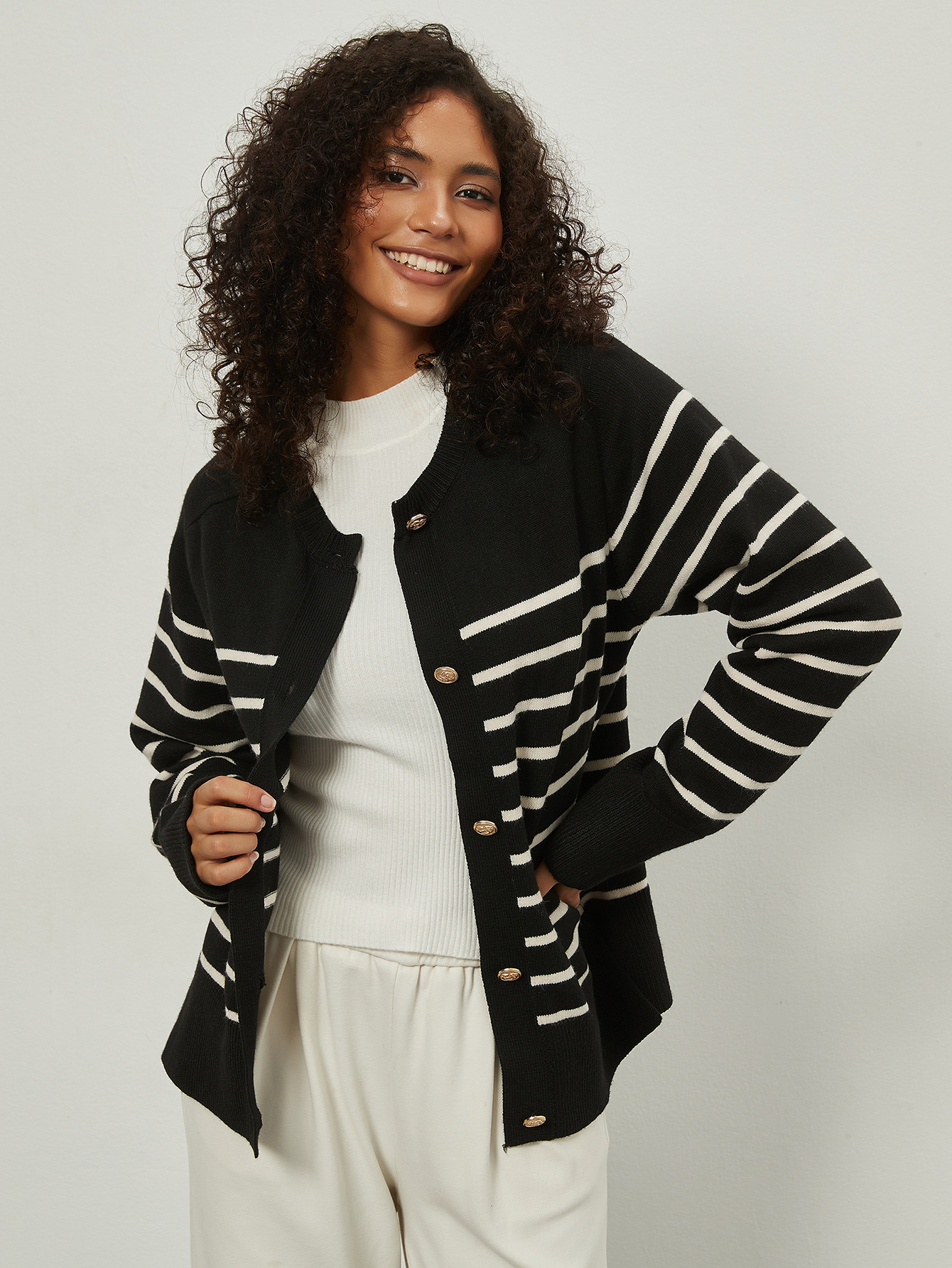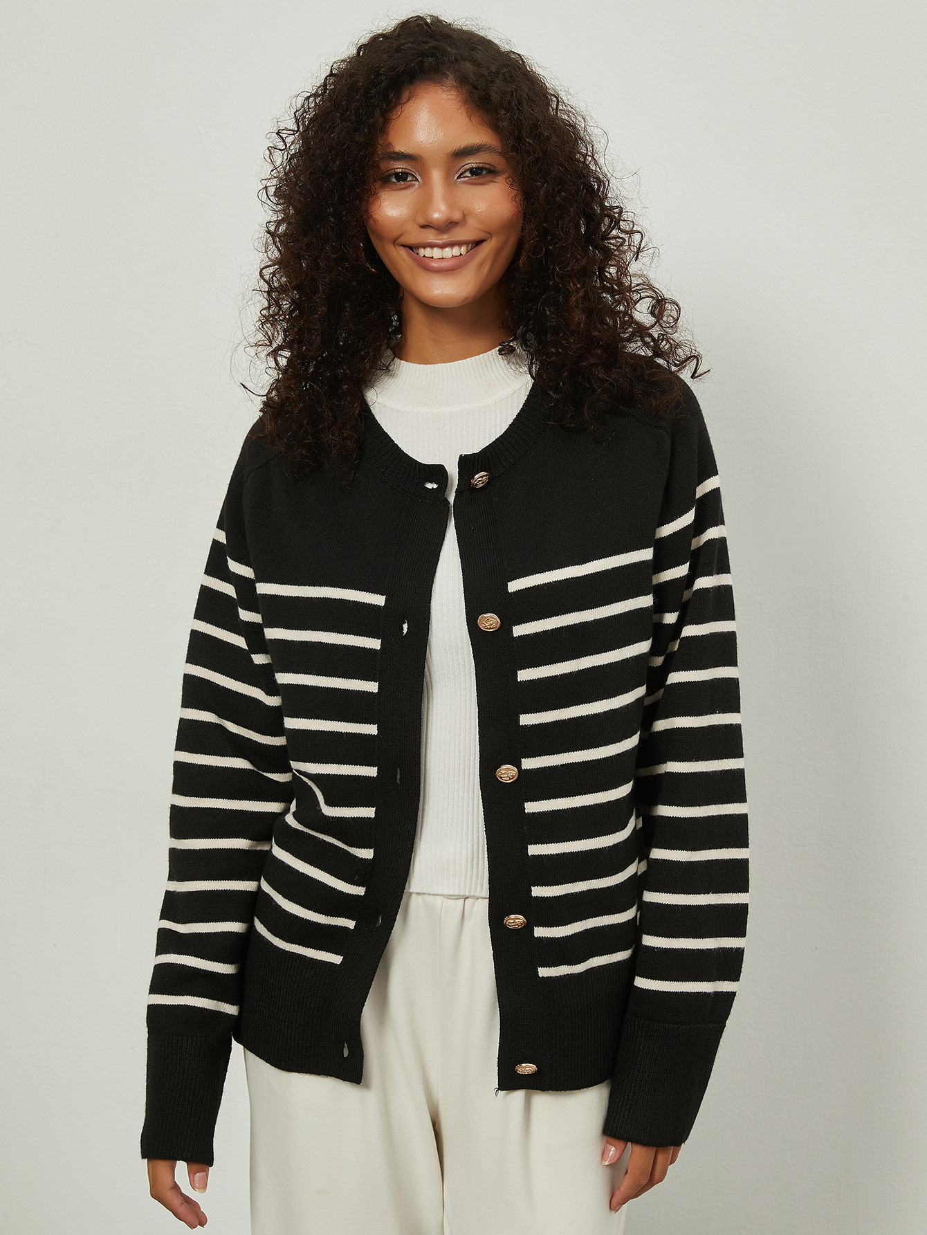 Amazon трансграничная женская одежда оптом европейский и американский стиль моды свободный круглый воротник с золотыми пуговицами в полоску