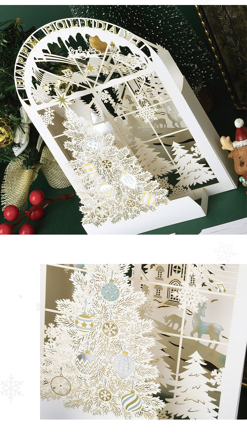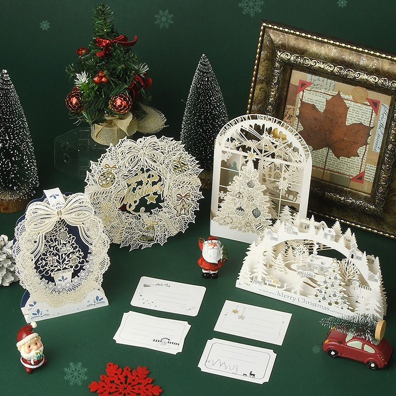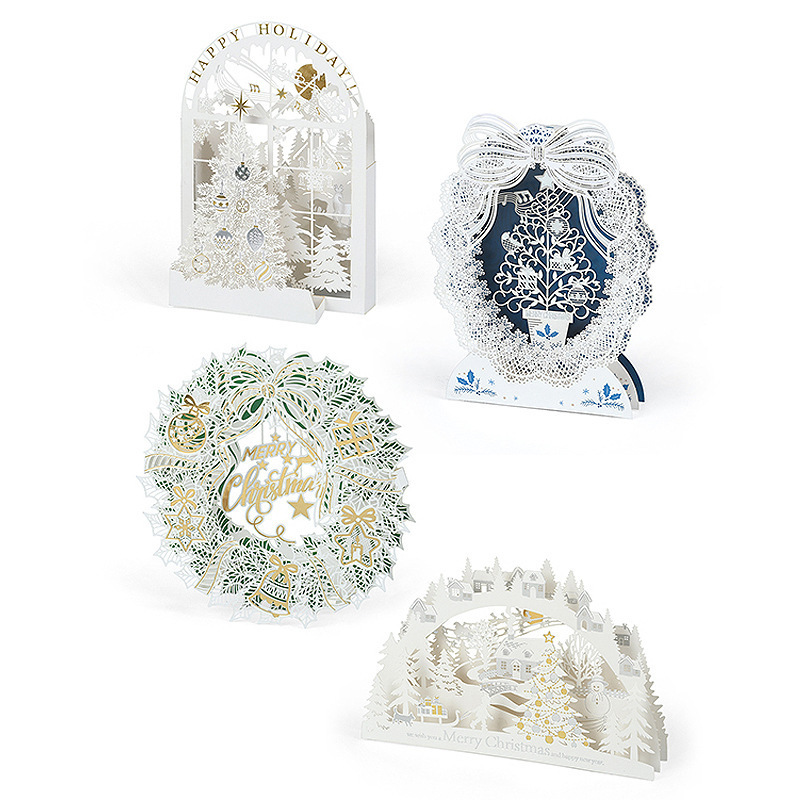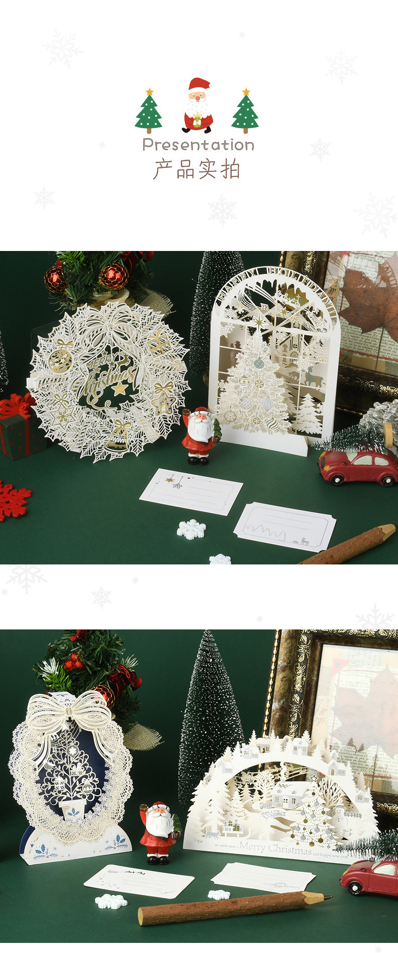 Рождественская объемная декоративная открытка-Рождественская елка А0251; Кружевная елка А0252; Зеленый рождественский венок A0253; Серебряный рождественский город А0254