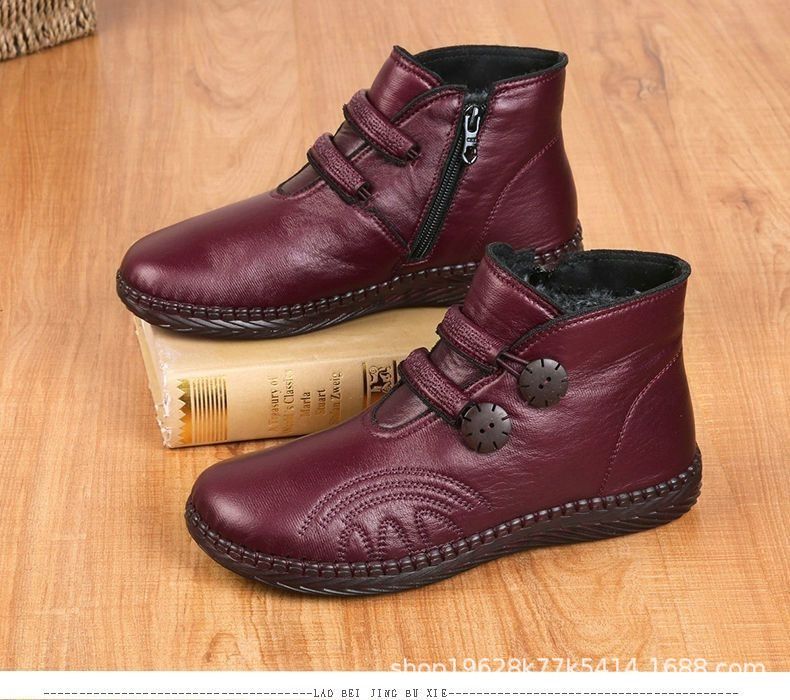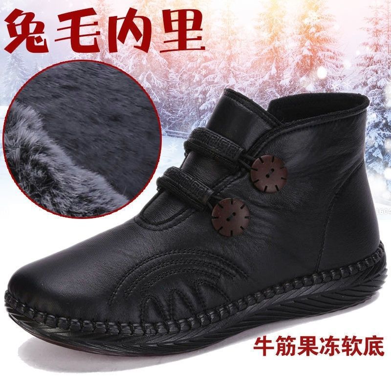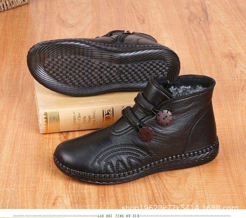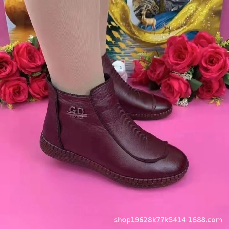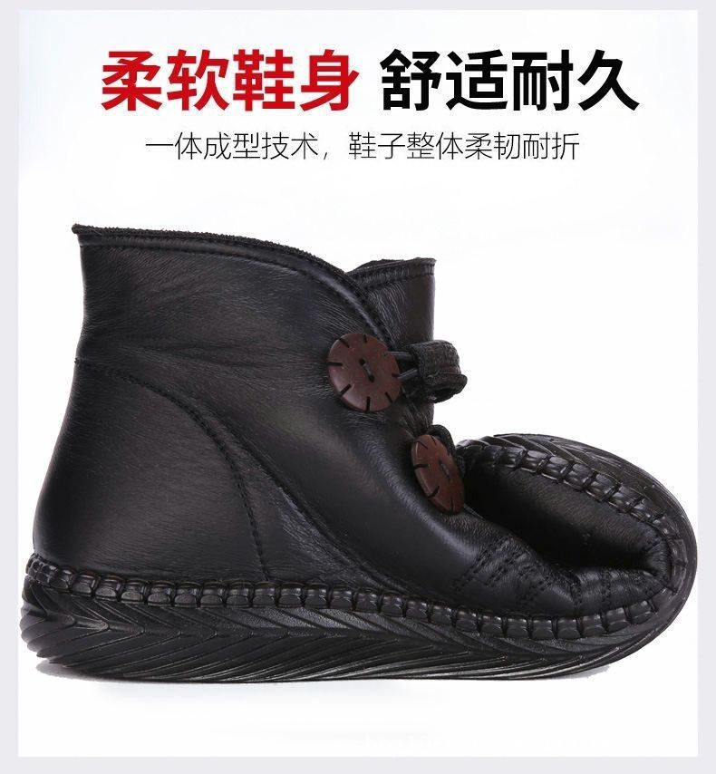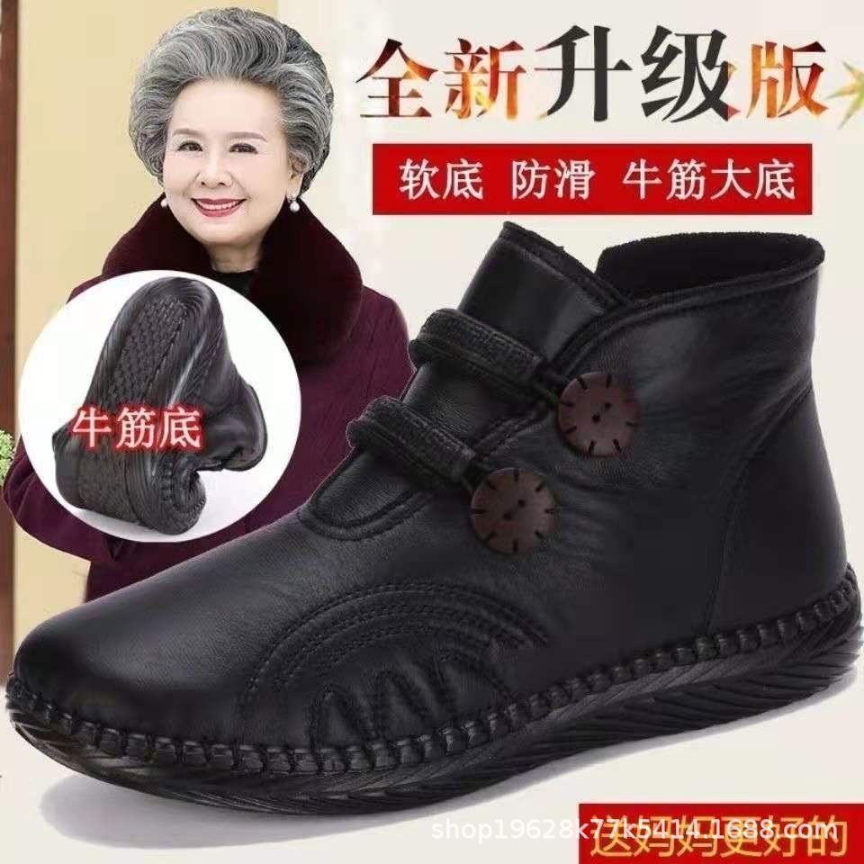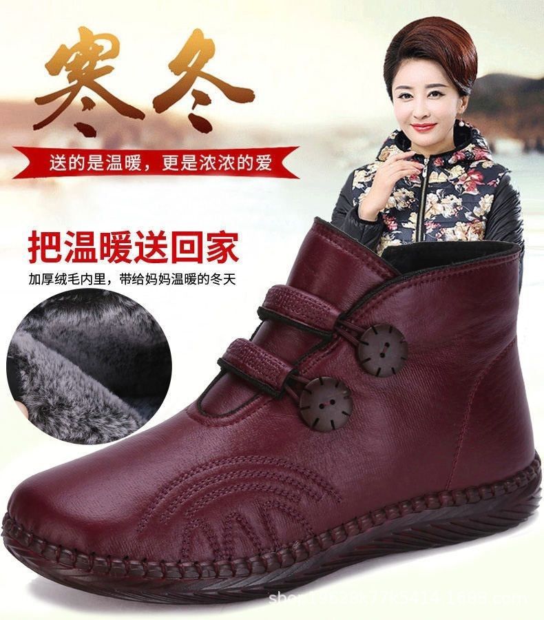 Зимние кожаные сапоги женские хлопчатобумажные туфли плюс бархат утолщенный теплая мама обувь плоская подошва противоскользящая средняя пожилая бабушка хлопчатобумажные сапоги короткие сапоги женщины