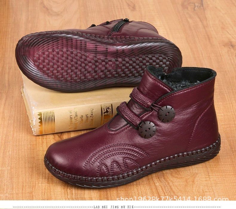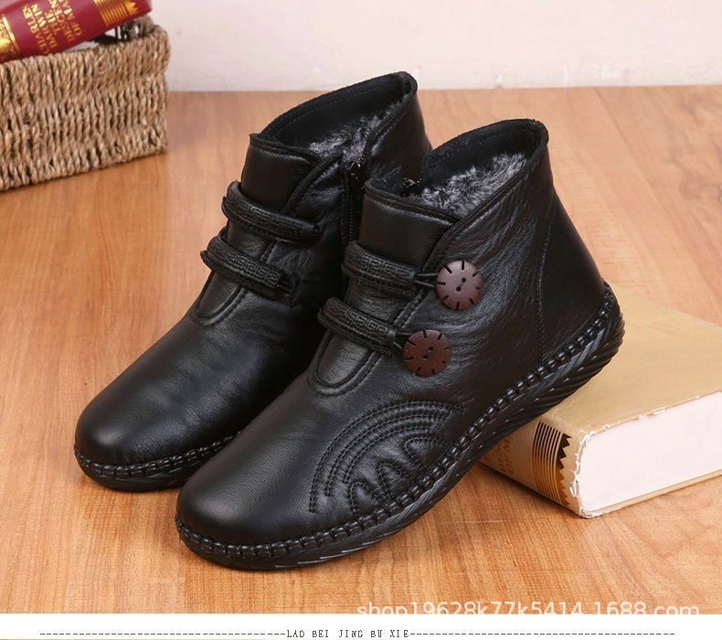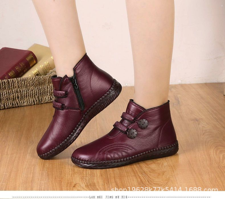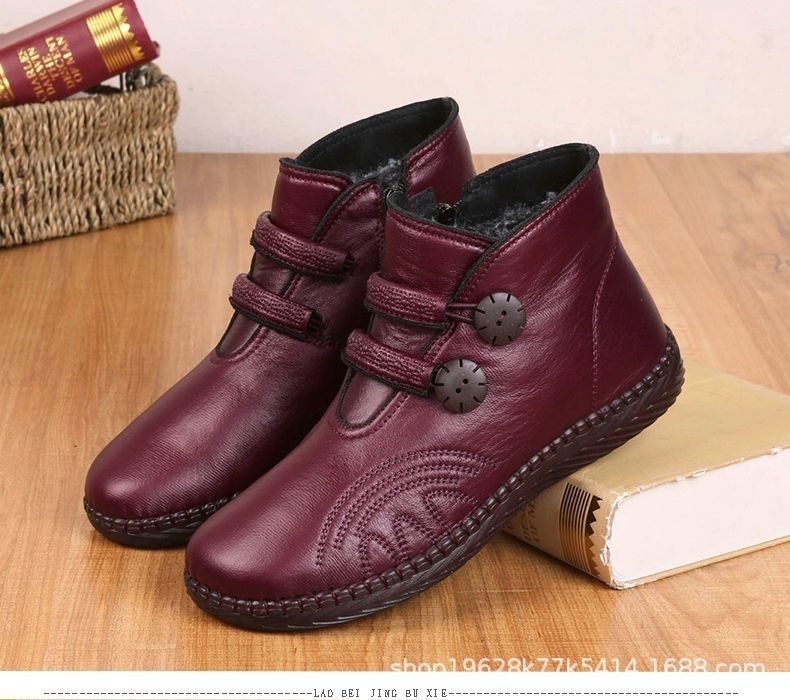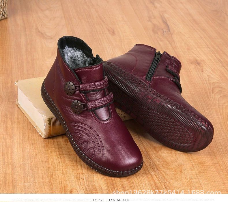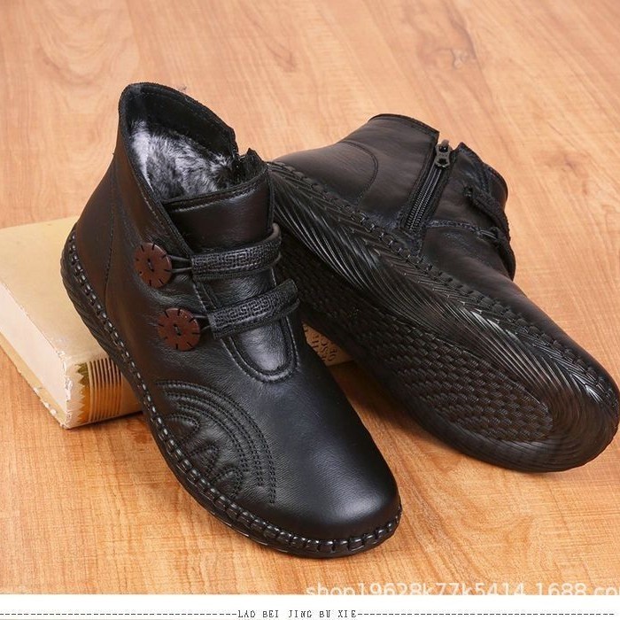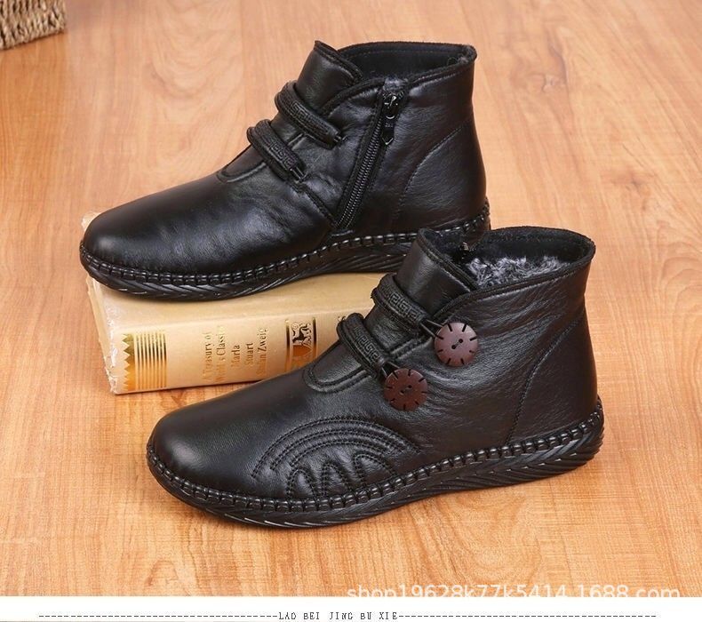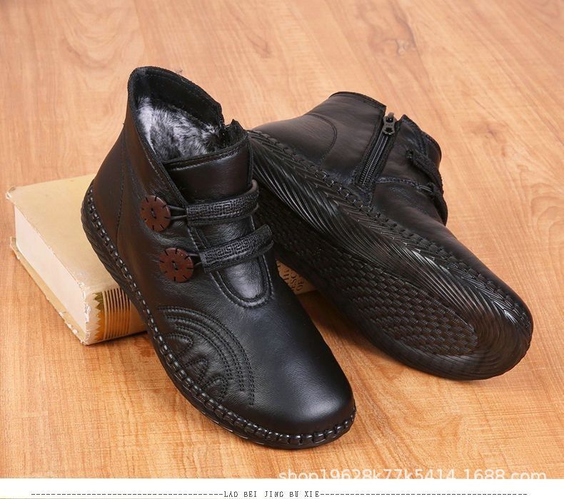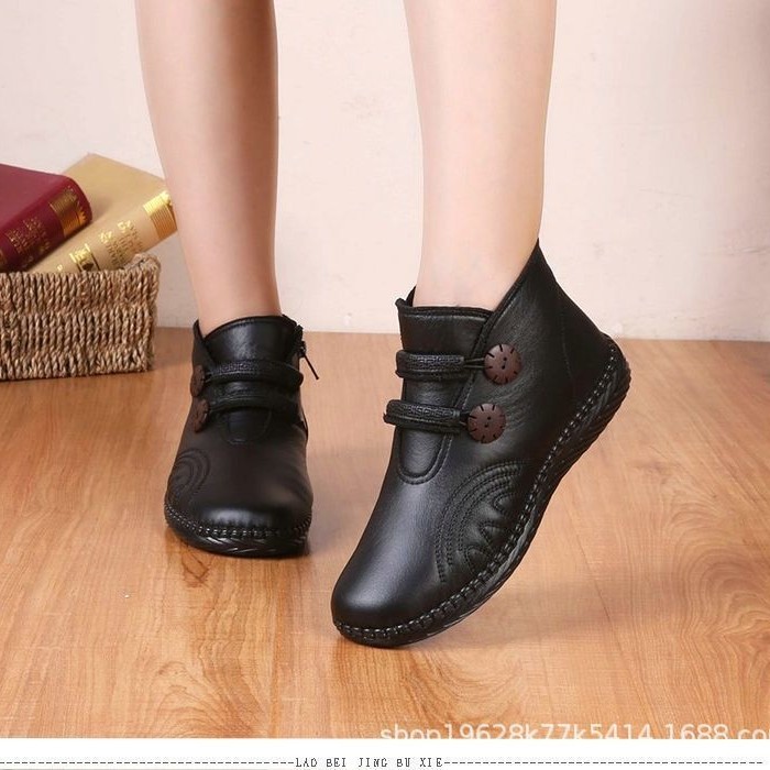 Зимние кожаные сапоги женские хлопчатобумажные туфли плюс бархат утолщенный теплая мама обувь плоская подошва противоскользящая средняя пожилая бабушка хлопчатобумажные сапоги короткие сапоги женщины
