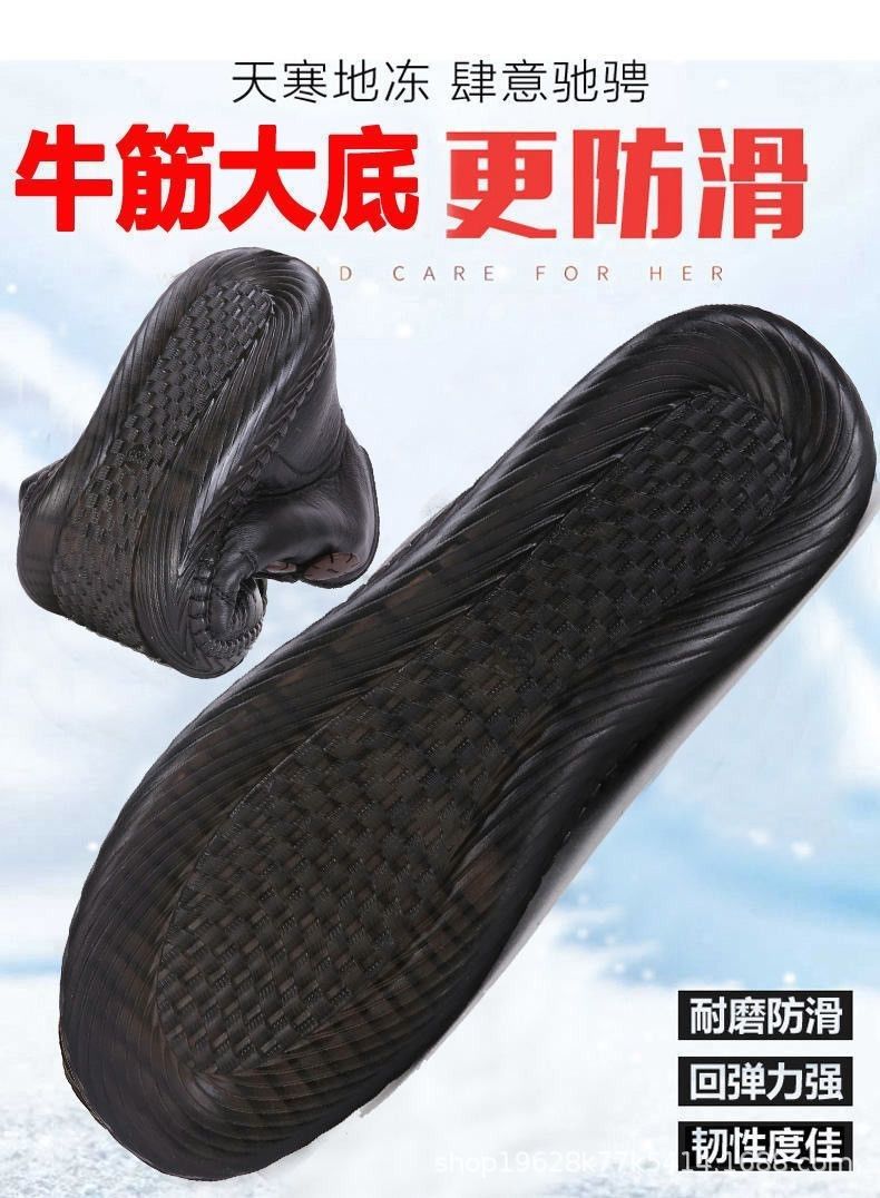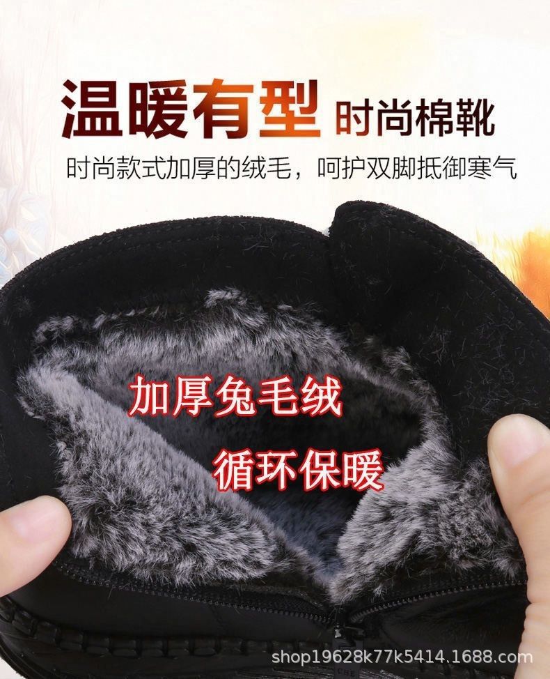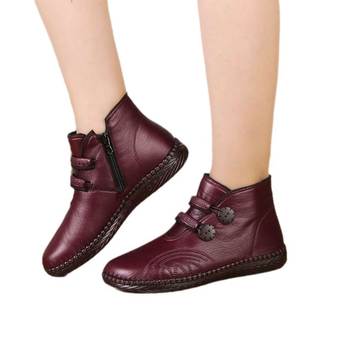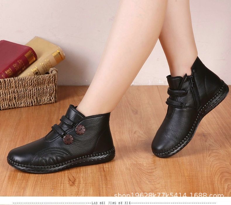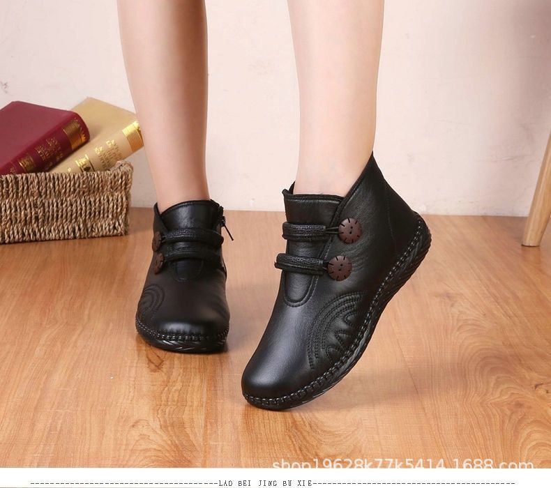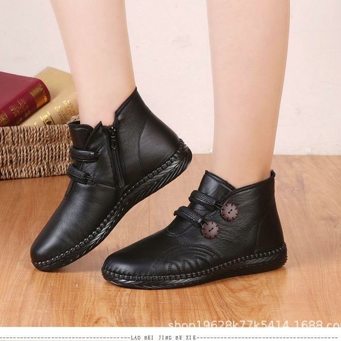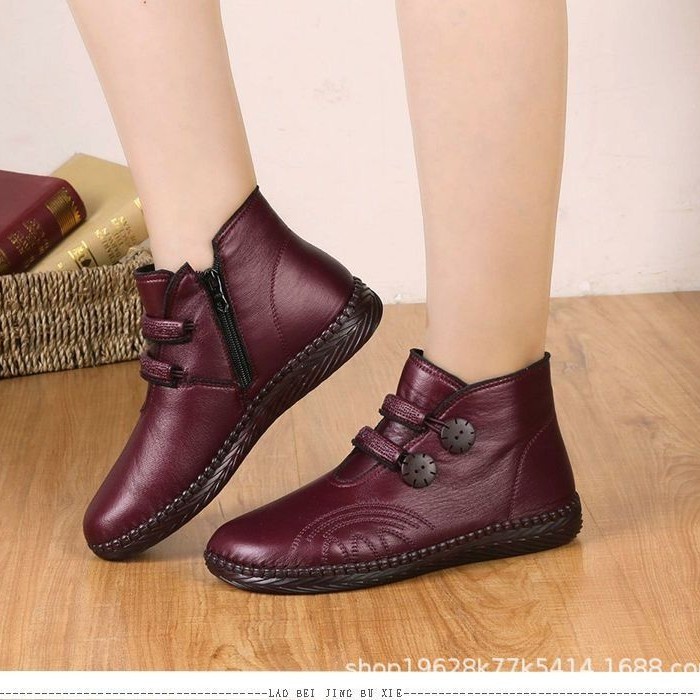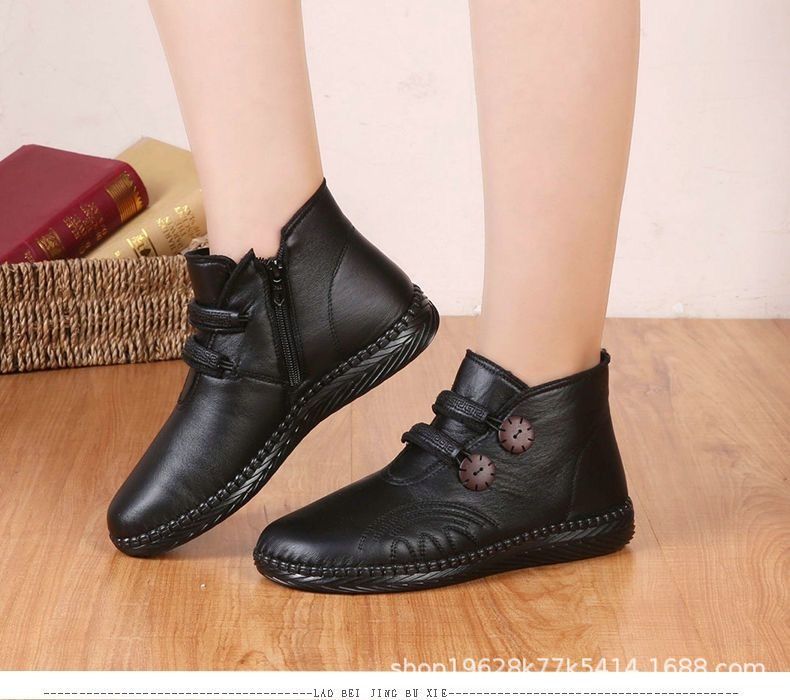 Зимние кожаные сапоги женские хлопчатобумажные туфли плюс бархат утолщенный теплая мама обувь плоская подошва противоскользящая средняя пожилая бабушка хлопчатобумажные сапоги короткие сапоги женщины