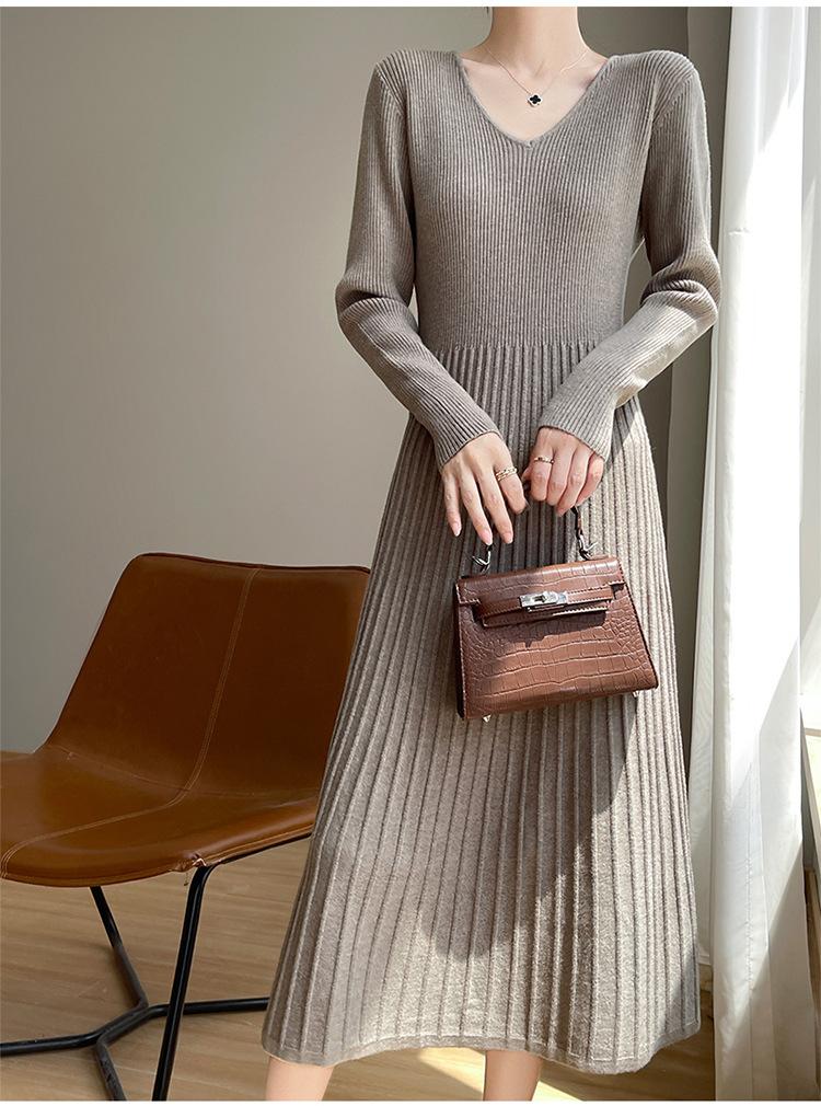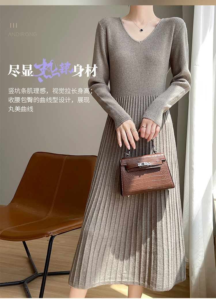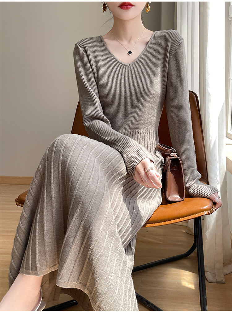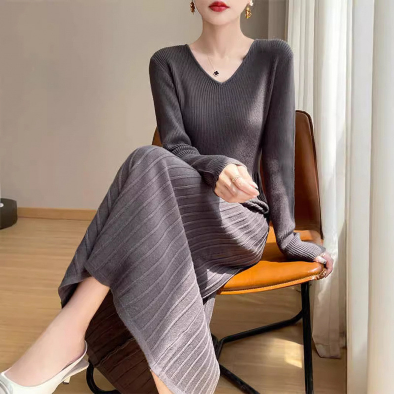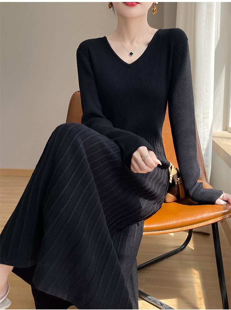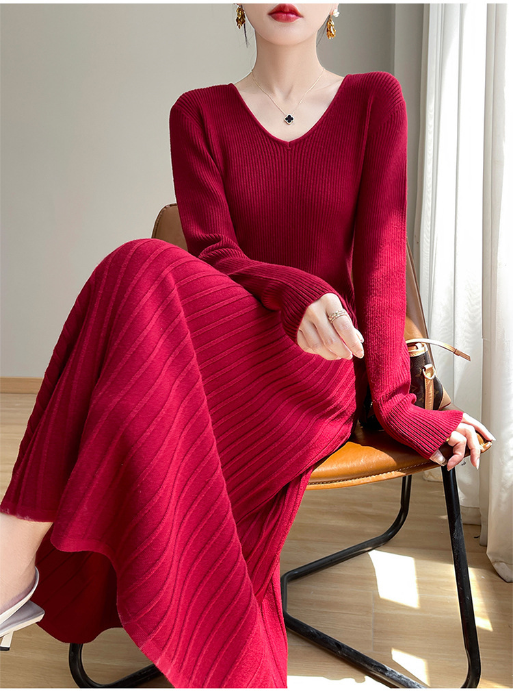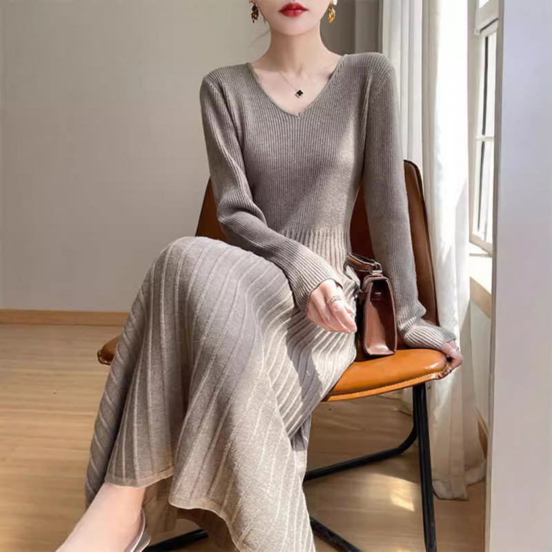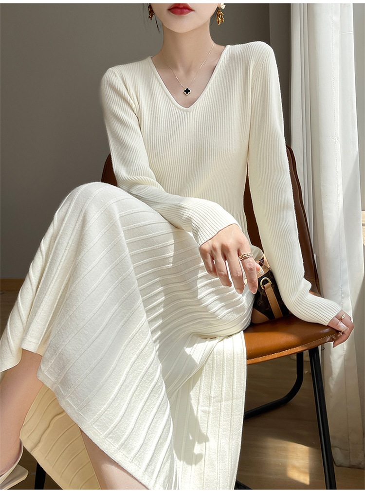 Леди с V-образным вырезом длинное платье осенью и зимой длинная трикотажная нижняя юбка пальто с темпераментом