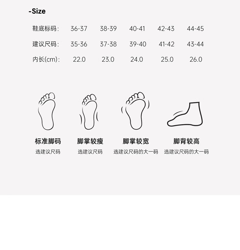 36-37 (рекомендуется для 35-36 футов); 38-39 (рекомендуется для 37-38 футов); 40-41 (рекомендуется на ноги 39-40); 42-43 (рекомендуется для стопы 41-42); 44-45 (рекомендуется для ног 43-44)