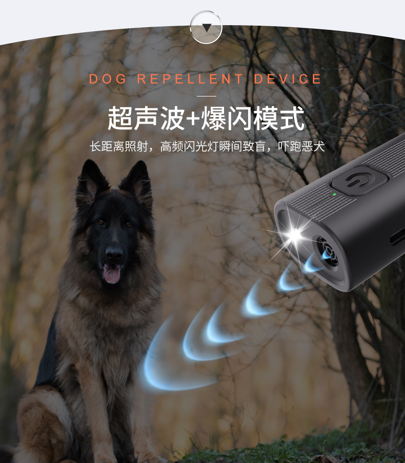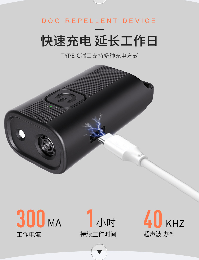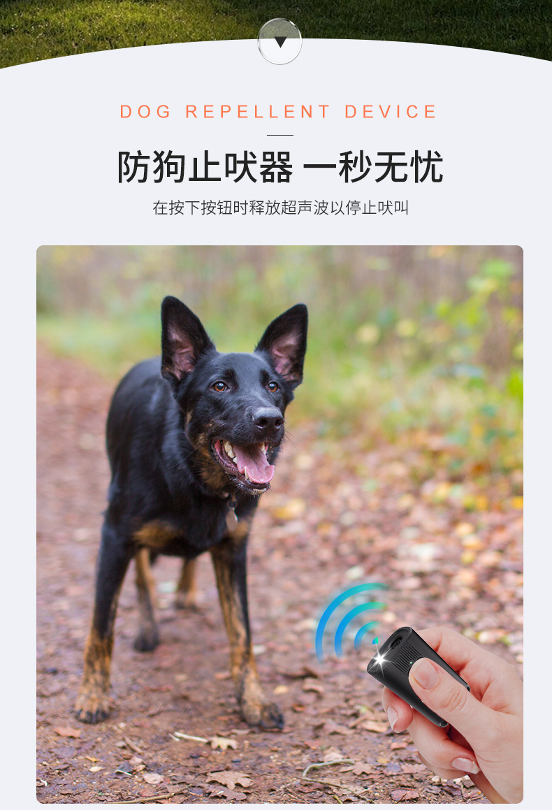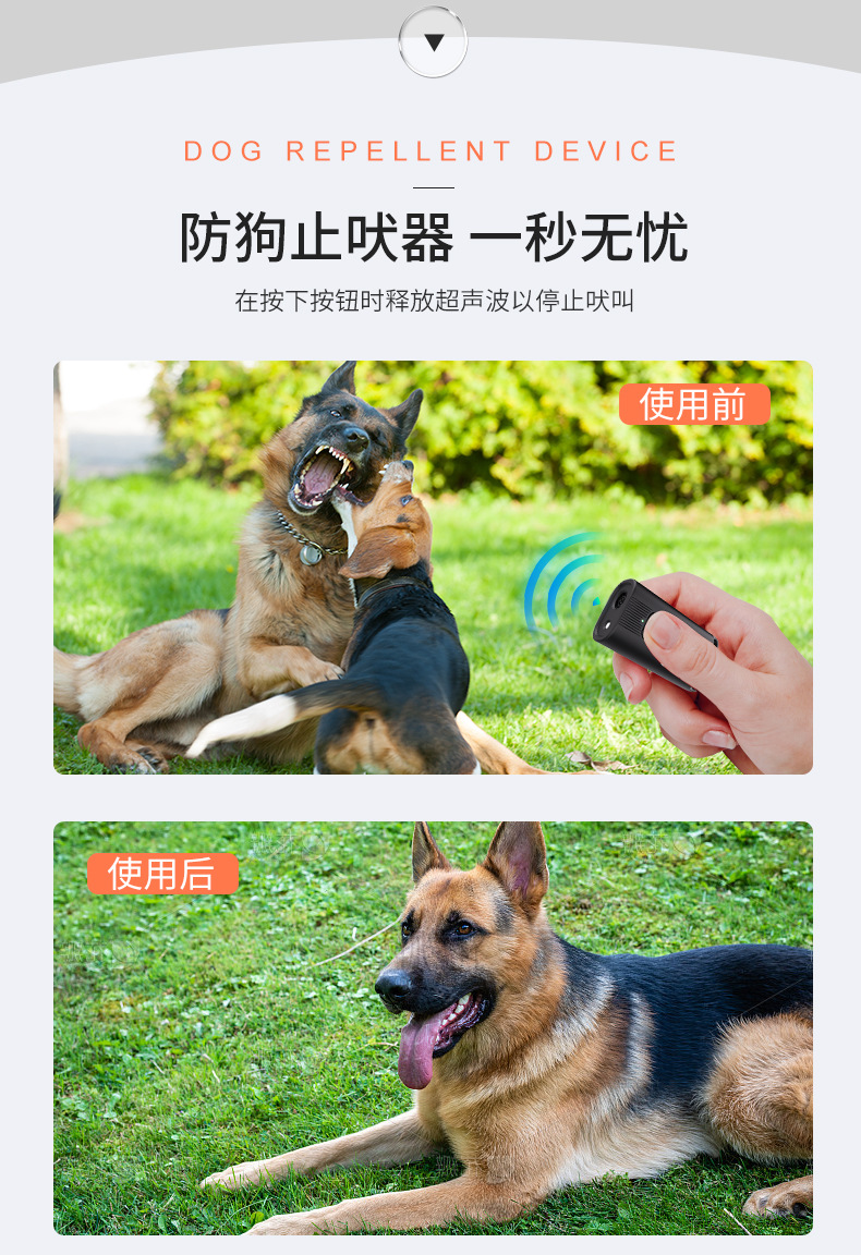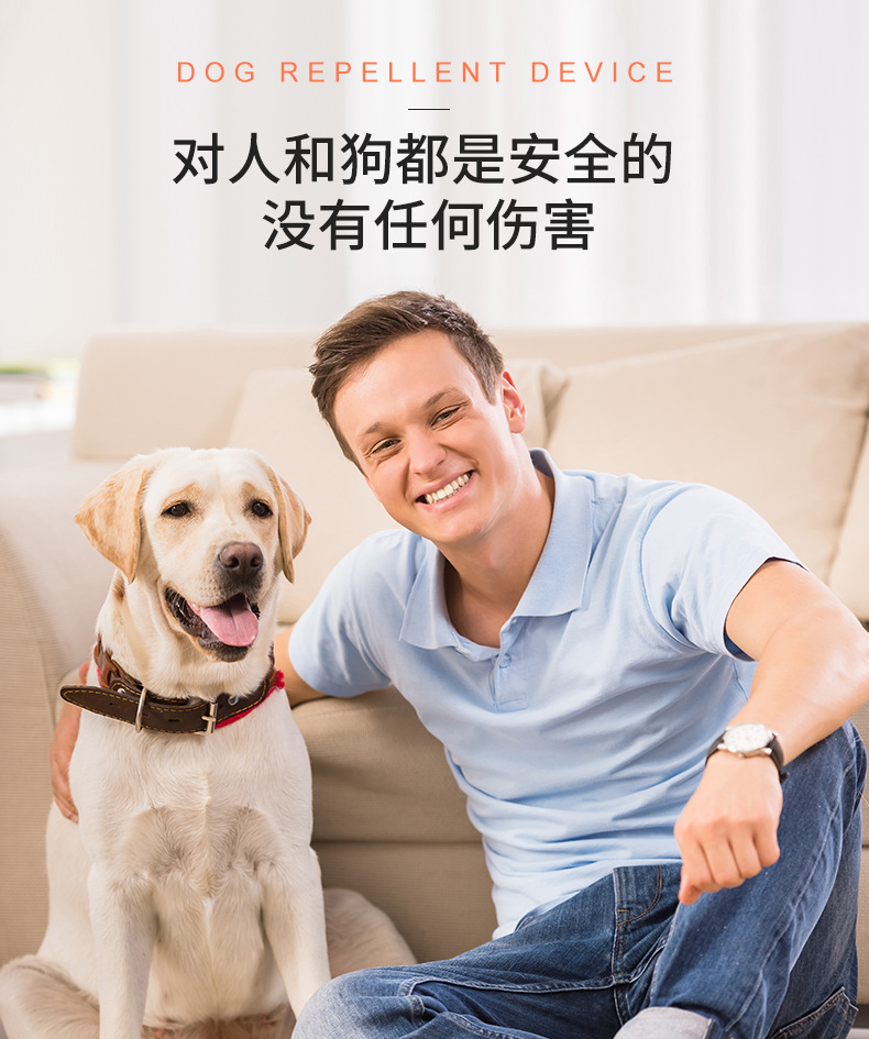 说明:1.本产品使用超声波止吠技术。产品会在侦测狗叫声后自动发射超声波,这种声音只能被狗听到,人类是无法听到的。狗狗会被突然出现的高频声音所刺激惊吓,正常情况下会停止吠叫。它会将吠叫与这种令它不适的声音联系起来,当重复多次后,狗狗会发现由于它的吠叫会给它带来不适,从而逐渐减少吠叫。这种止吠方法是安全有效的,为了防止狗对声音干扰产生免疫,在技术上进行多声波处理,便于设备可以持续对狗吠叫产生作用!