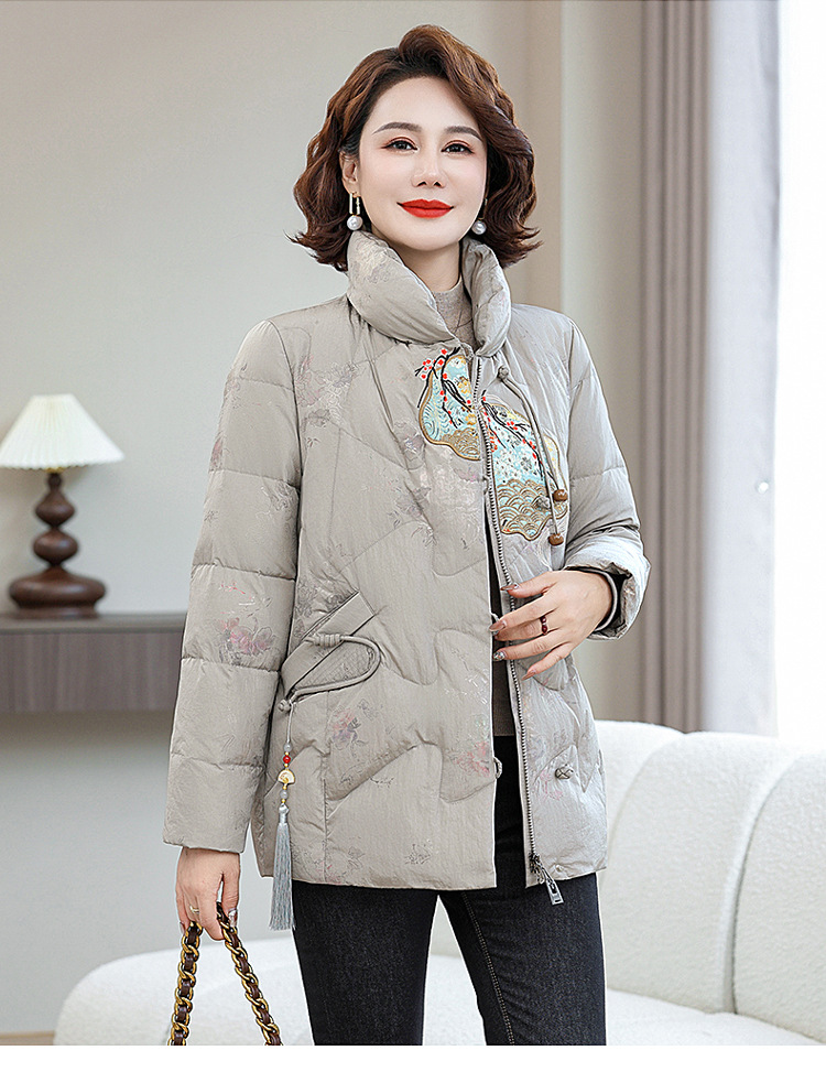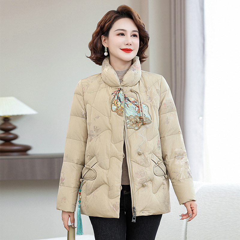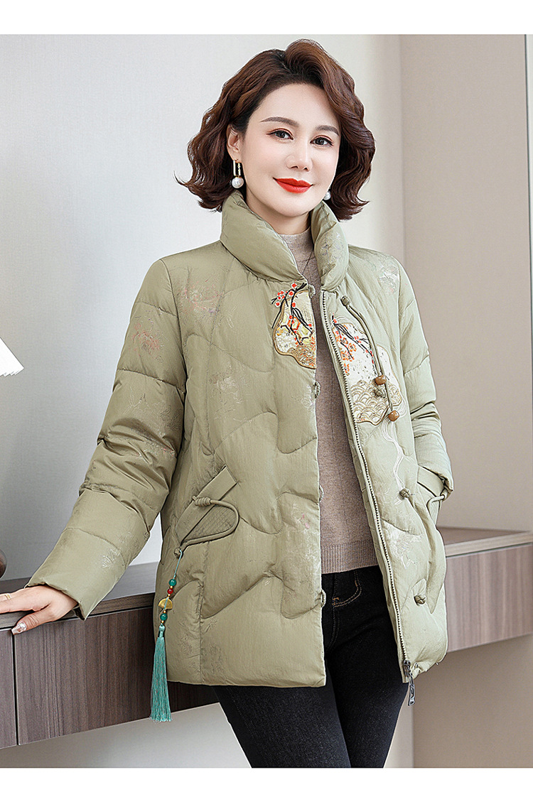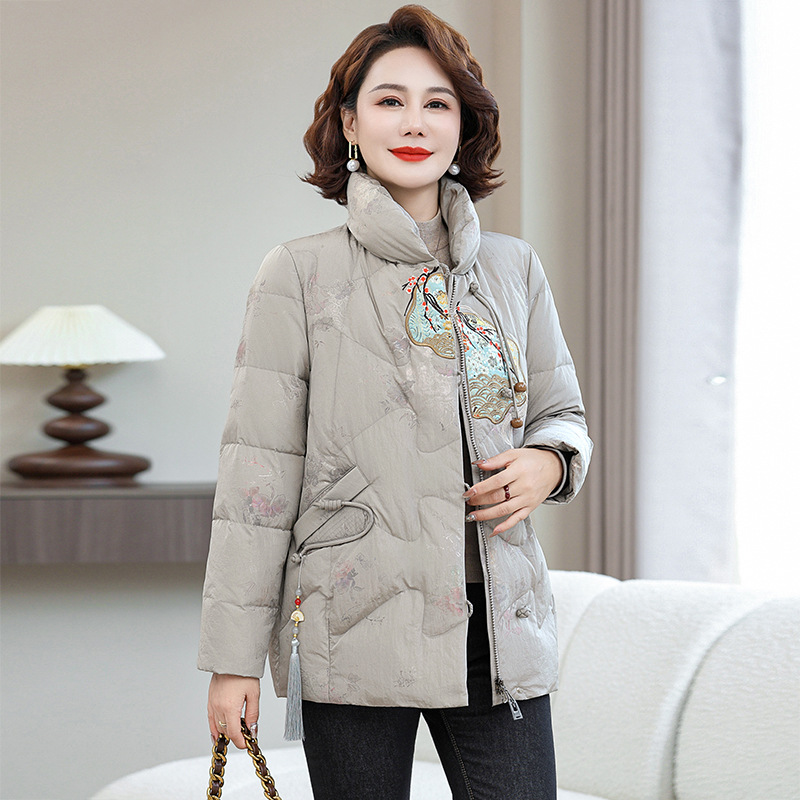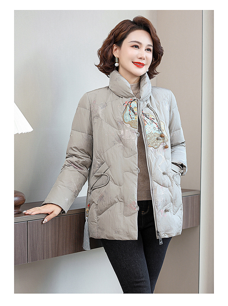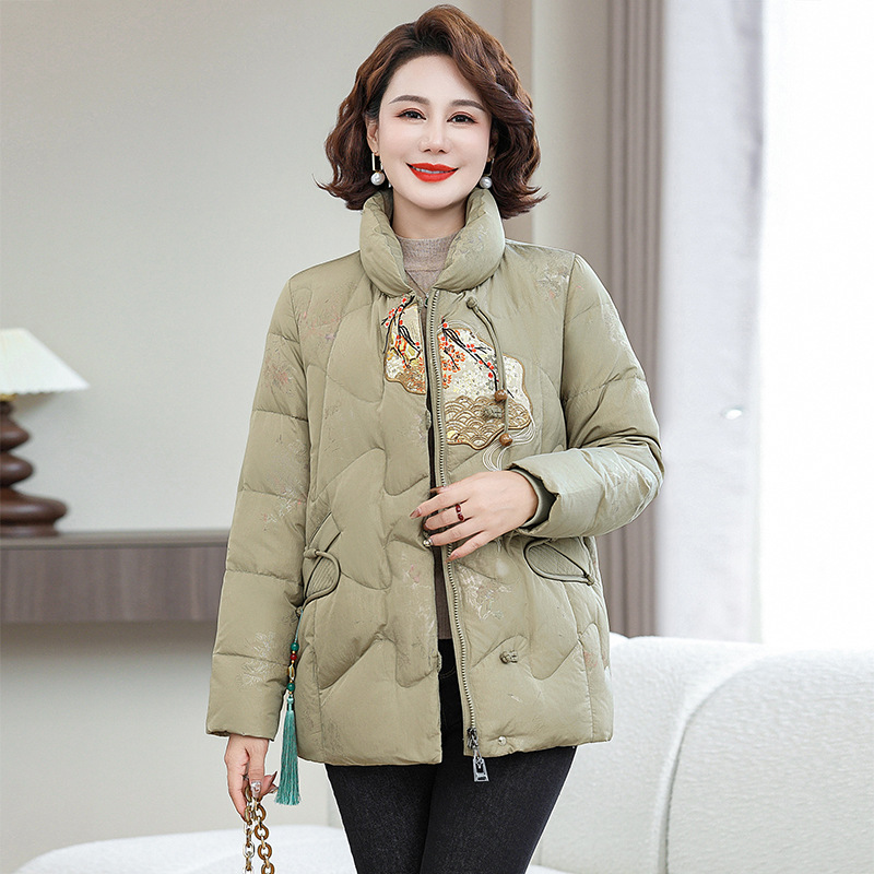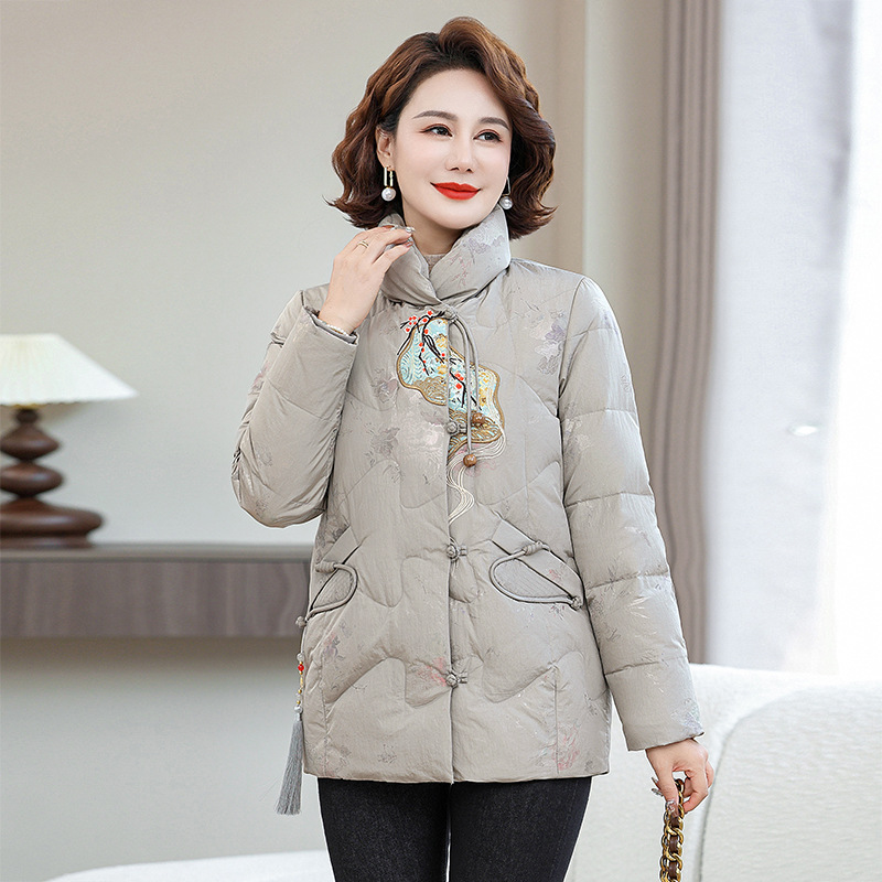 Зимняя новая мама платье короткая белая утка пуховик новый китайский стиль с вышивкой толстые хлопчатобумажные куртки среднего возраста женская куртка