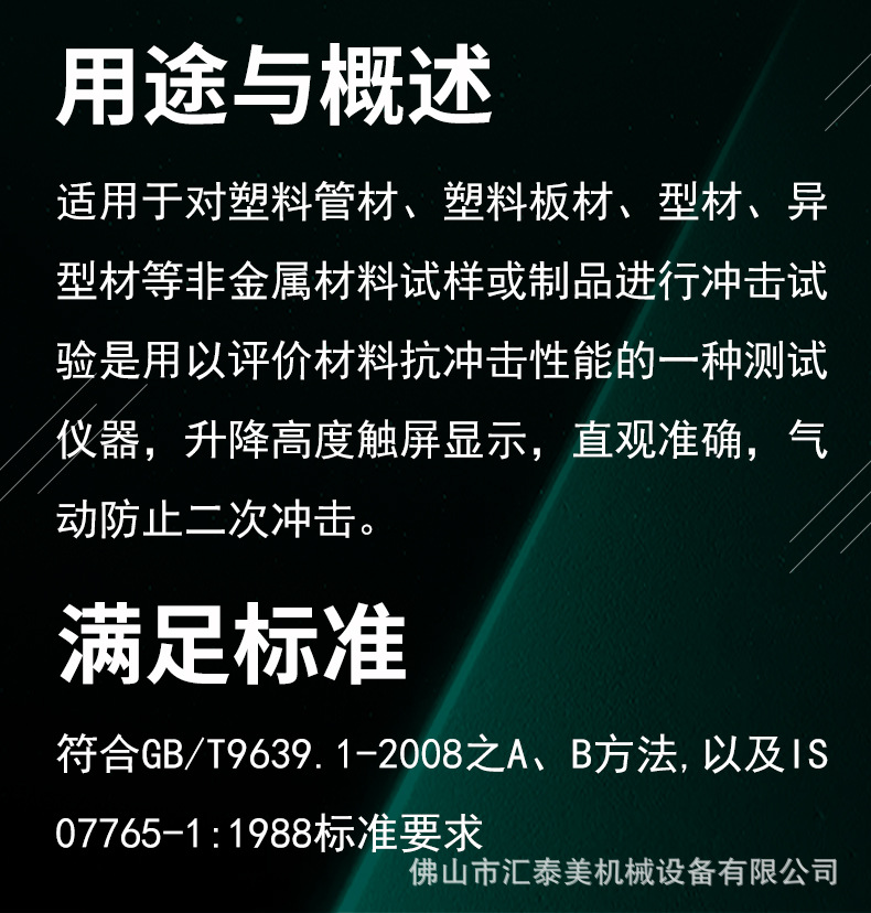 Он подходит для испытаний на удар образцов неметаллических материалов или изделий, таких как пластиковые трубы, стеклокерамика и т. д. Это метод, используемый для оценки ударопрочности материалов.