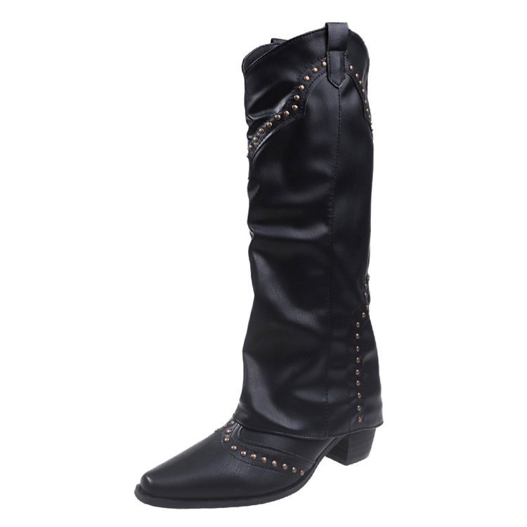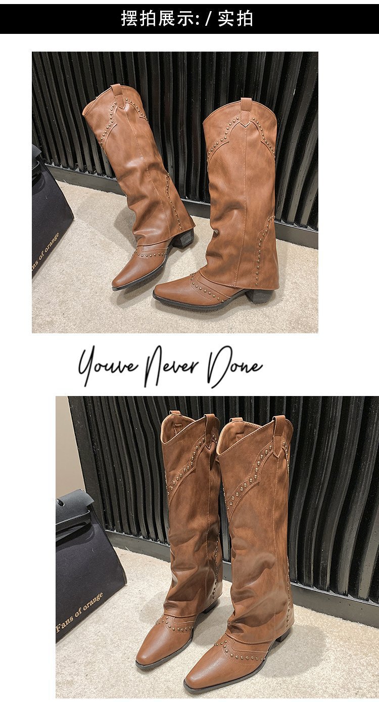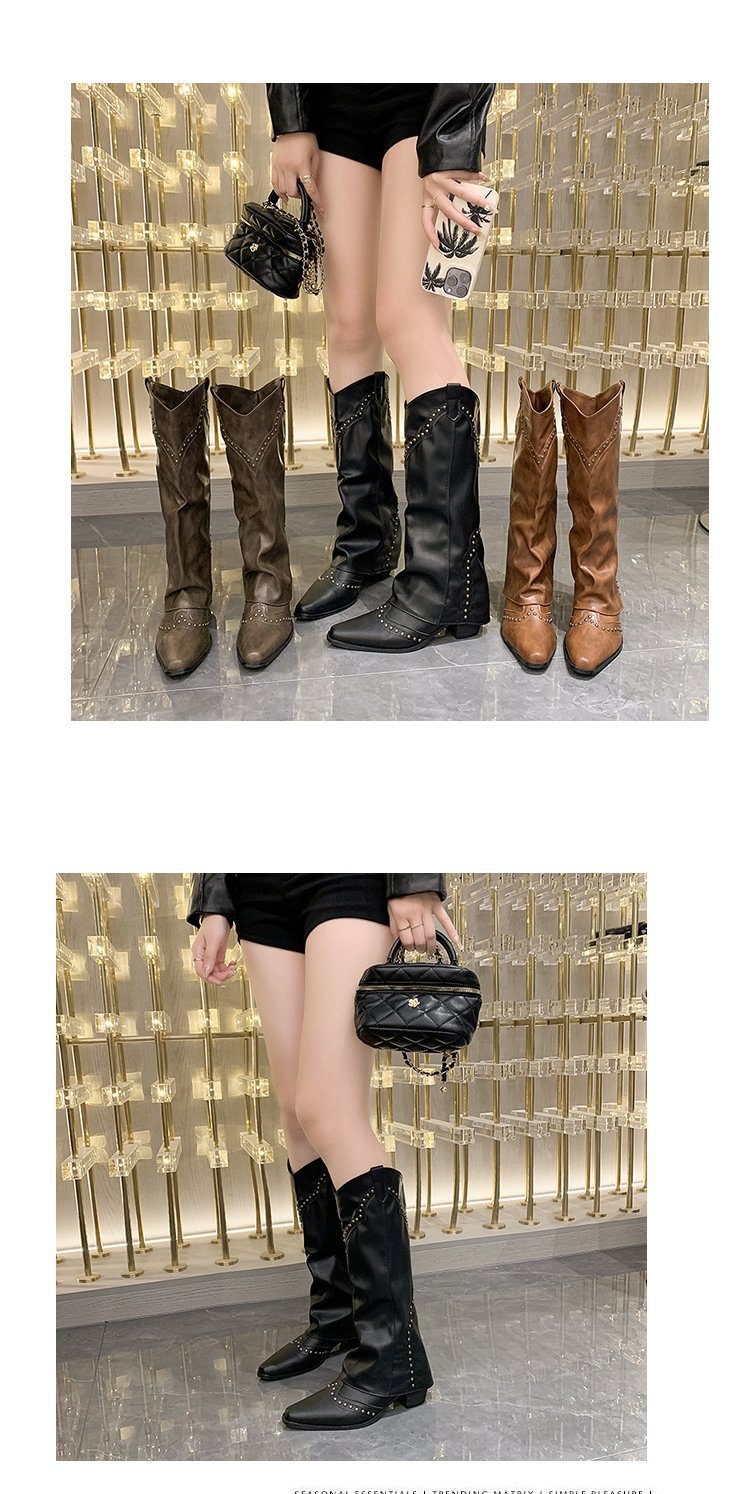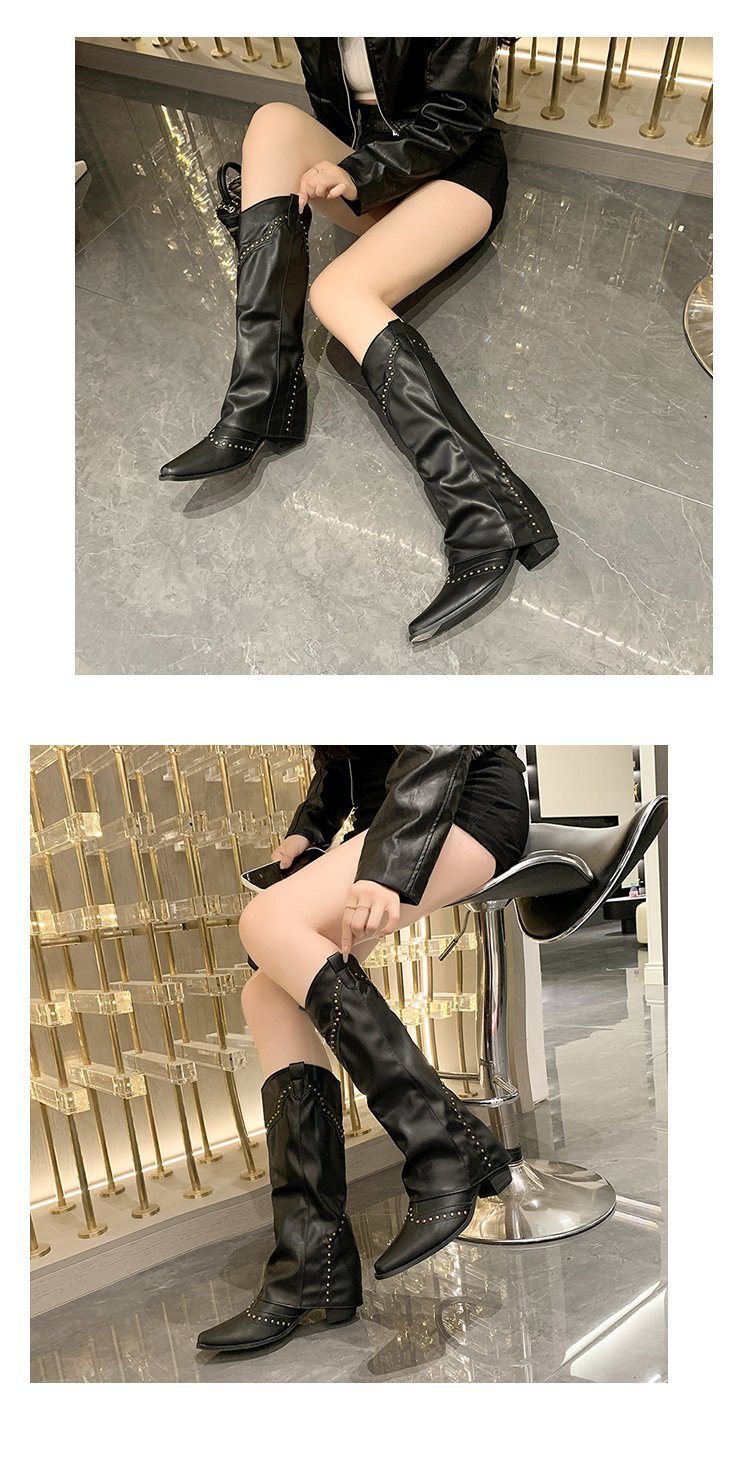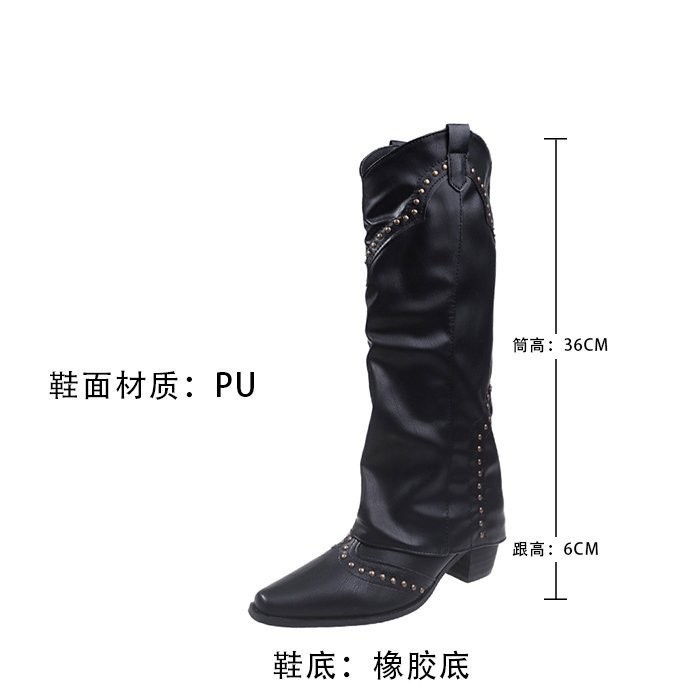 Заклепочные брюки сапоги на каблуках 2023 новые европейские и американские толстые каблуки с заостренной длинной трубкой индивидуальность Западный ковбой рыцарь сапоги женщины
