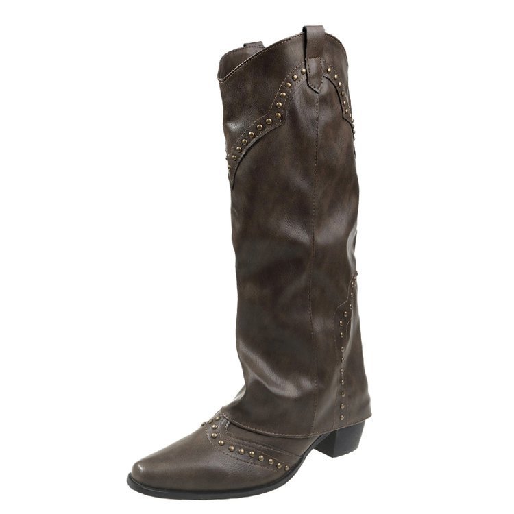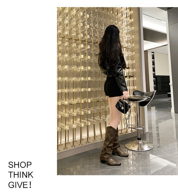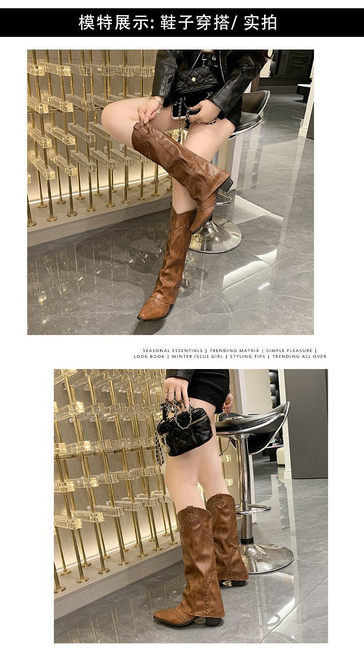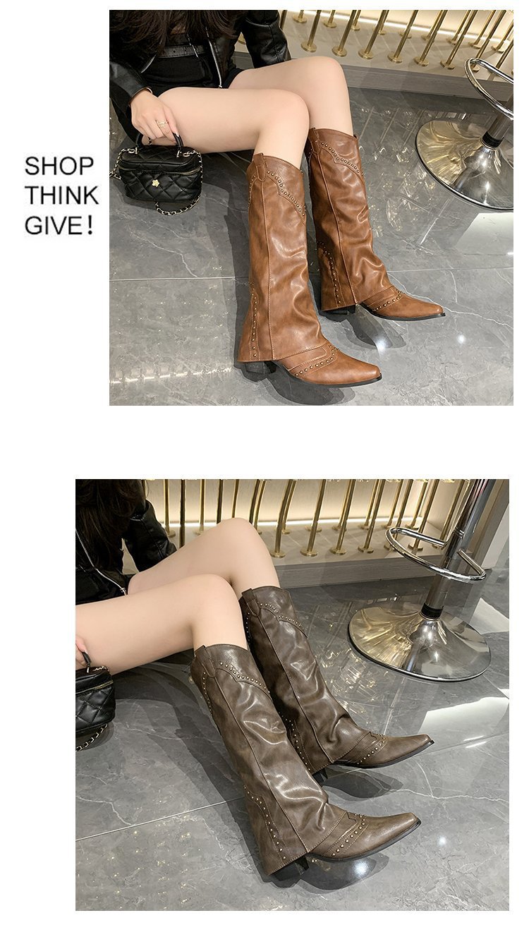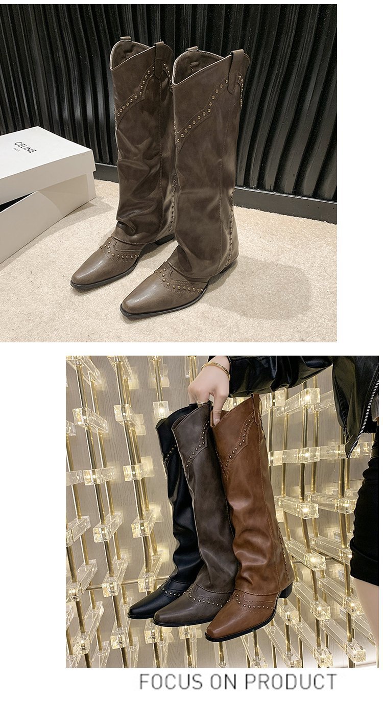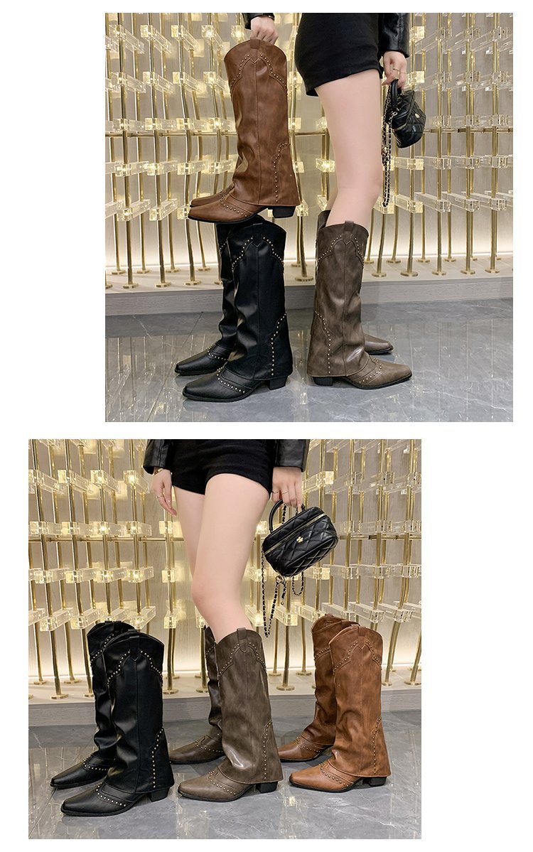 Заклепочные брюки сапоги на каблуках 2023 новые европейские и американские толстые каблуки с заостренной длинной трубкой индивидуальность Западный ковбой рыцарь сапоги женщины