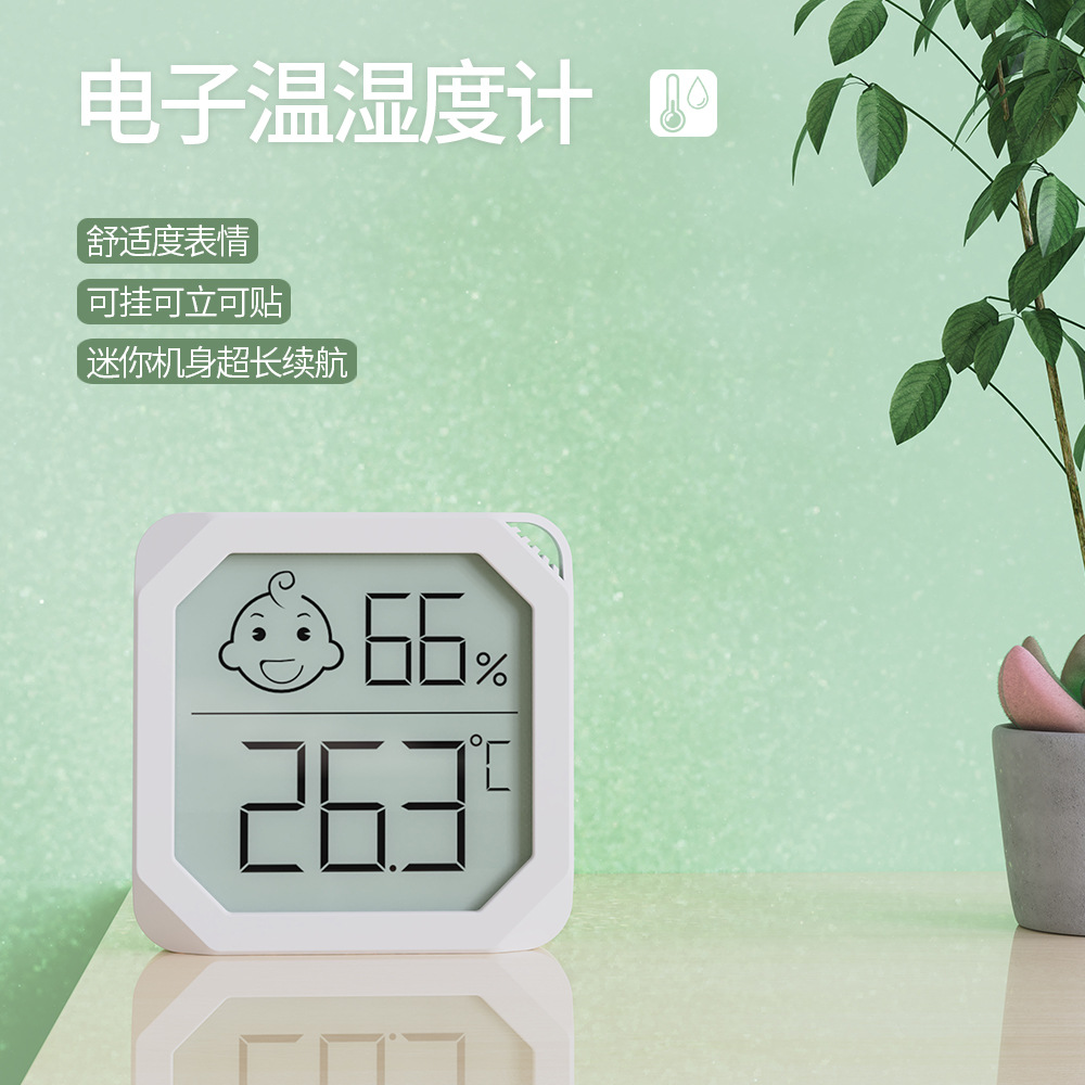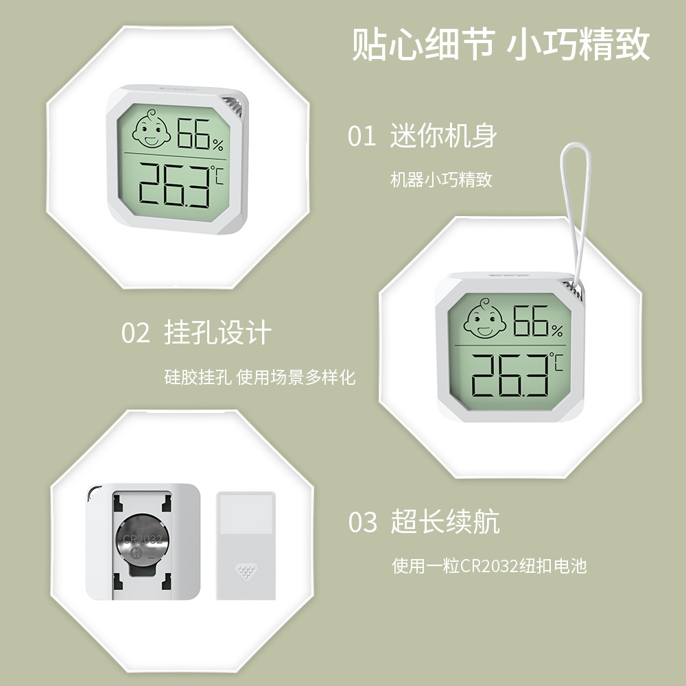 11.彩盒内包含:温湿度计、电池、包装袋、挂绳、双面胶、说明书。