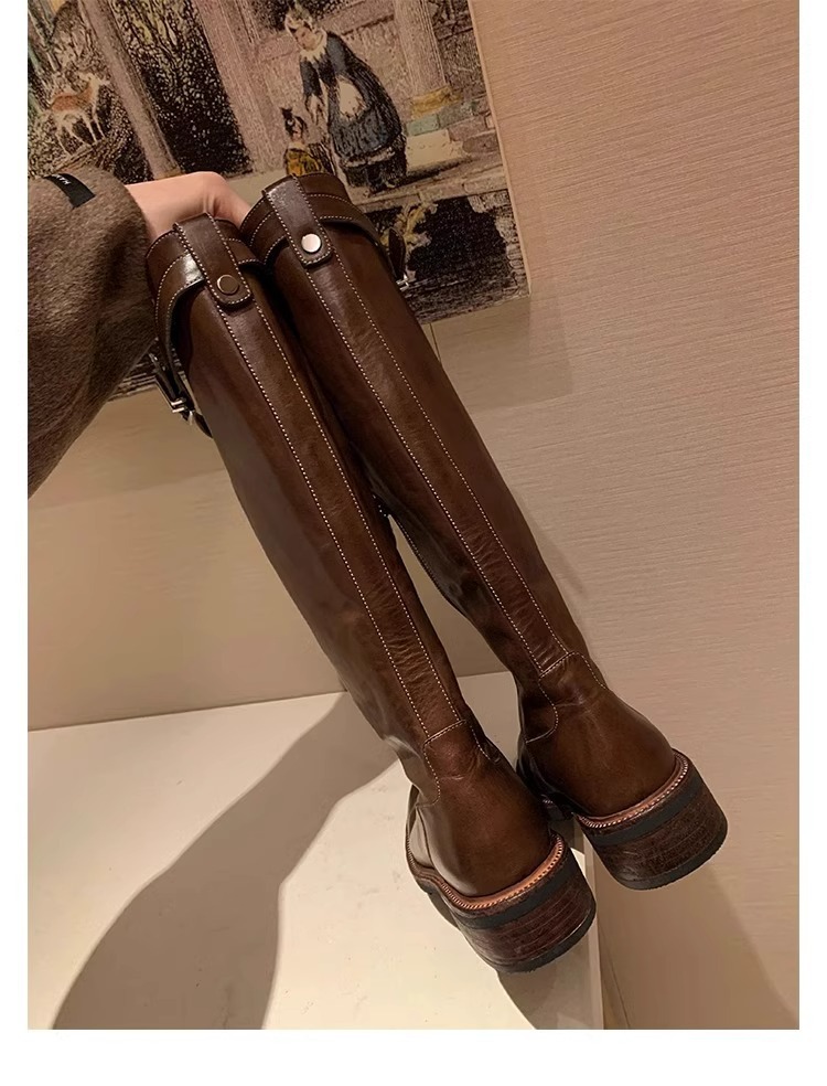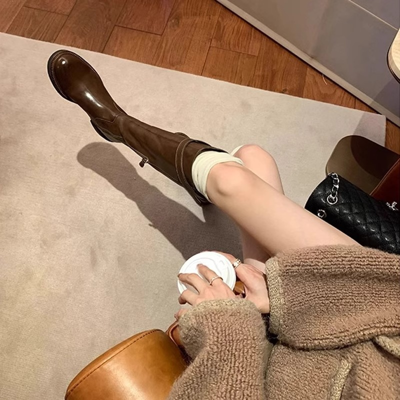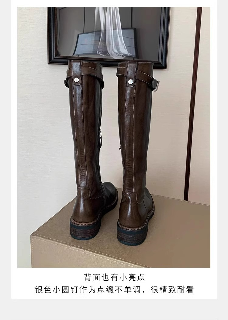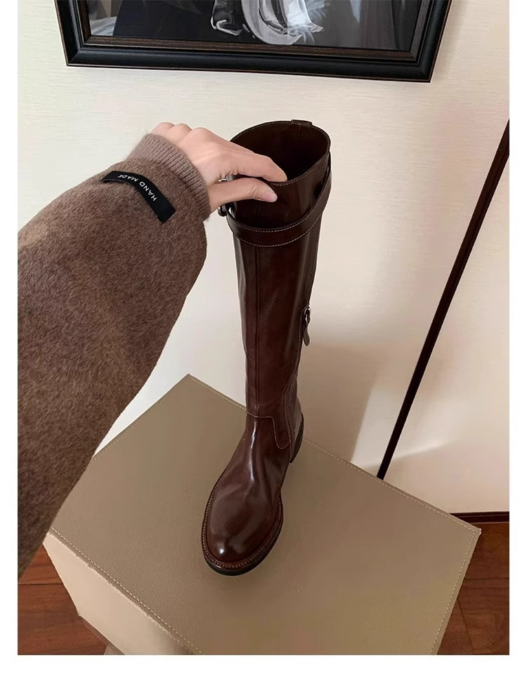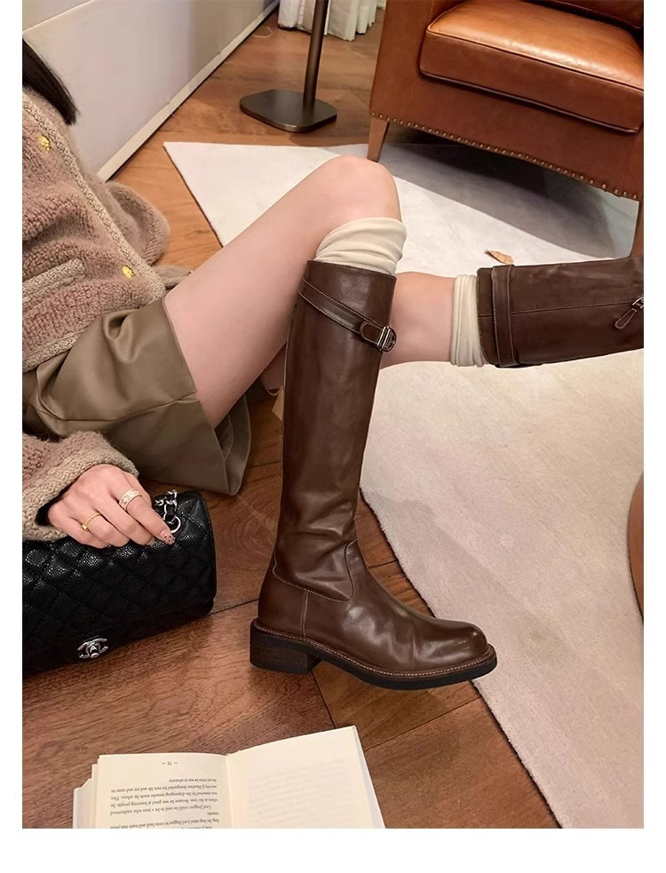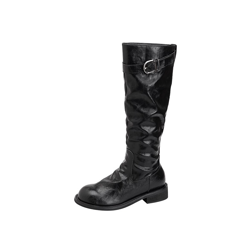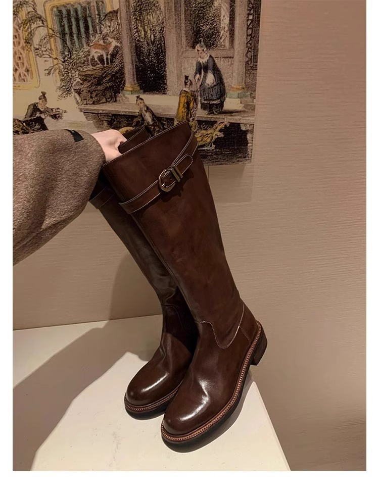 Ботинки для верховой езды в стиле Grape Mom, модель 2025 года, ретро, на толстой подошве, средней высоты, большие размеры, из мягкой кожи с плиссировкой, высокие сапоги для женщин.
