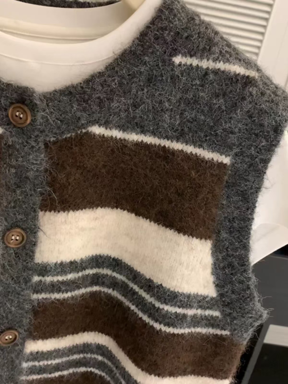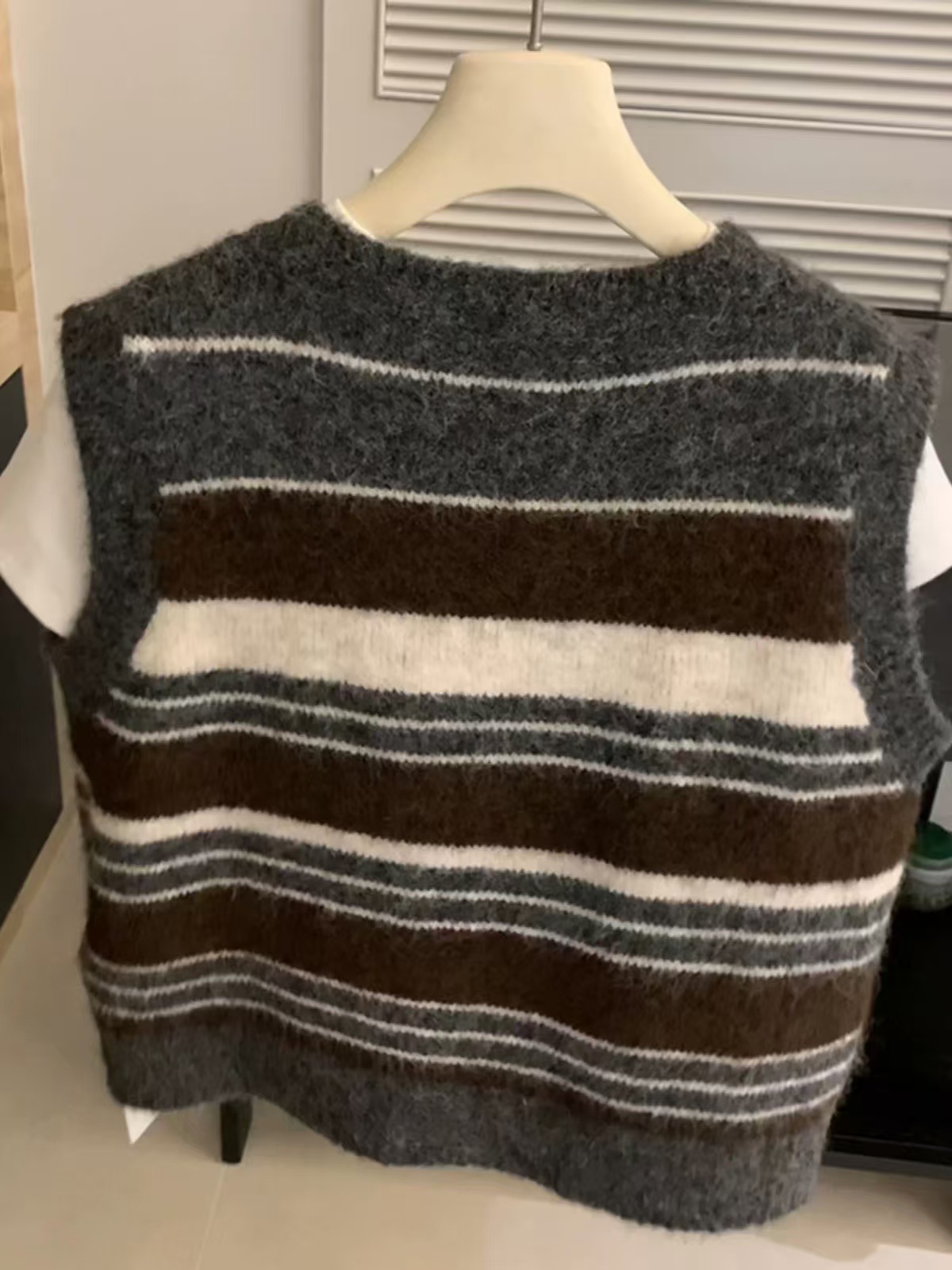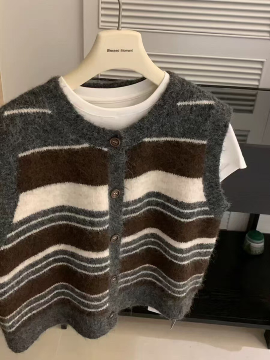 Ретро-полосатый премиум-стиль простой округлый воротник темперамент трикотажный жилет модный осенний свободный стек на плече топ женский