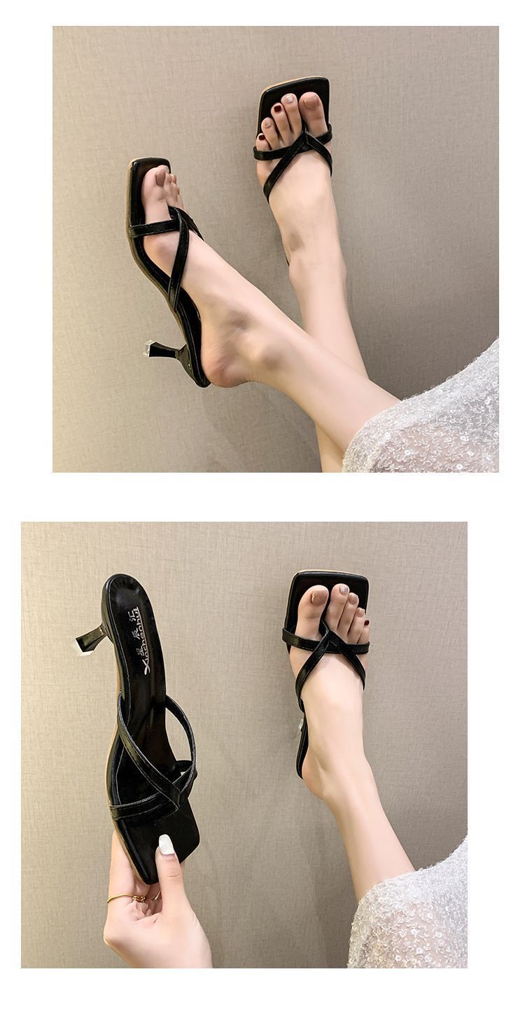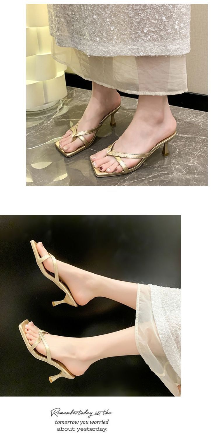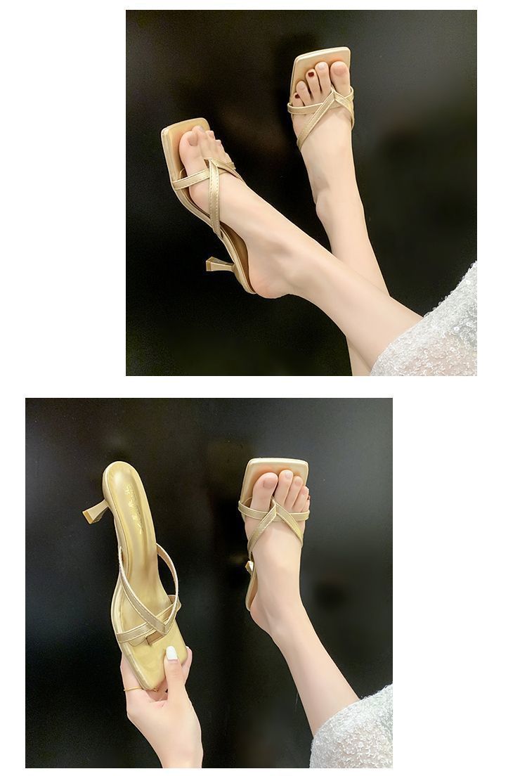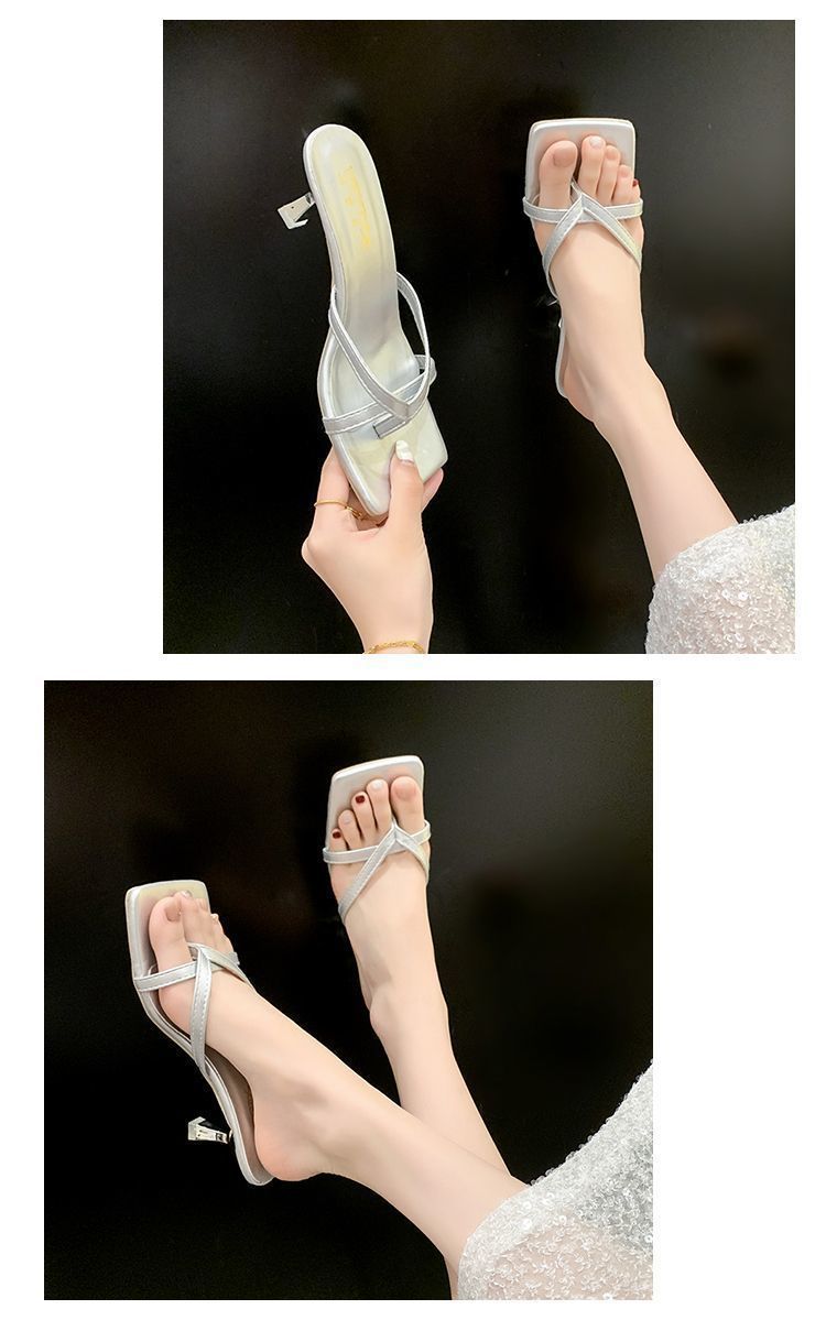 Квадратные каблуки и взрывные буксирные 2024 летние новые сандалии с высокой красотой, нишевые износостойкие носки на высоких каблуках