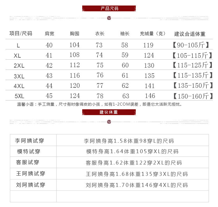 L [рекомендуется в пределах 50kg] емкость наполнения 119 г; XL [рекомендуемая емкость наполнения вниз 100-12] 124 г; 2XL [рекомендуемая емкость наполнения вниз 115-12] 130 г; 3XL [рекомендуемая 125-12] емкость наполнения вниз 135 г; 4XL [рекомендуемая емкость наполнения вниз 135-12] 141 г; 5XL [рекомендуемая 150-12] пуховая емкость заполнения 146 г