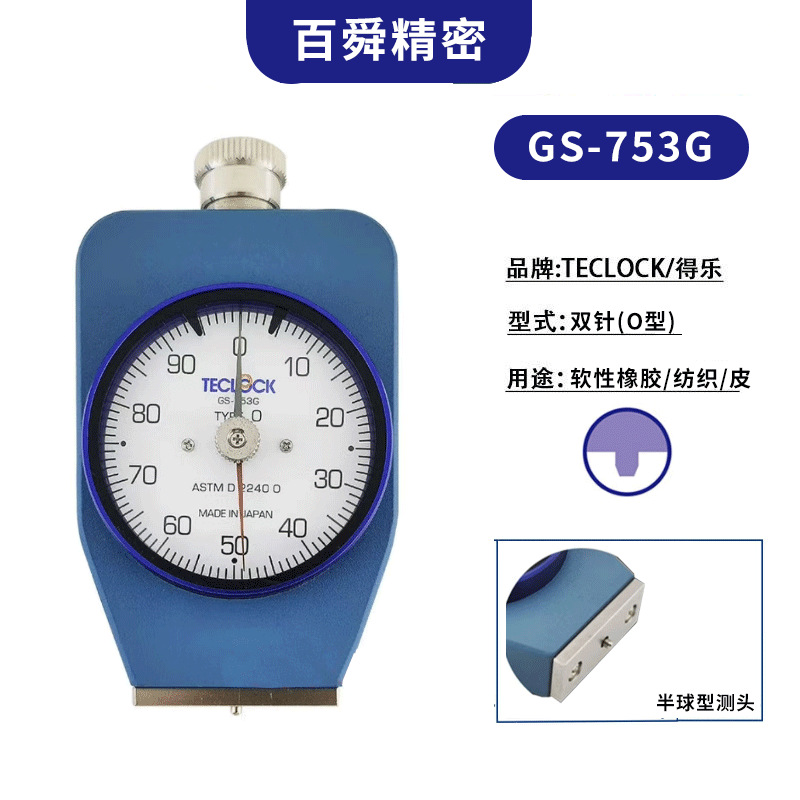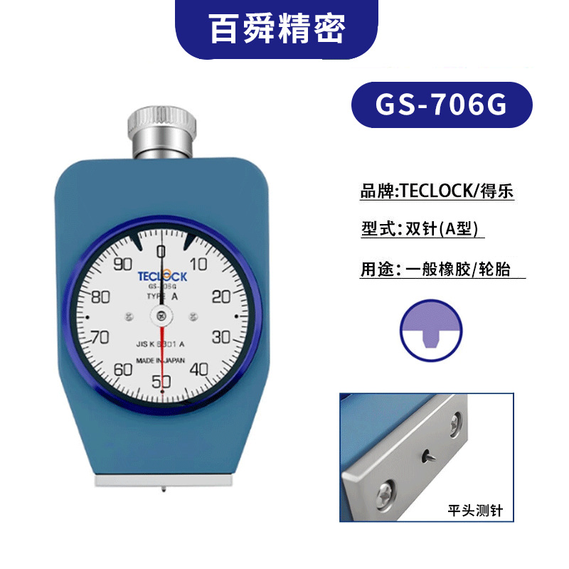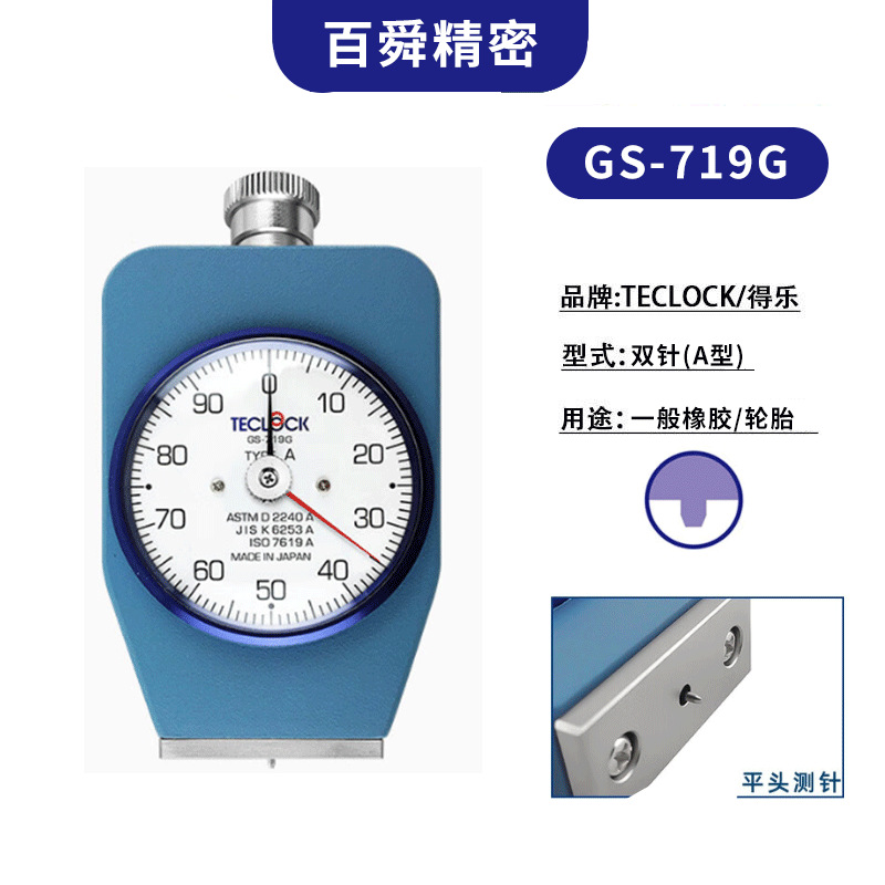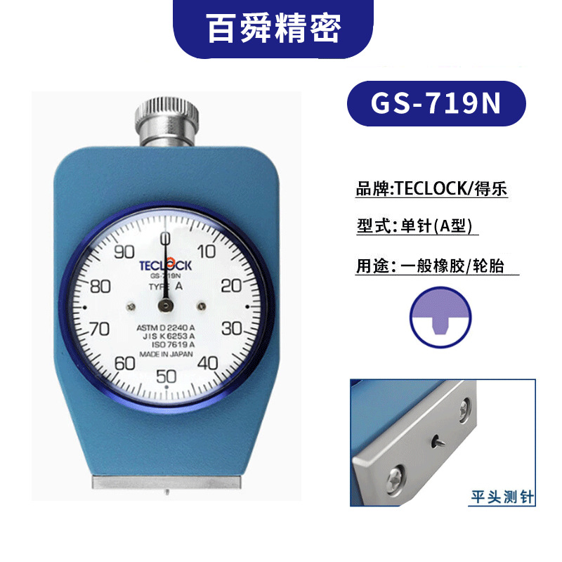 得乐TECLOCK邵氏A型带置位针硬度计GS-719G,适用于一般橡胶,如轮胎、橡胶水管等橡胶硬度测量。得乐硬度计,A型硬度计,一般橡胶硬度计找百舜精密,代理批发。