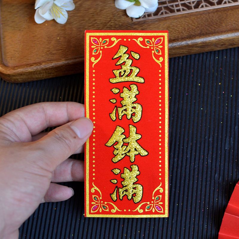 Горшки полны красных шнурков с горячей штамповкой из бархатной ткани. Наклейки Хуньчунь перемещены в дом от двери до двери.