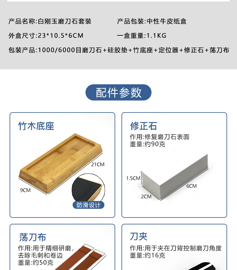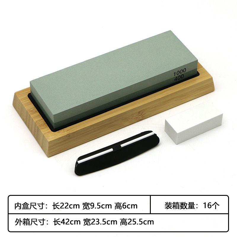 Шлифовальный камень + силиконовая прокладка + бамбуковая основа; Шлифовальный камень + силиконовая накладка + бамбуковая основа + зажим для ножа; Шлифовальный камень + силиконовая прокладка + бамбуковая основа + зажим для ножа + корректирующий камень; Зажим для ножа + корректирующий камень; Бамбуковая основа; 400/1000 меш