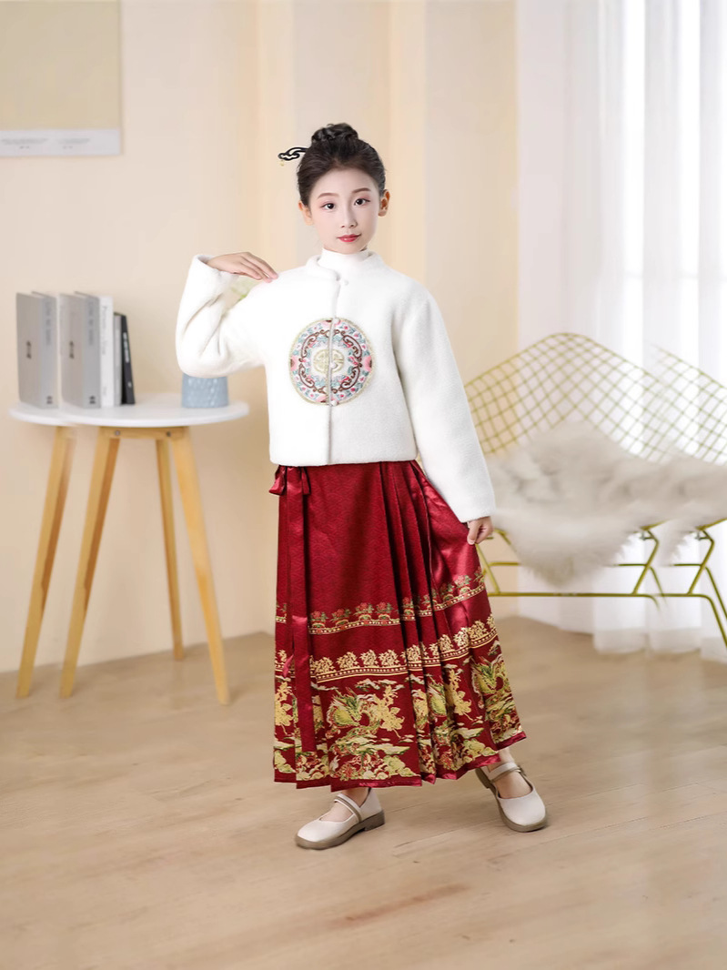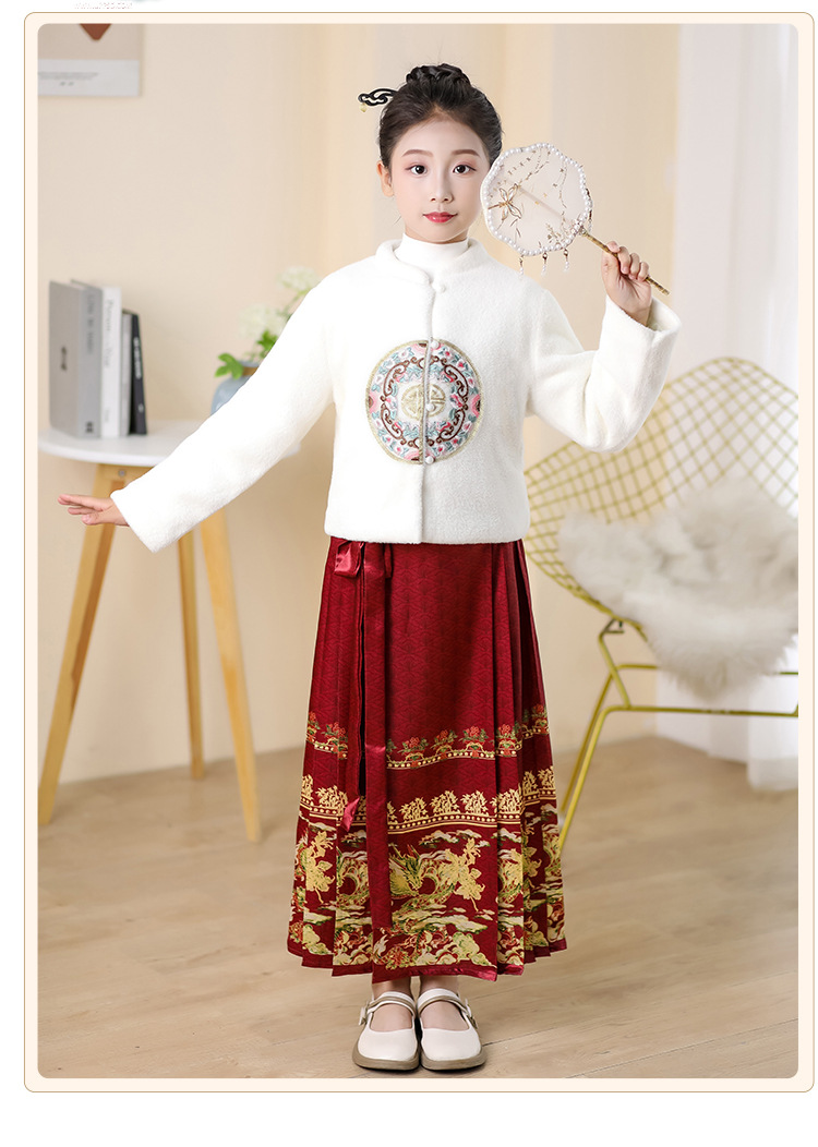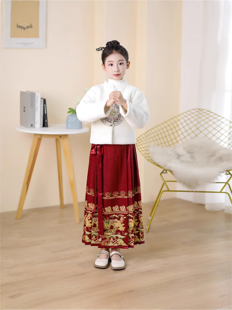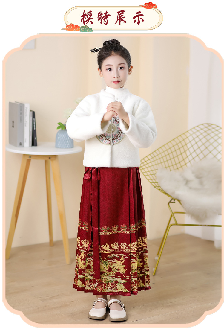 Красная юбка с одним конским лицом [одинарная юбка]; Белая хлопковая куртка [одинарная куртка]; Красный костюм [куртка + юбка-конца]