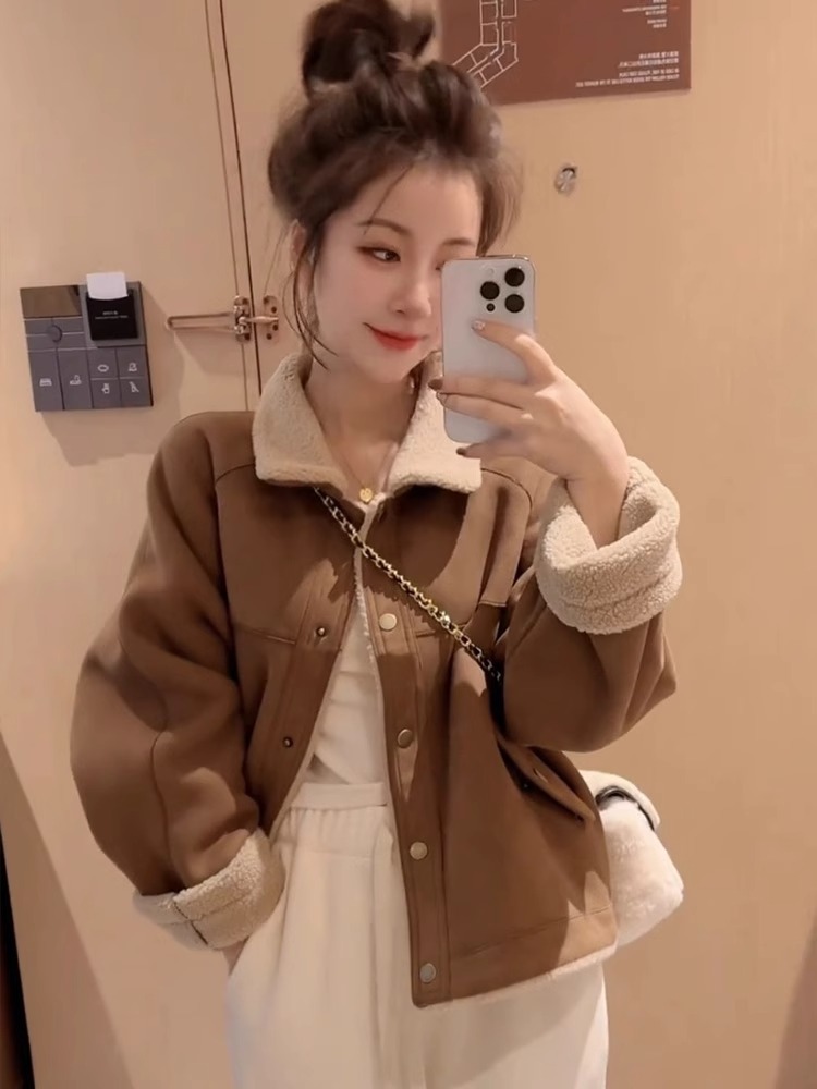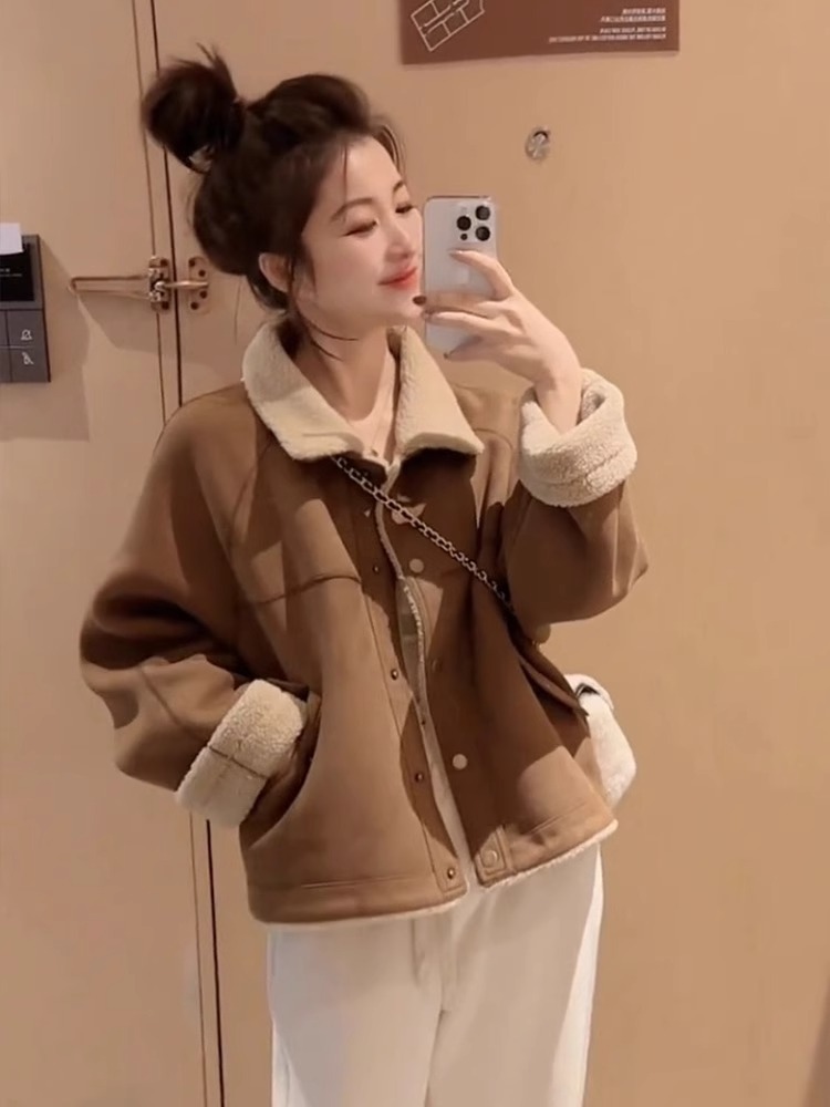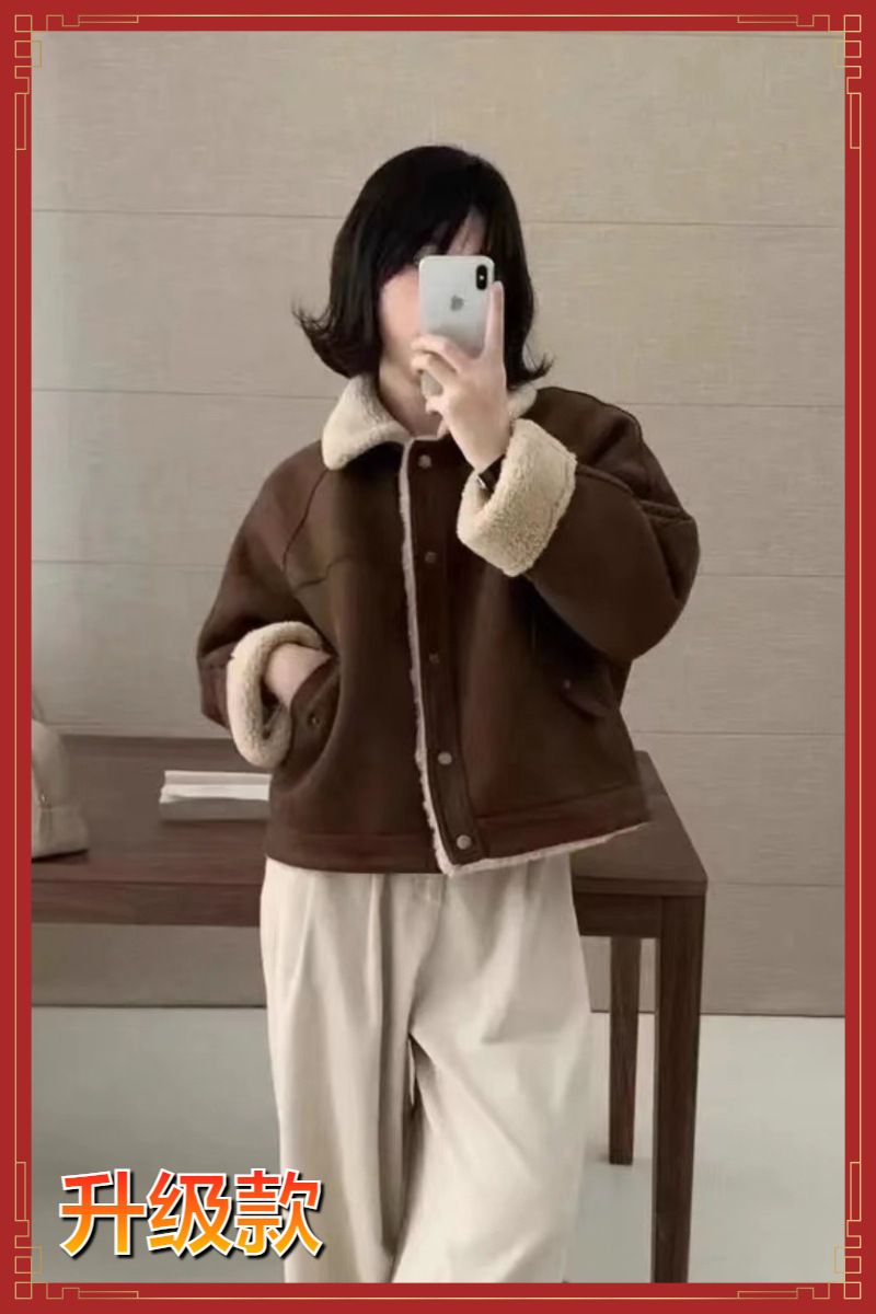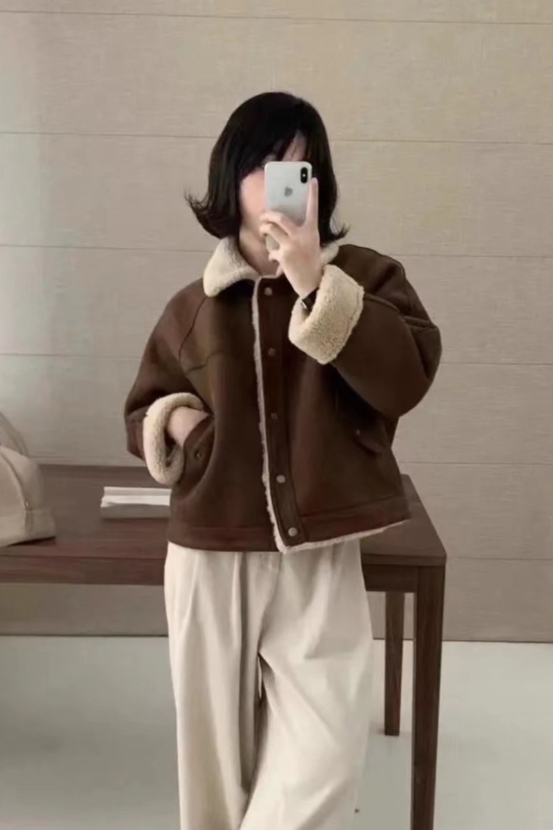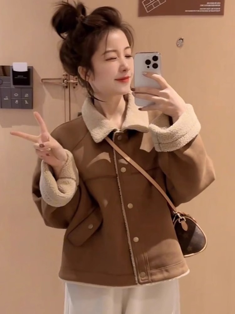 Маленький толстый ретро-отворот куртка женский 2024 осень-зима новый мех один теплая овечья шерсть короткая куртка