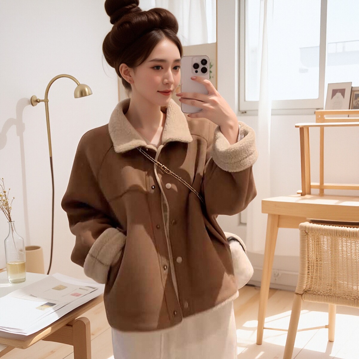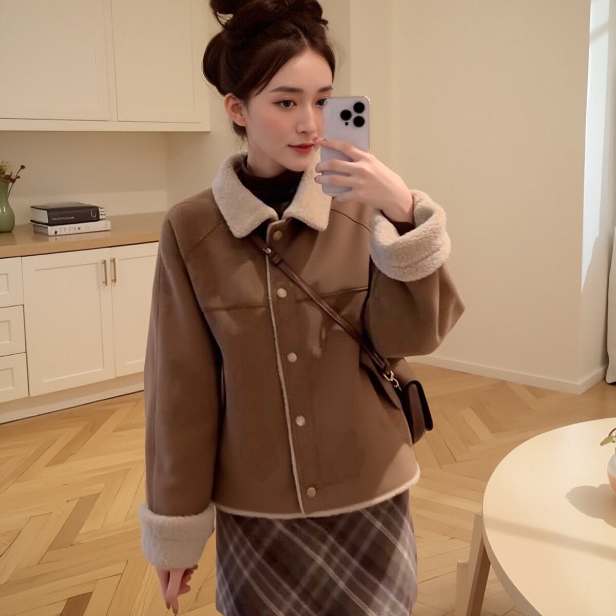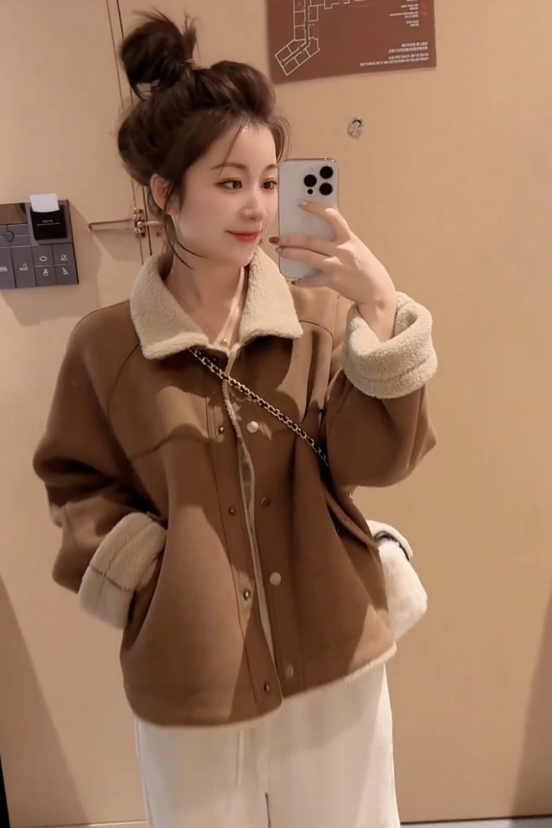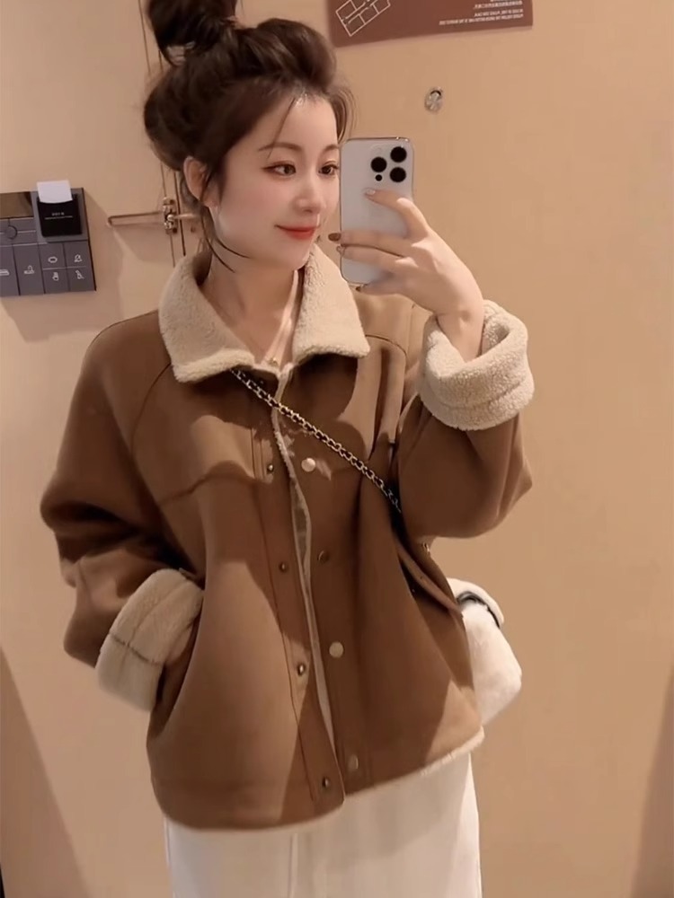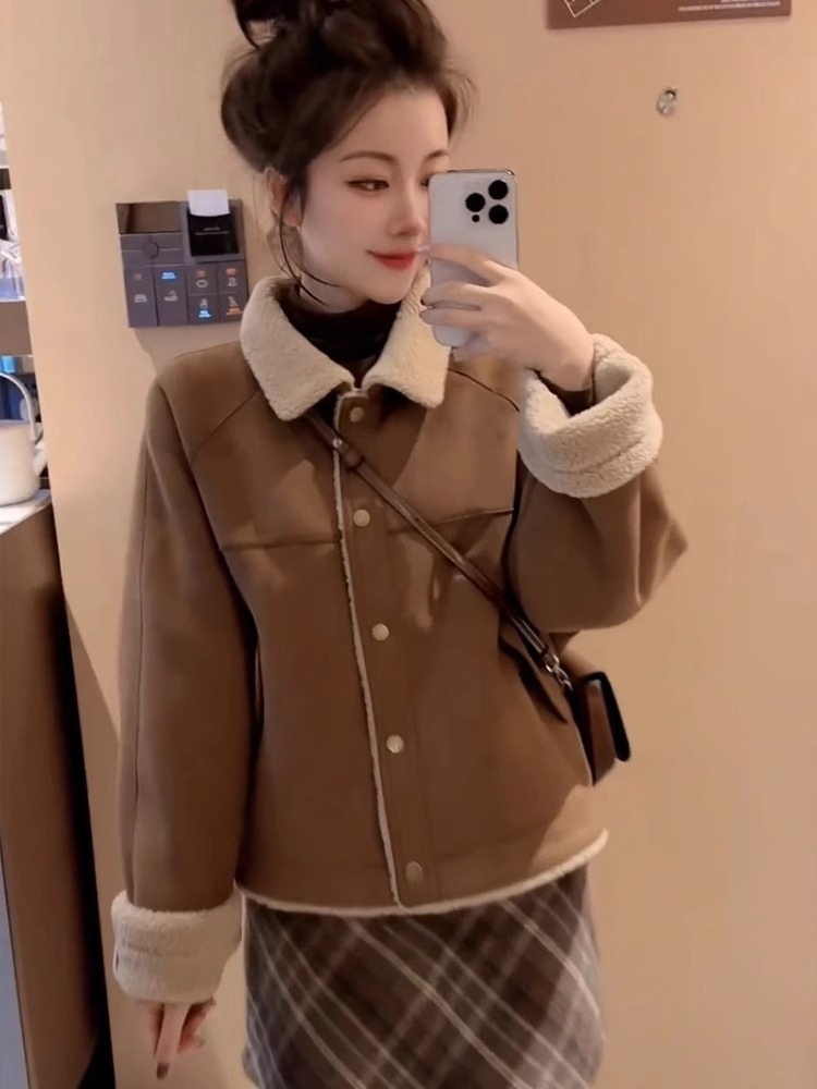 Маленький толстый ретро-отворот куртка женский 2024 осень-зима новый мех один теплая овечья шерсть короткая куртка