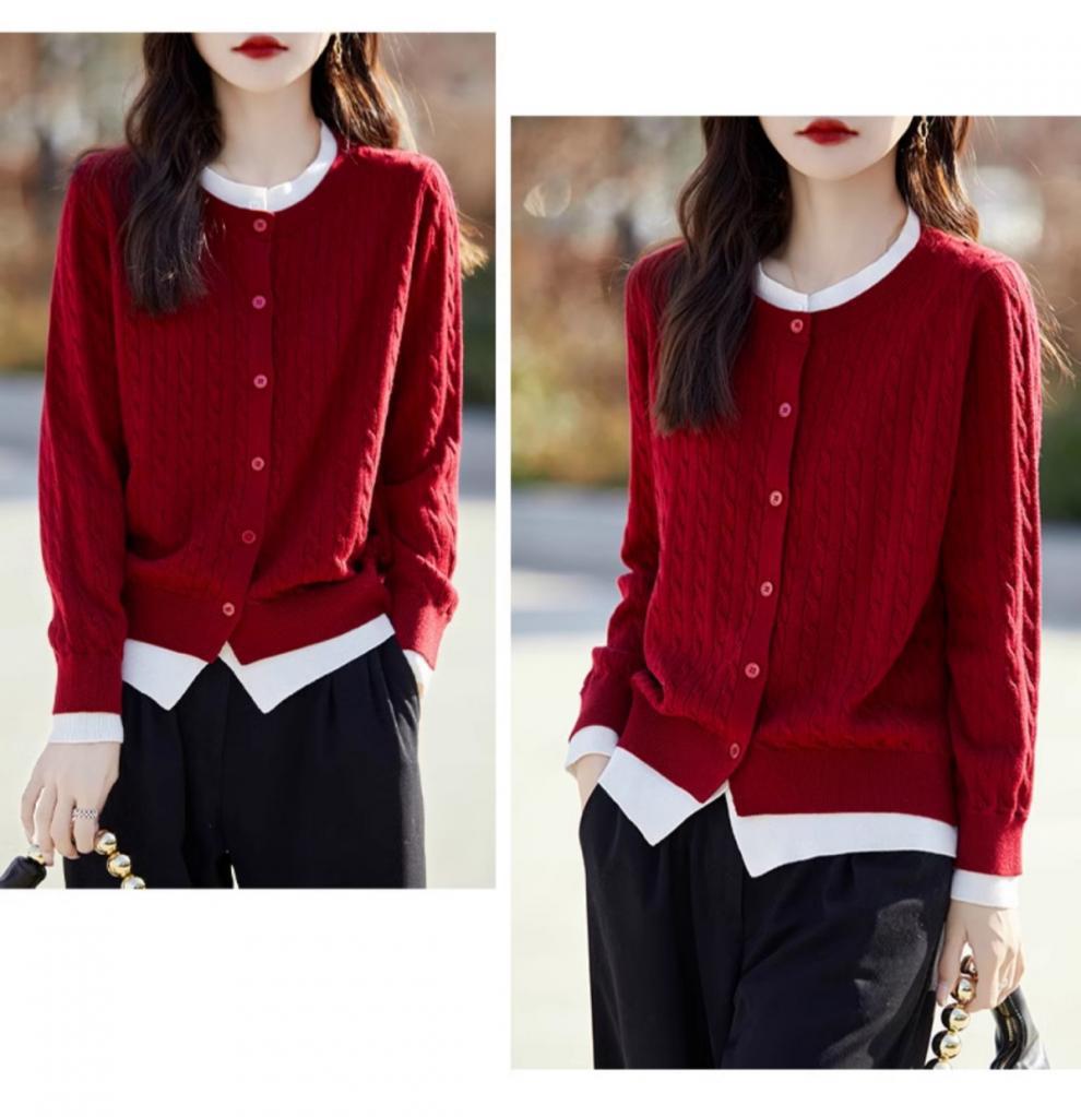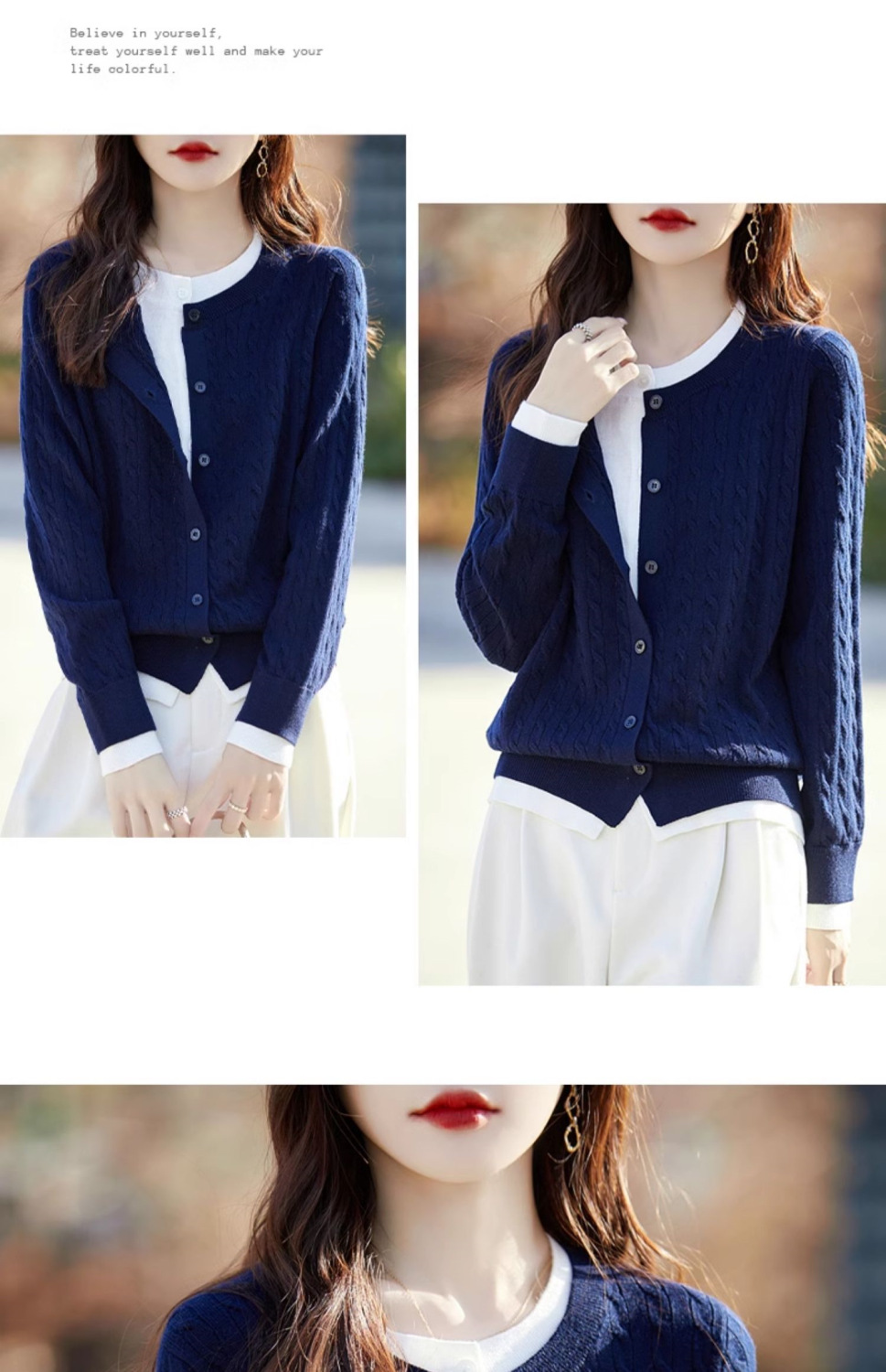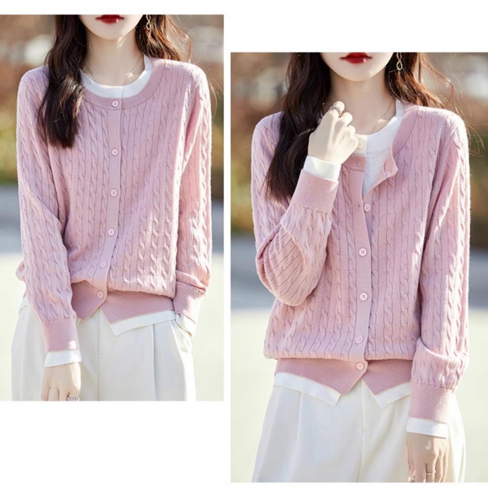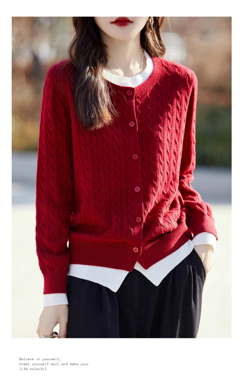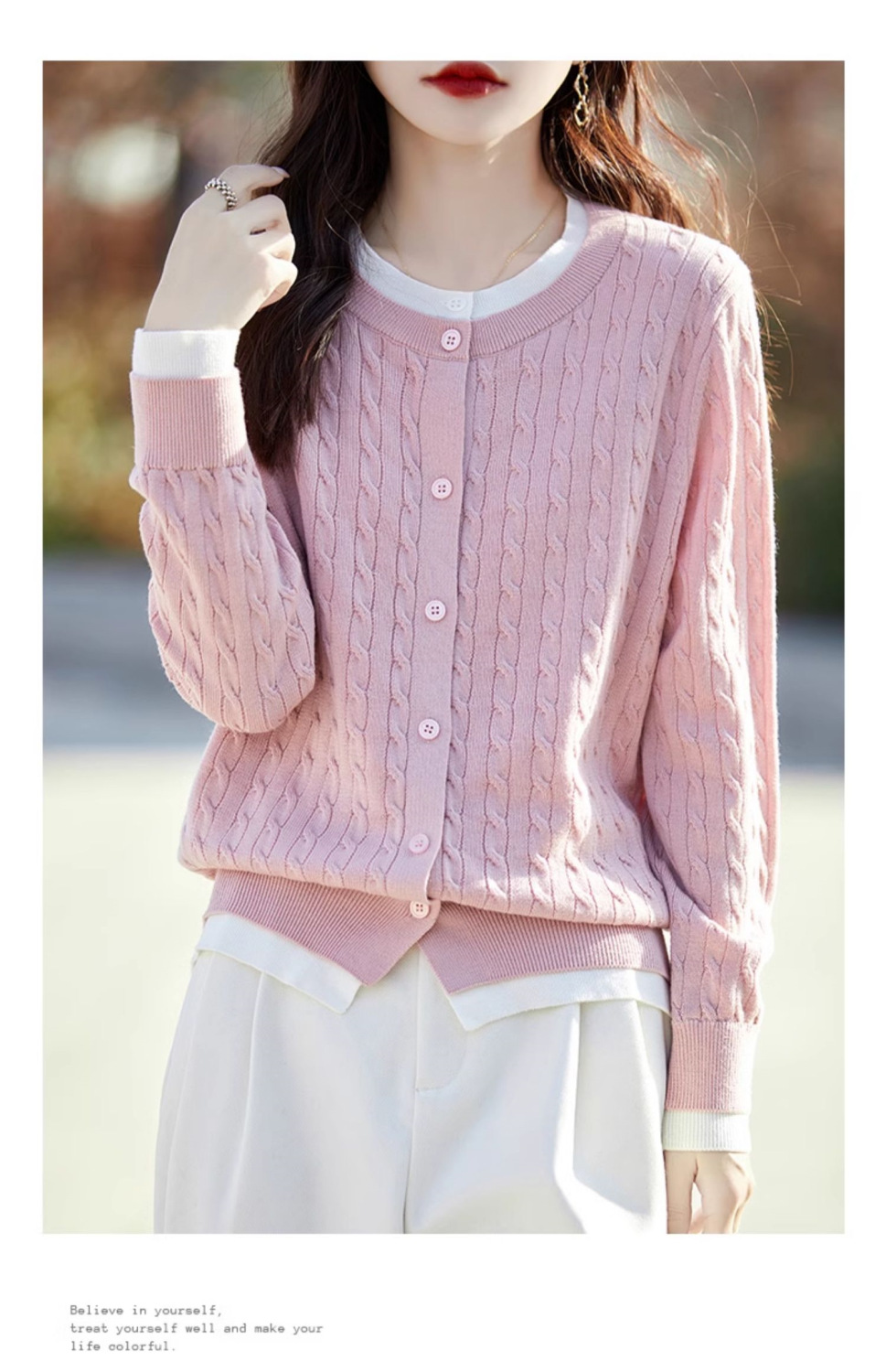Цветной кардиган с круглым вырезом из поддельных двух частей женский 2024 осень-зима новый свободный твик женский свитер куртка трикотажный топ