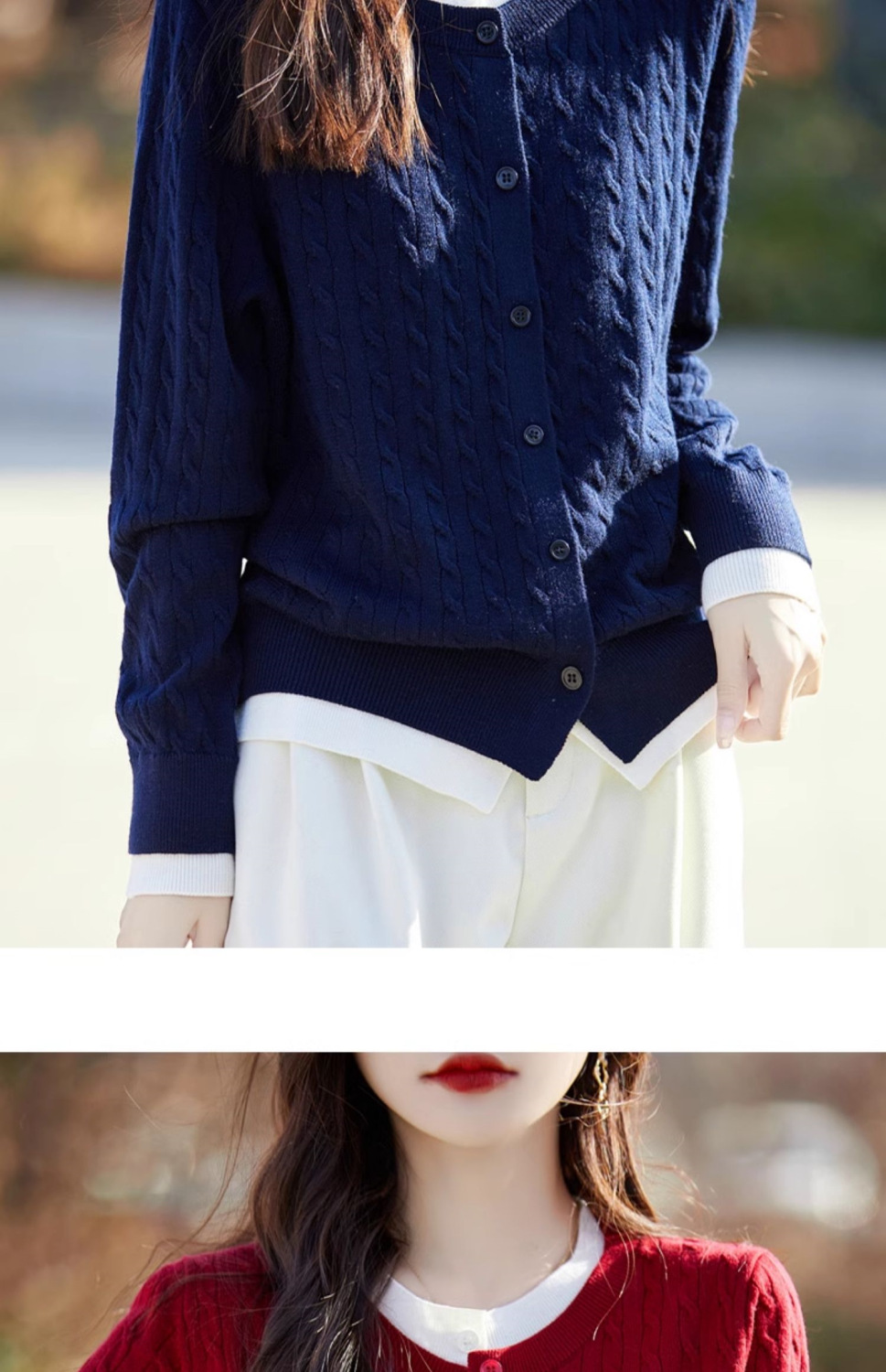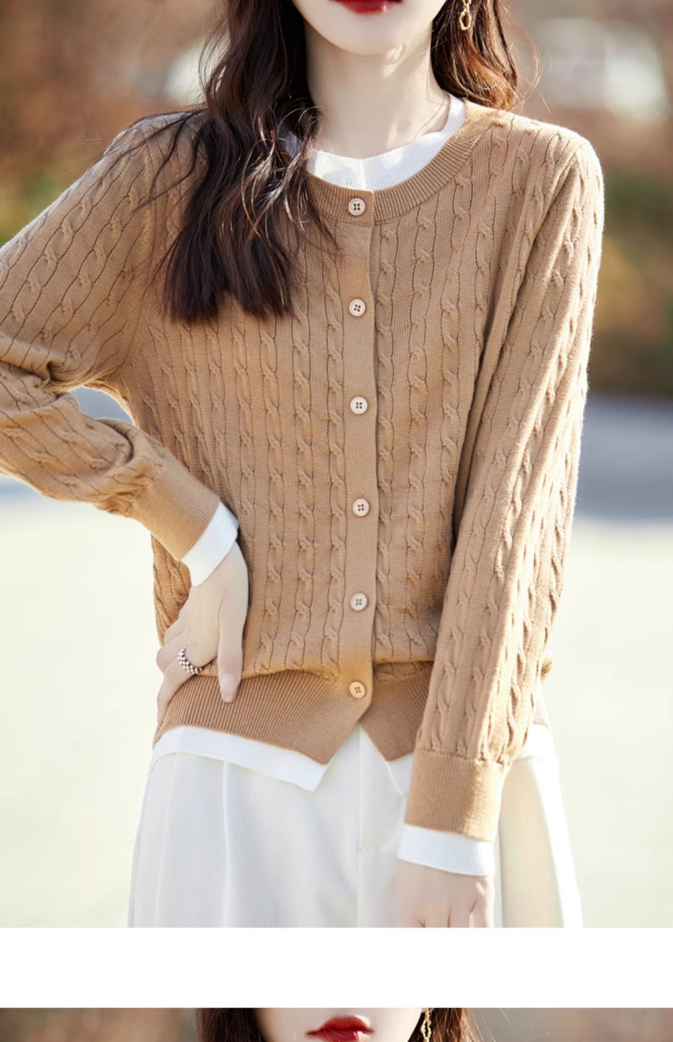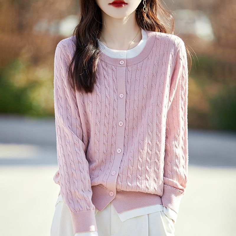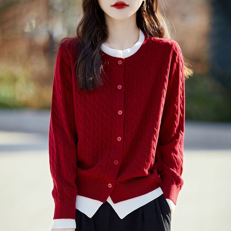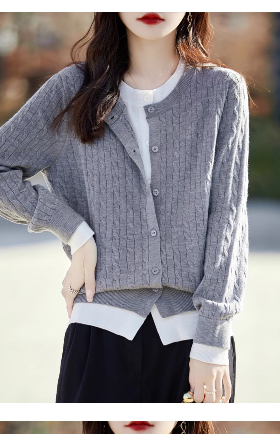 Цветной кардиган с круглым вырезом из поддельных двух частей женский 2024 осень-зима новый свободный твик женский свитер куртка трикотажный топ