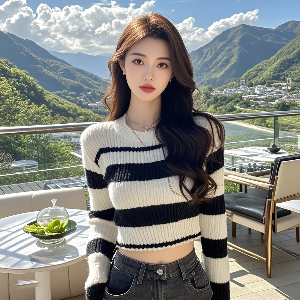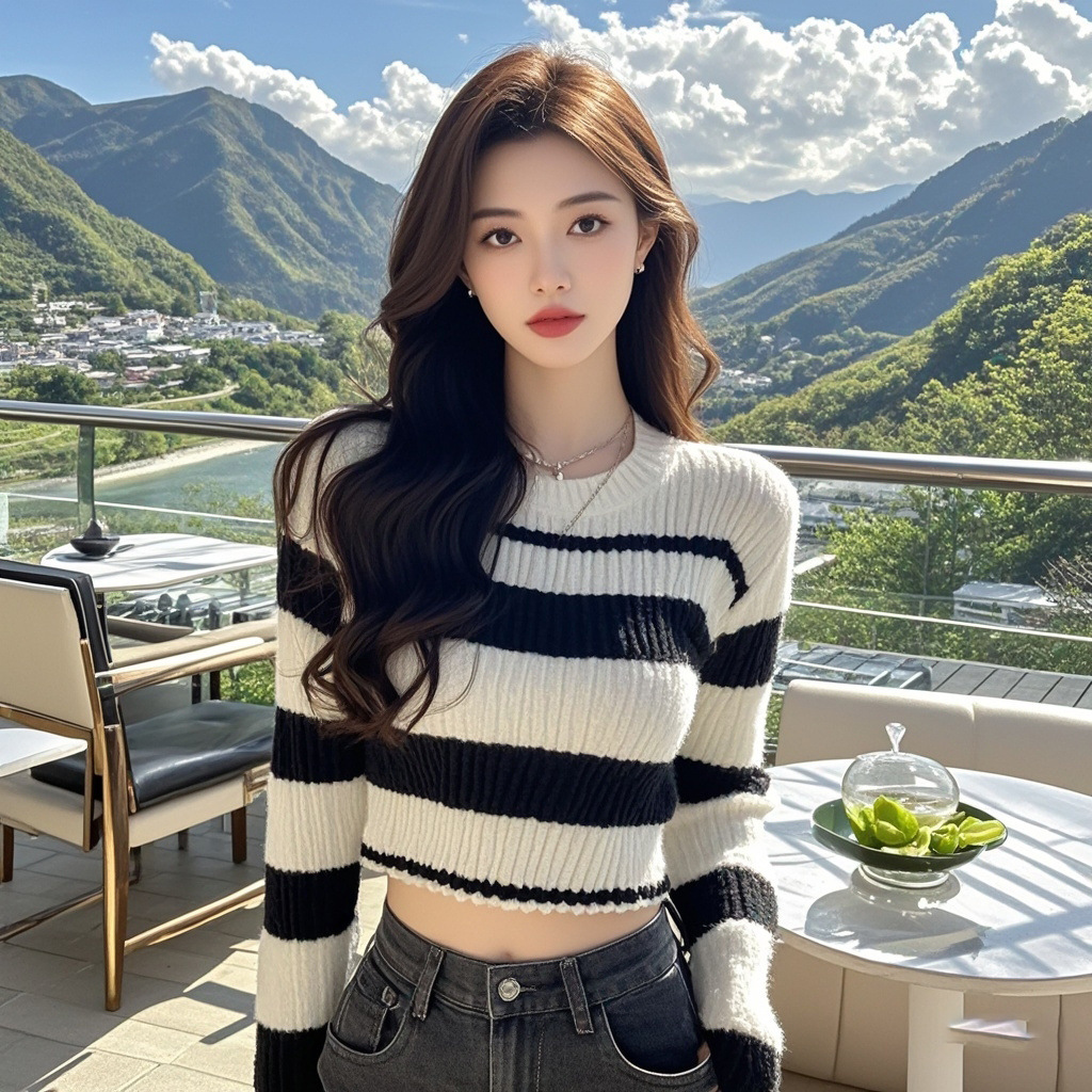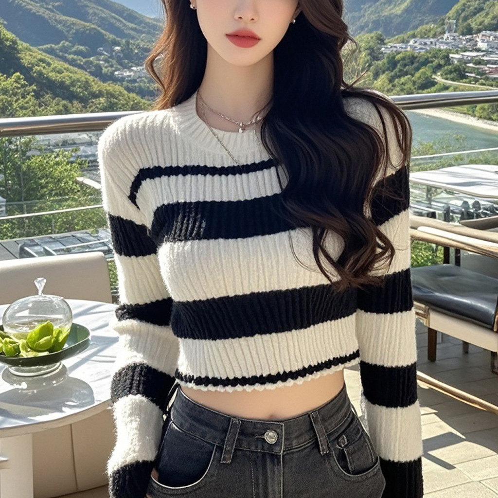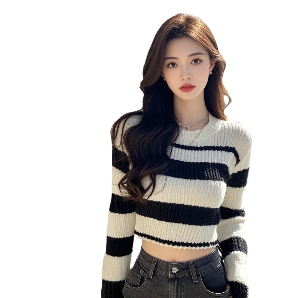 Полосатый контрастный цвет дизайн трикотажный свитер женский осенний новый маленький человек с чистым круглым вырезом с длинными рукавами темпераментный короткий топ
