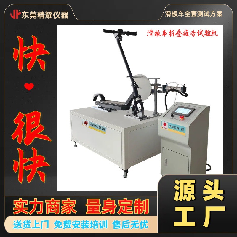 滑板车折叠疲劳测试机是用于检测滑板车折叠部件疲劳性能的设备,通过模拟滑板车在实际使用过程中折叠部件的反复折叠动作,对滑板车的折叠结构进行疲劳测试。在经过一定次数的折叠加载后,检测其受损的情况,为厂商评审产品的优劣和技术上的改进提供试验数据。