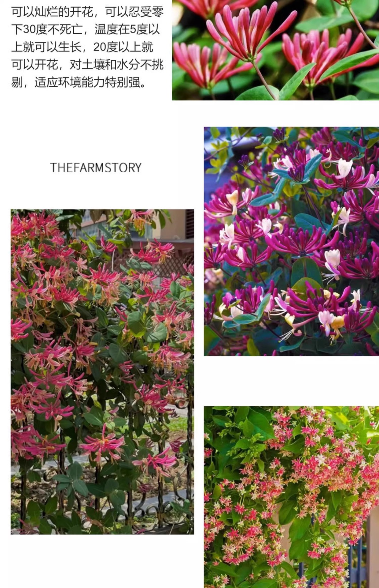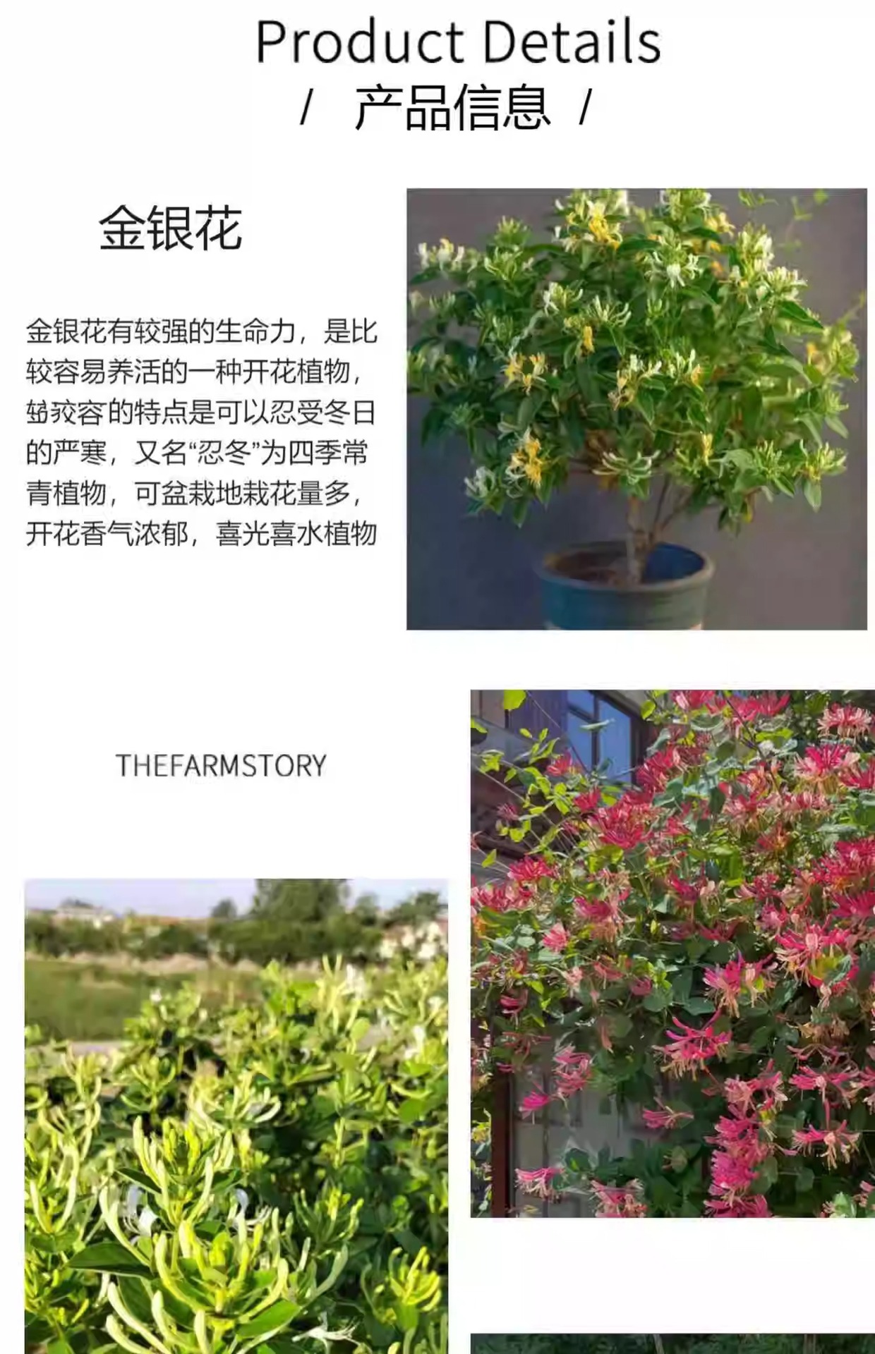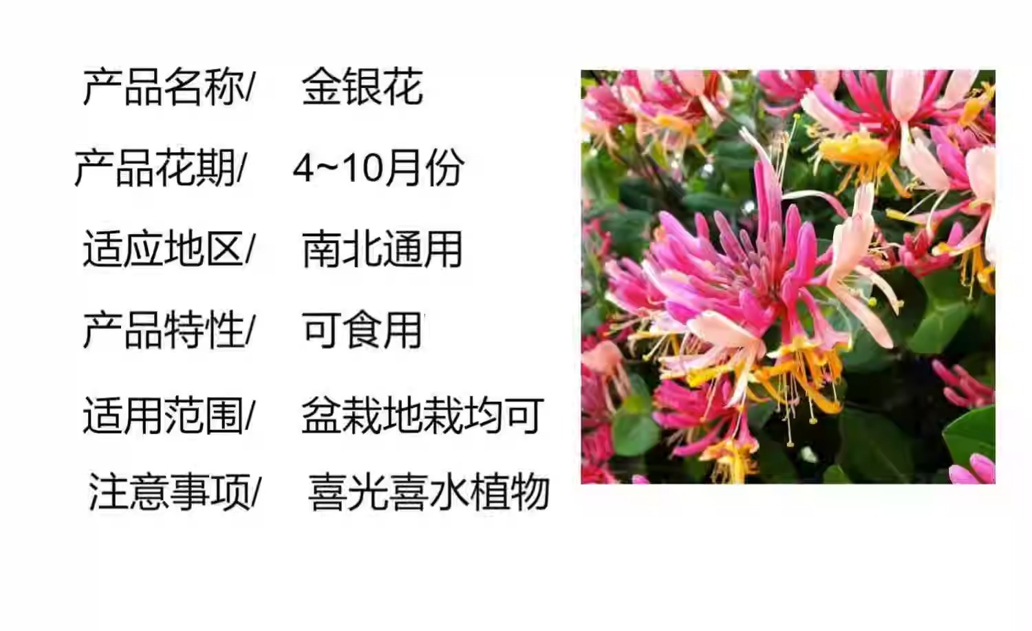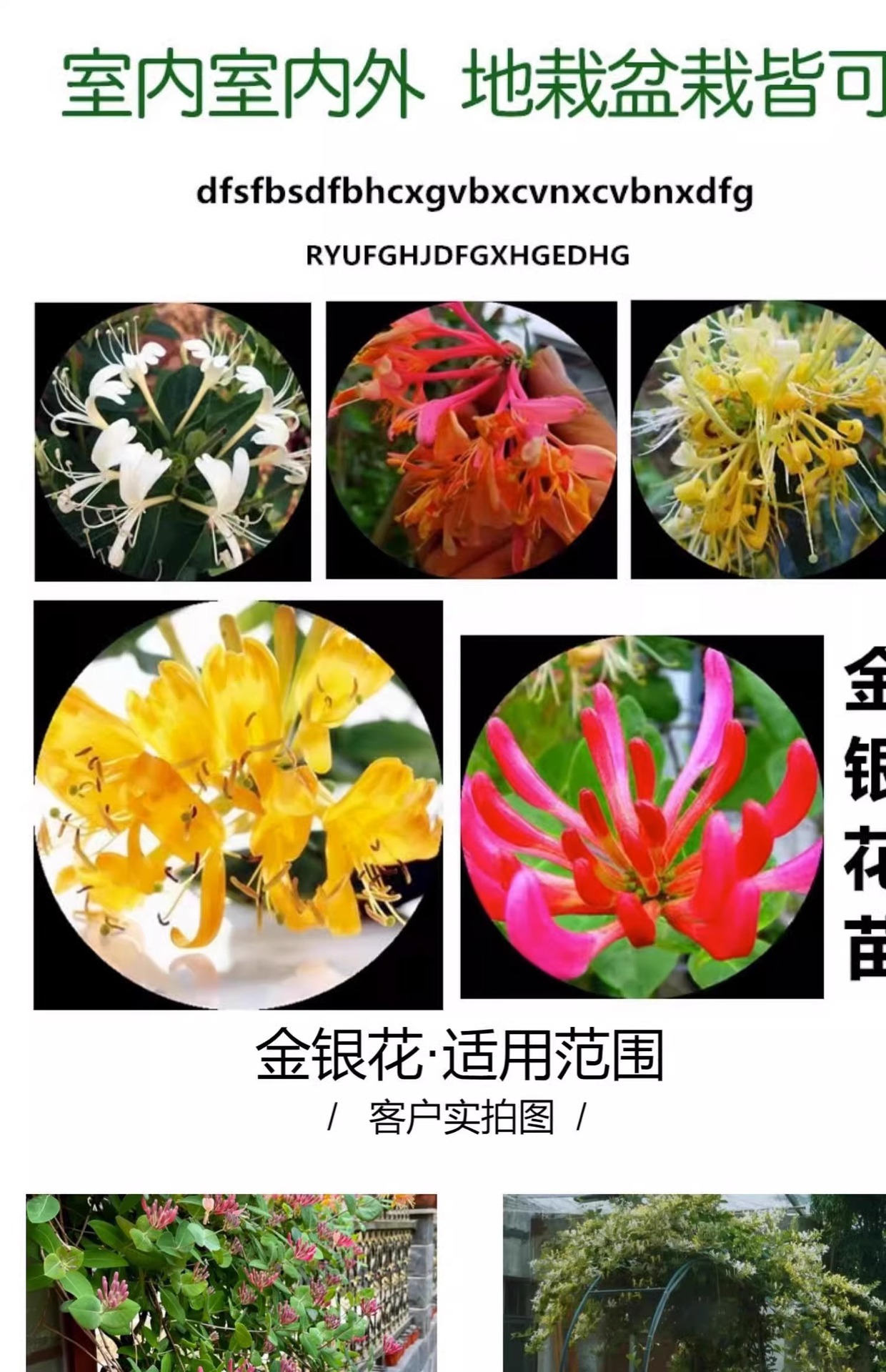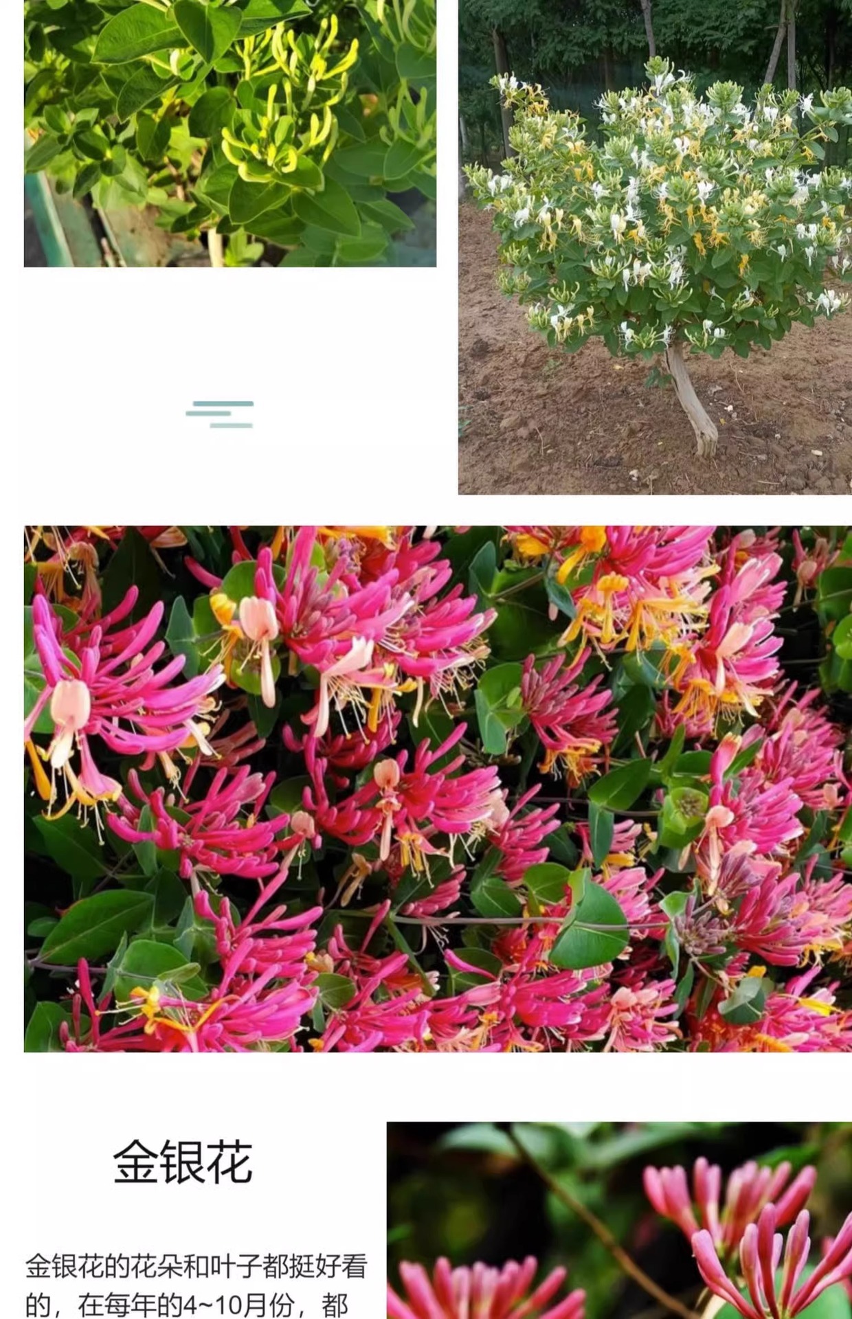 Желтая и белая жимолость; Четыре сезона красный жимолость; Трехцветная жимолость Jingjiu красная; Ленивый жимолость; Четыре сезона жимолость; Вэй Цзы Жимолость; красный белый серебристый жимолость; Яркие золотые и серебряные цветы; Фиолетовый жимолость