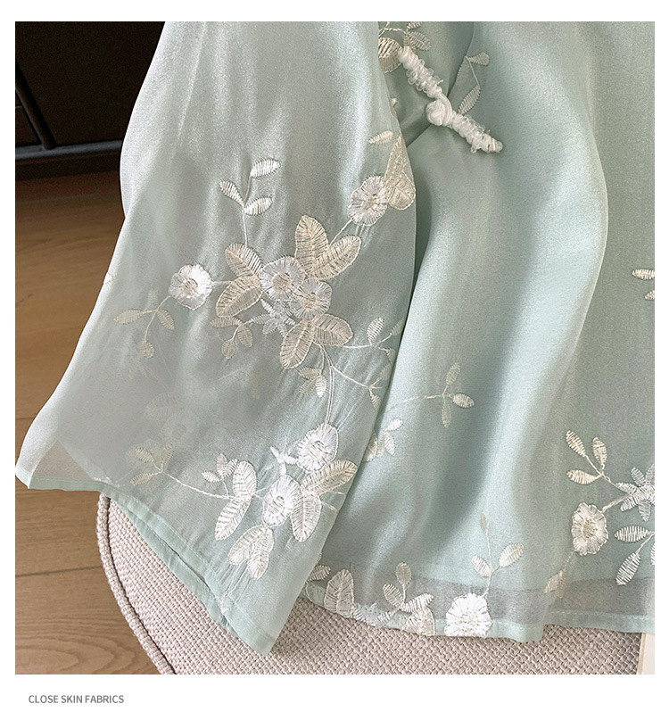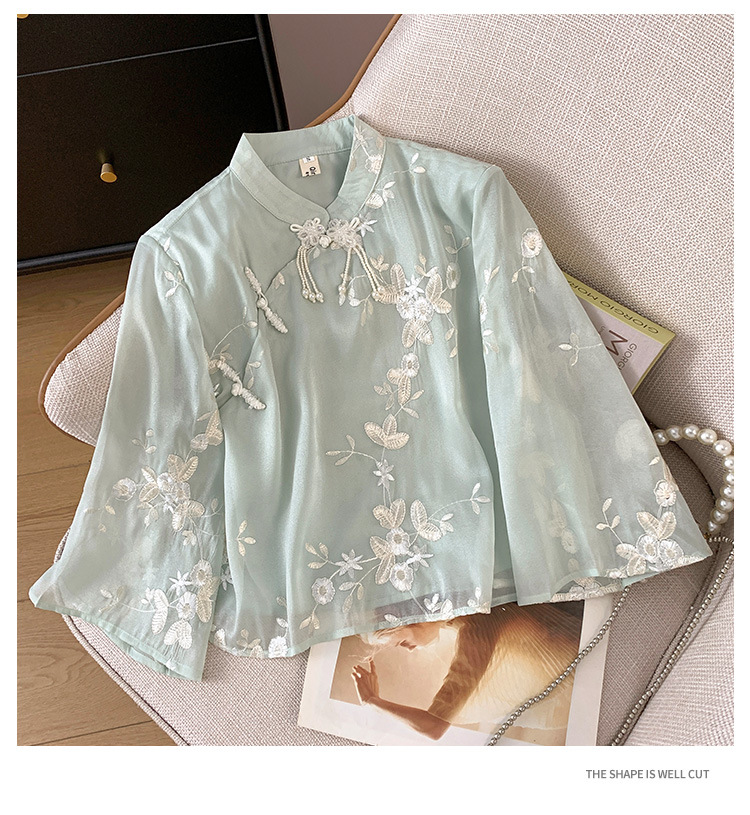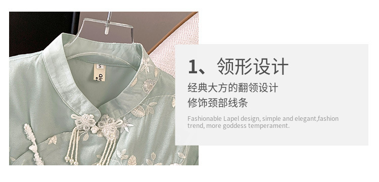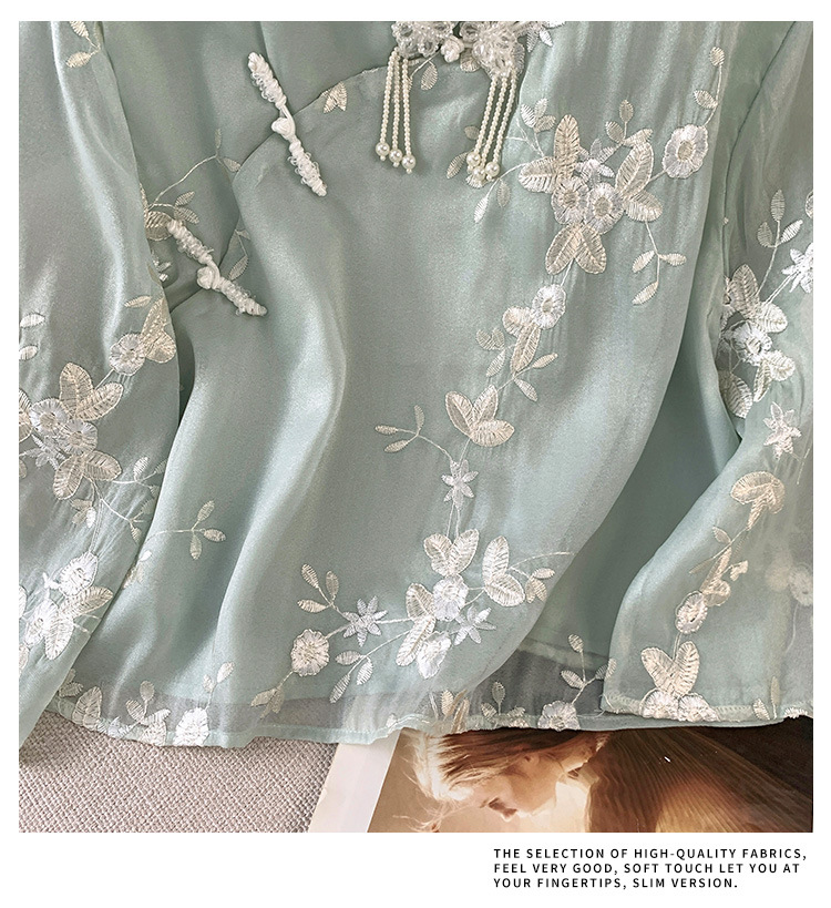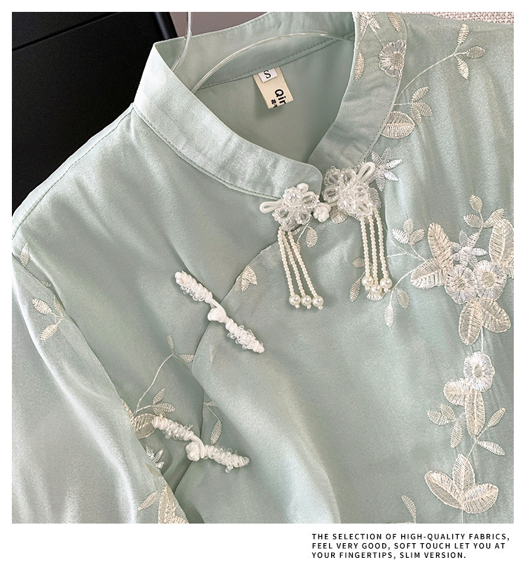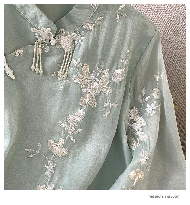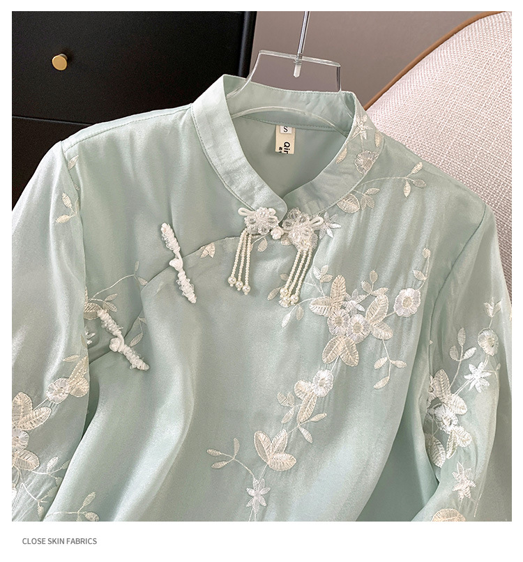 Реальная стрельба в новом китайском стиле с диагональной планкой с вышивкой и воротником с длинными рукавами