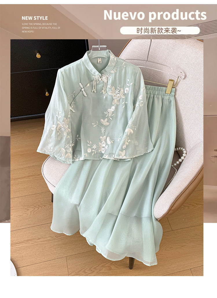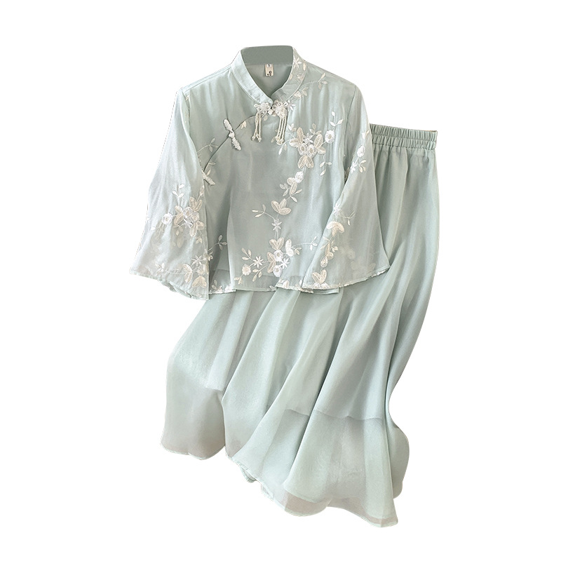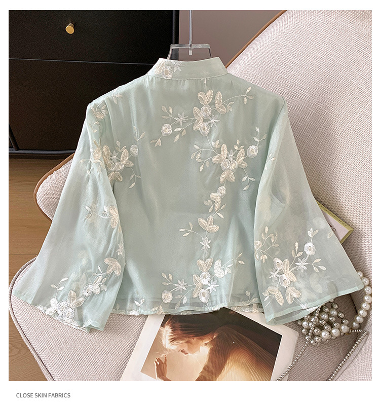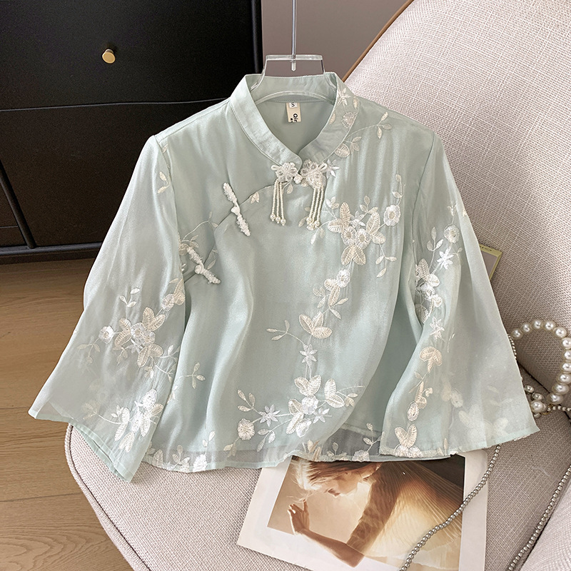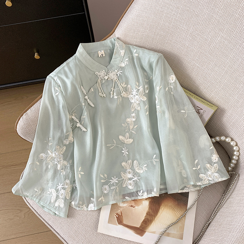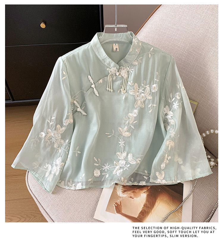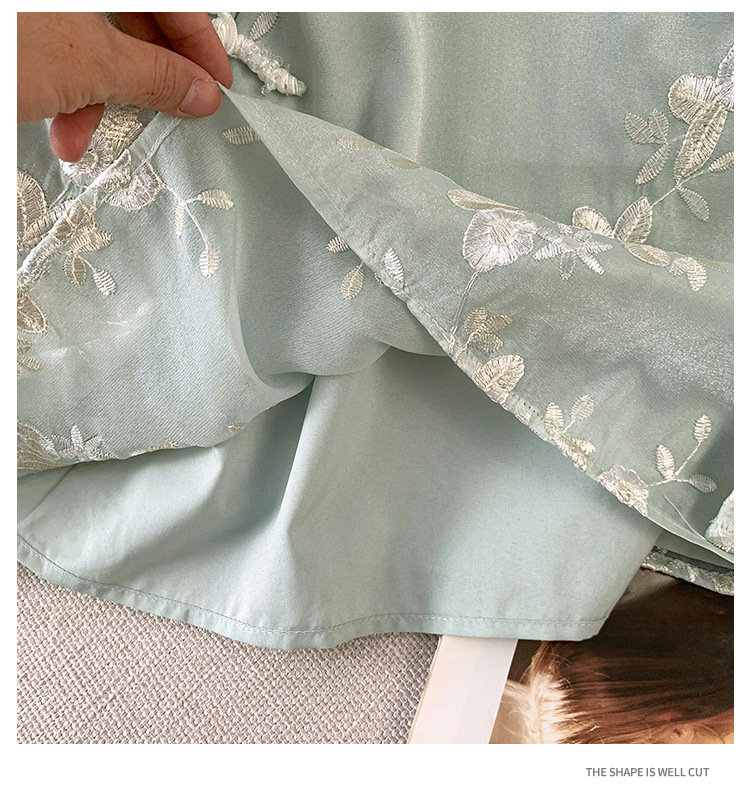Реальная стрельба в новом китайском стиле с диагональной планкой с вышивкой и воротником с длинными рукавами