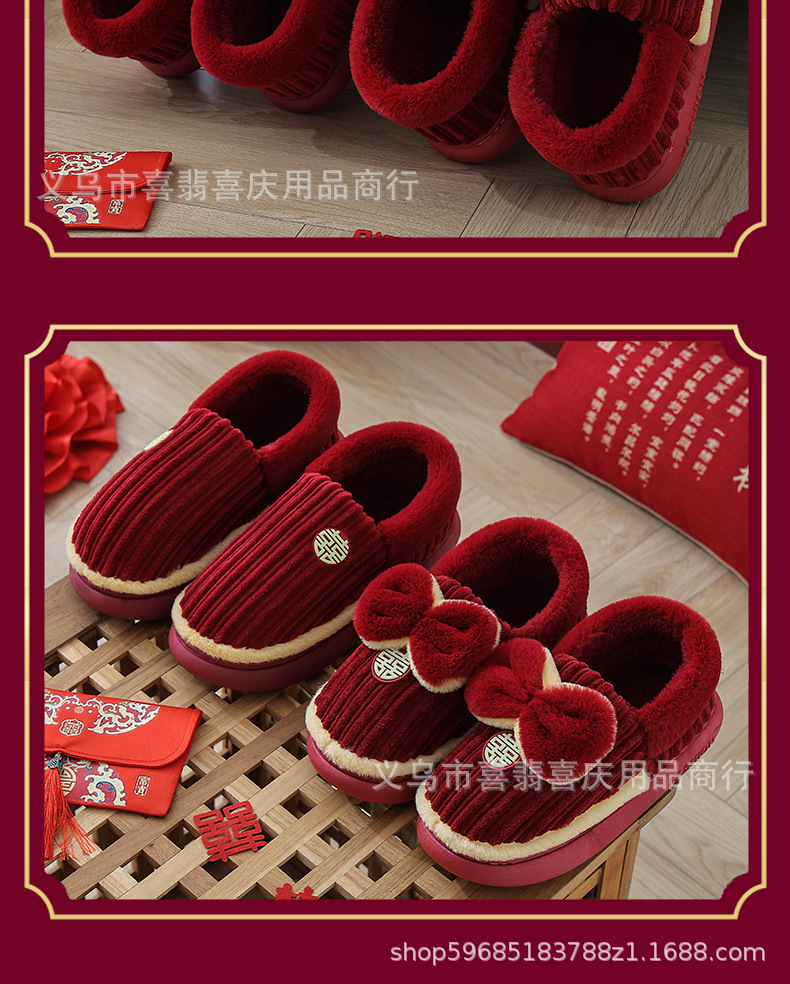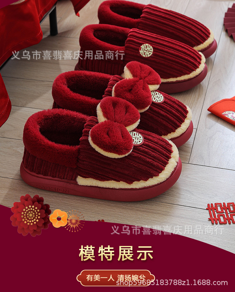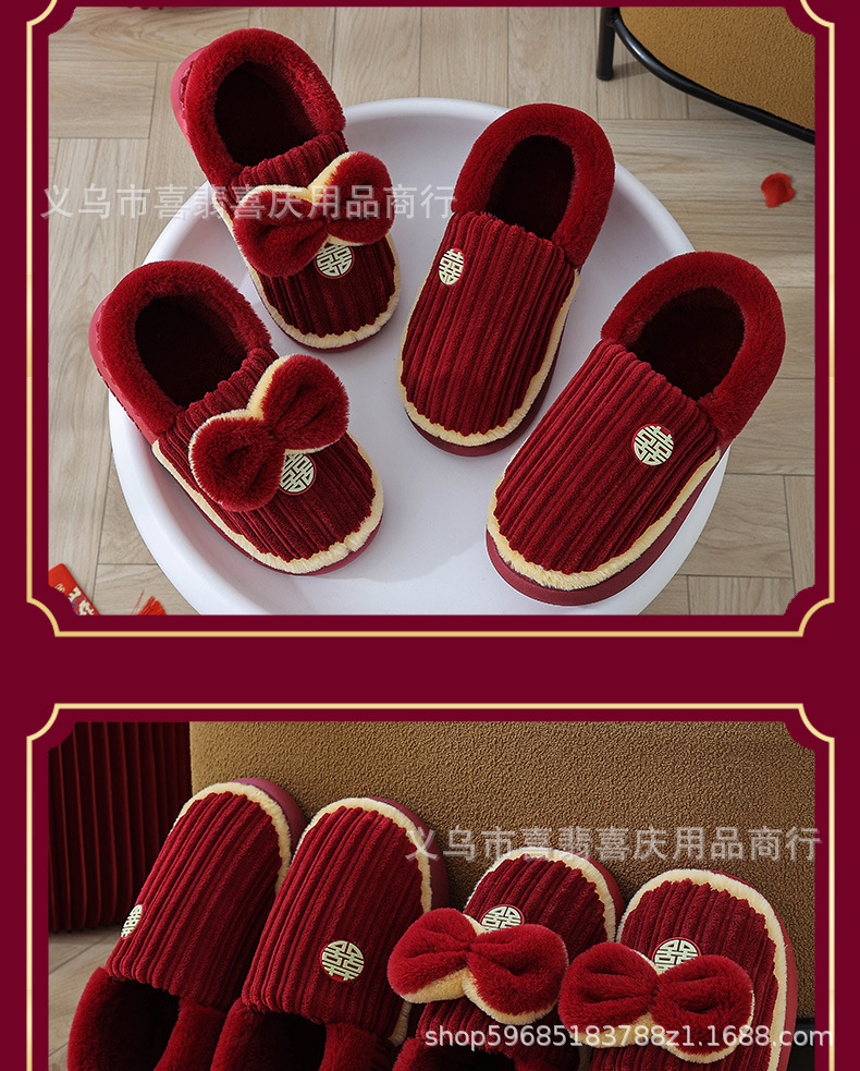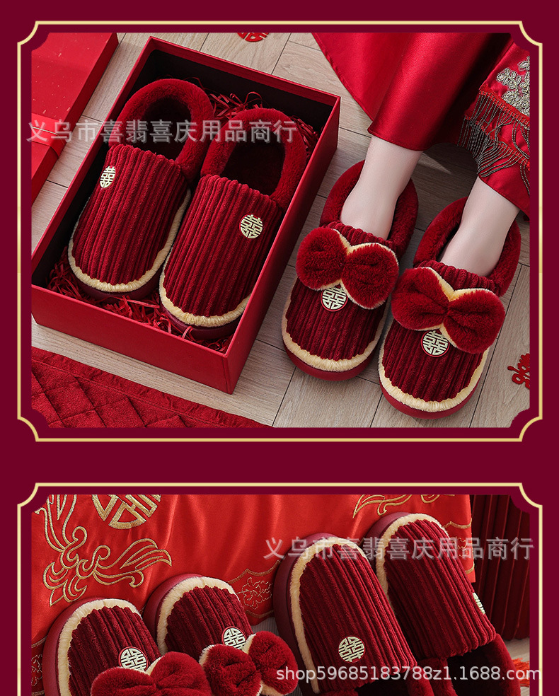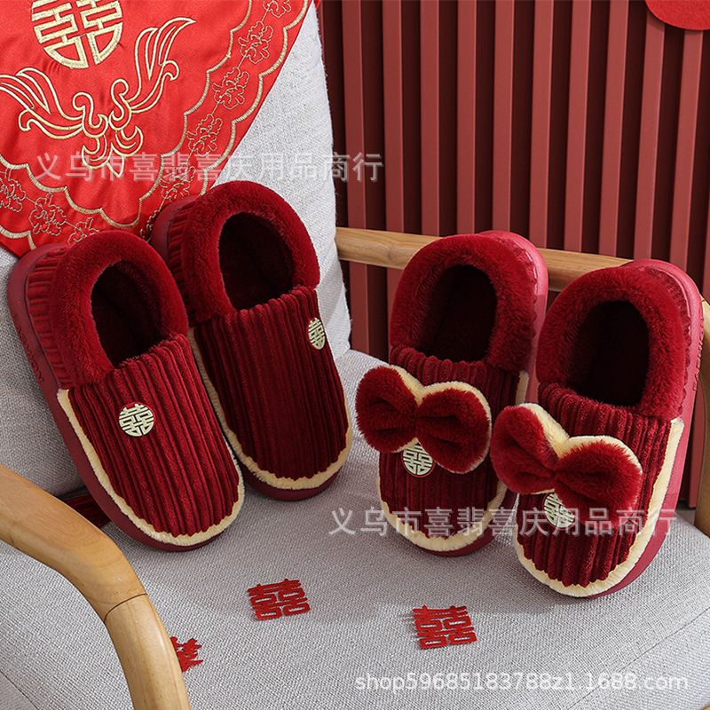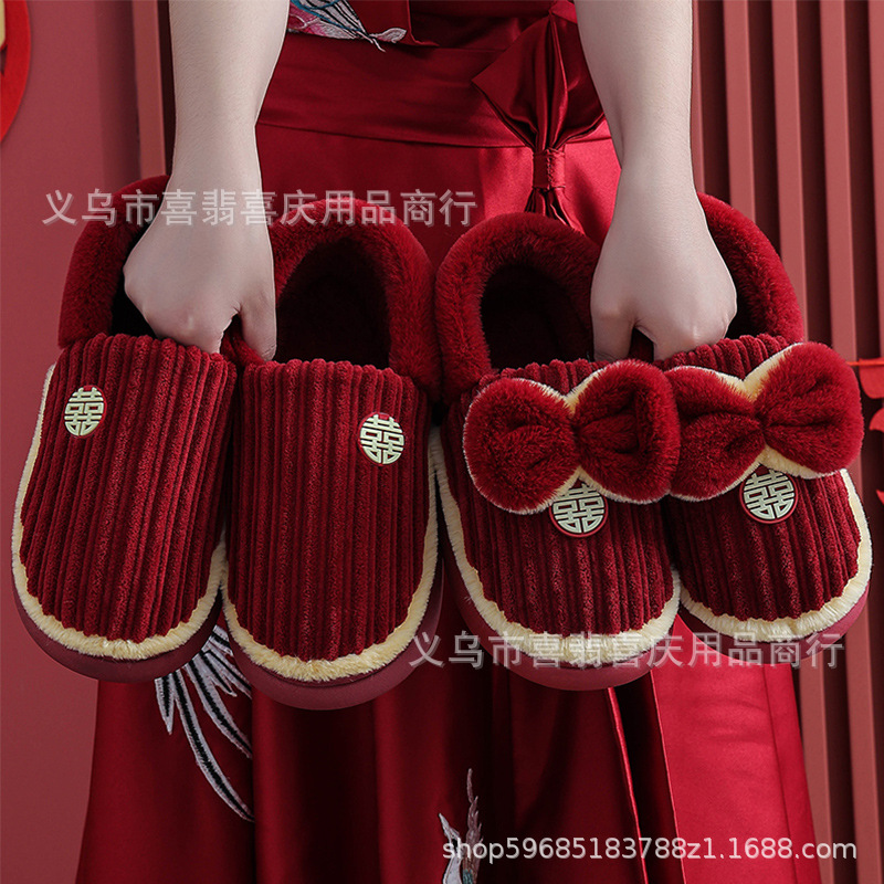 Зимние хлопковые тапочки для пар, свадебное торжество, бордовая пара, домашняя плюшевая приданое невесты, доступная роскошная подарочная коробка для молодоженов.