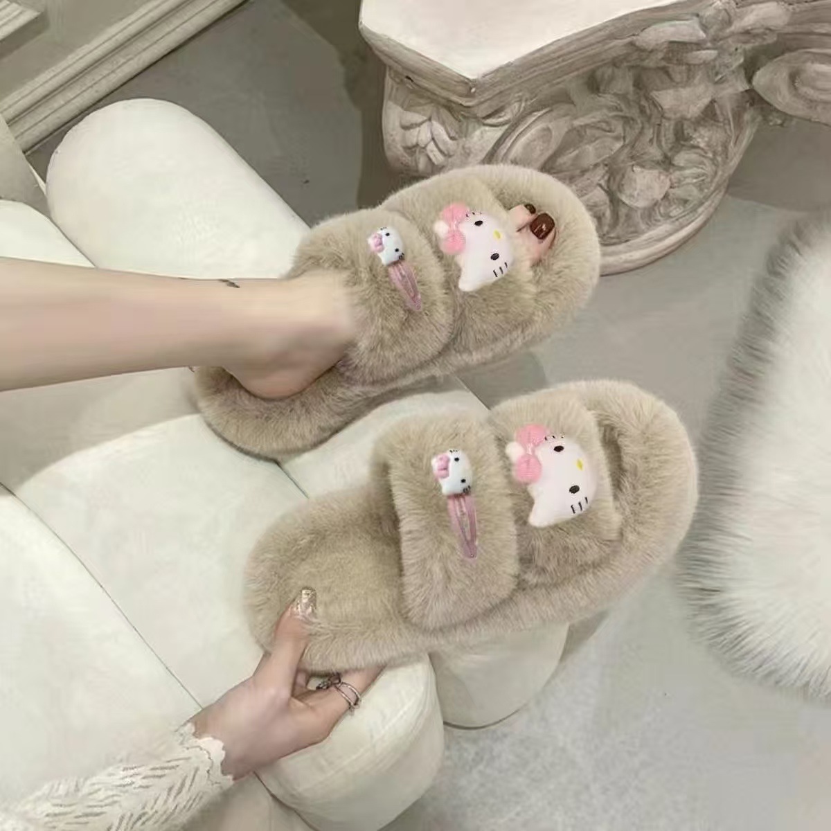 Мультяшный KT-кошка шерстяные тапочки женские осень-зима 2023 новая домашняя одежда корейская версия милые плоские плюшевые тапочки