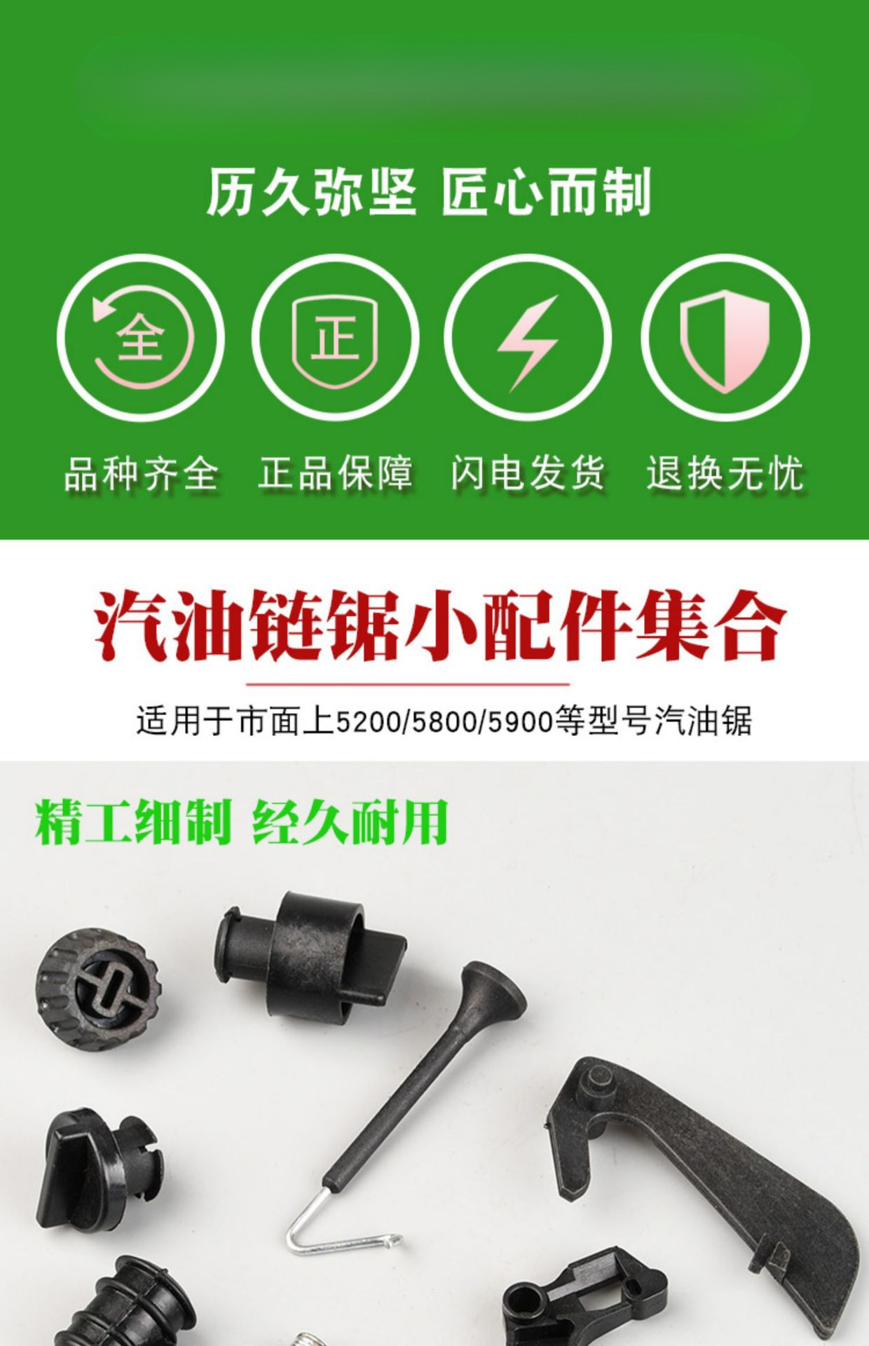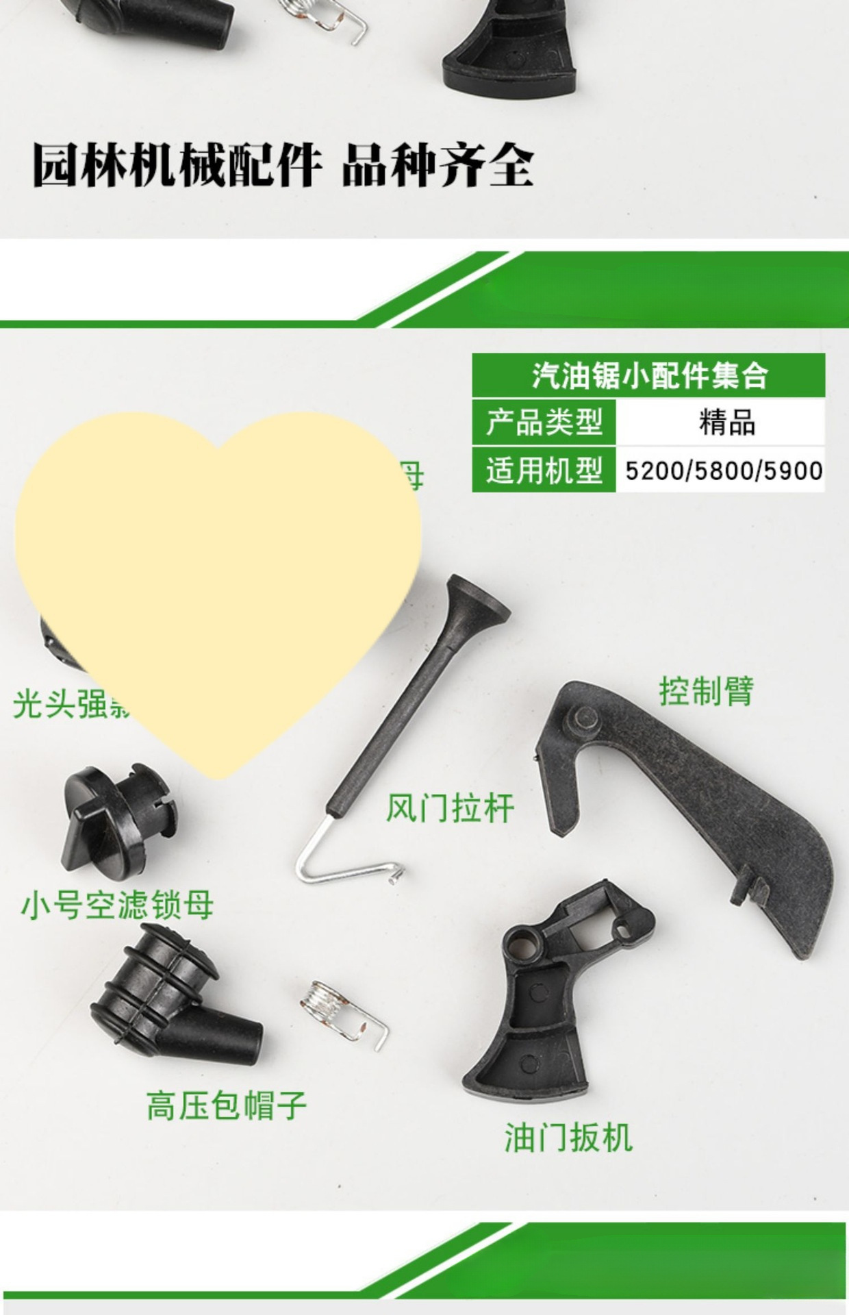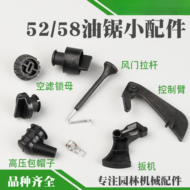 Триггер дроссельной заслонки 52/58/59; Пружина спускового крючка 52/58/59; 52/558 игольчатый роликоподшипник звездочки; 52/558 поршневой игольчатый роликоподшипник; Кнопка управления дроссельной заслонкой 52/58/59; Шапка высокого давления 52/58/59 (с стопорным кольцом); Тяга демпфера 52/58/59; Большой замок воздушного фильтра 52/58/59 матери; Маленький замок воздушного фильтра 52/58/59 матери; 52/558 материнский воздушный фильтр (сильная модель с головой); Сальник коленчатого вала 52/58, 1 пара