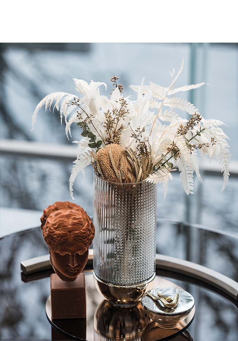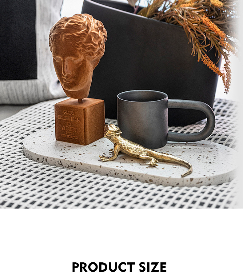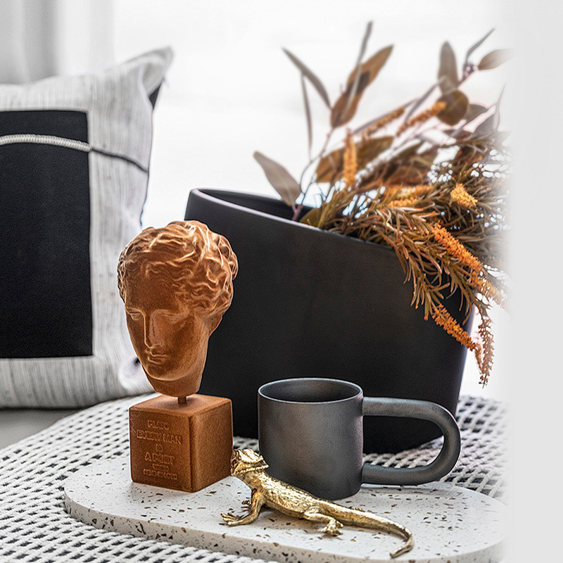 флокированная голова бога; стеклянная ваза; металлическая ящерица; Мраморный поддон для водяного шлифования камня; стеклянная банка для хранения; Пара металлических свечей; Букет имитации цветов