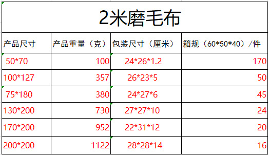 50*70cm; 100*127cm; 75*180cm; 130*200cm; 170*200cm; 200*200cm; 200*260cm; 200*305cm