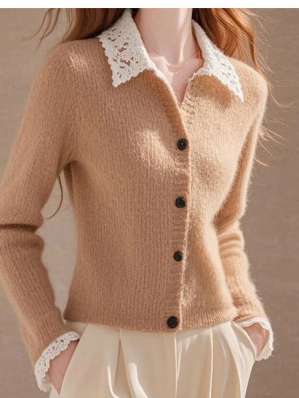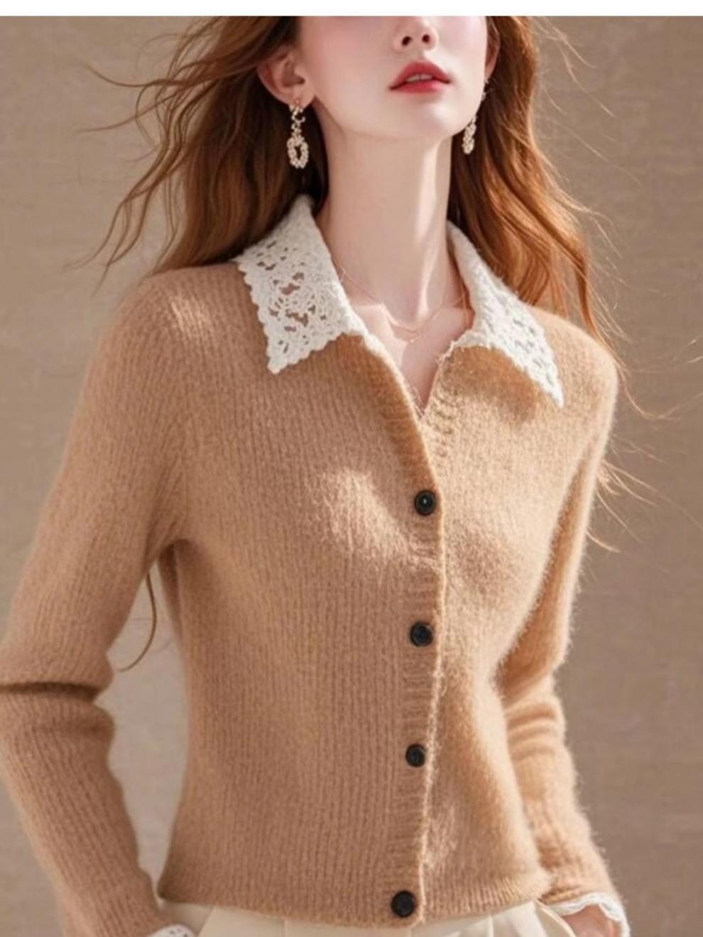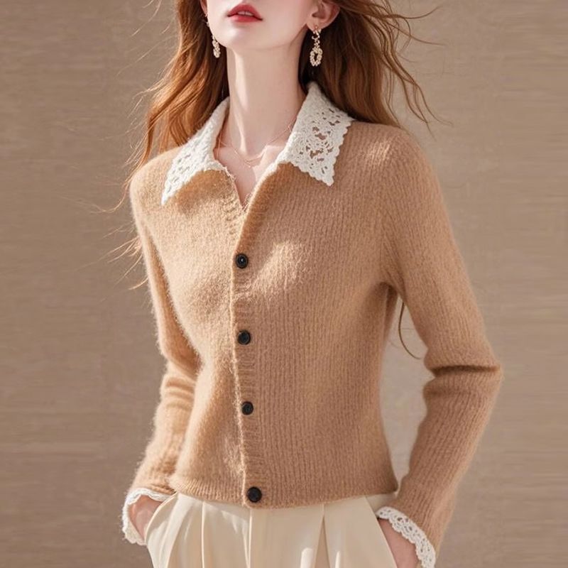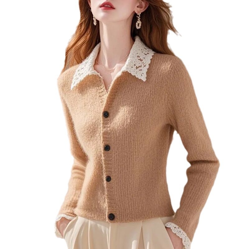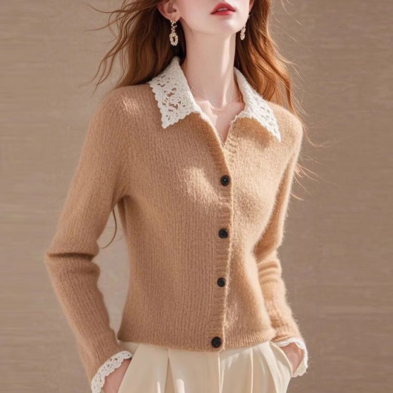 Хаки с лацканом кружевной вязаный кардиган женский 2024 осень-зима новый ретро мягкий восковой длинный рукав одежды