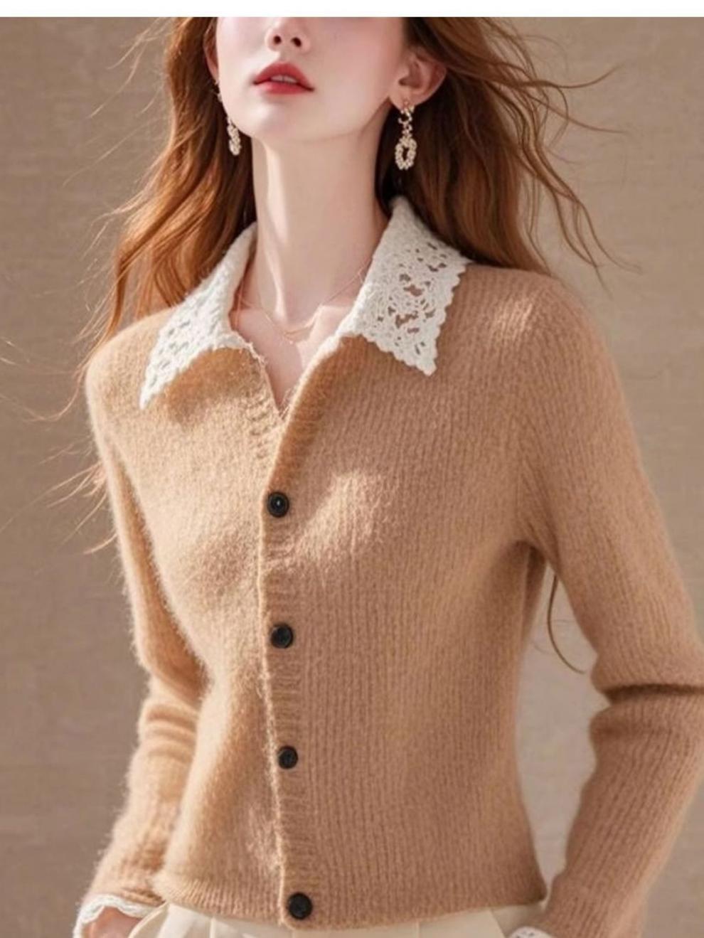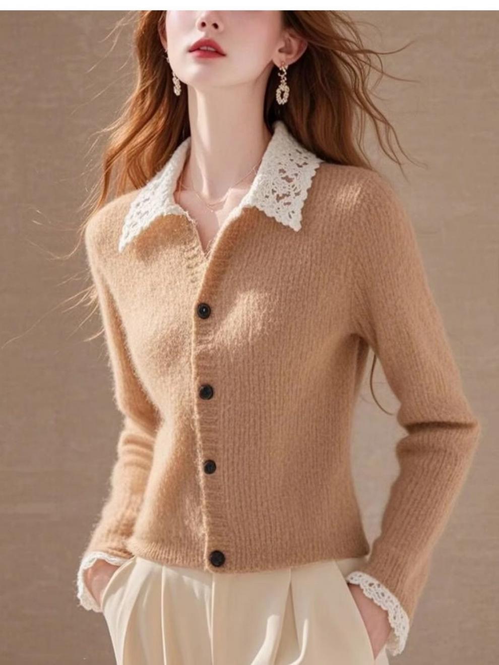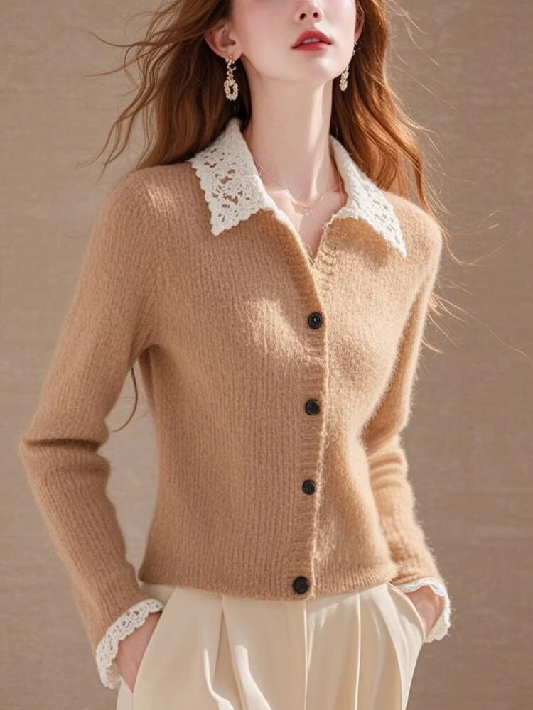 Хаки с лацканом кружевной вязаный кардиган женский 2024 осень-зима новый ретро мягкий восковой длинный рукав одежды