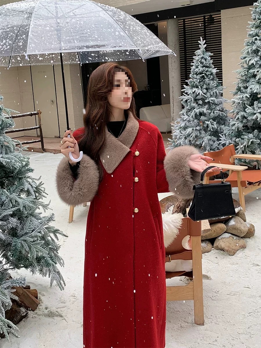 Красное рождественское пальто Новогоднее одеяние шерстяное пальто 2024 осень и зима новая свободная средняя длинная темпераментная пальто для женщин