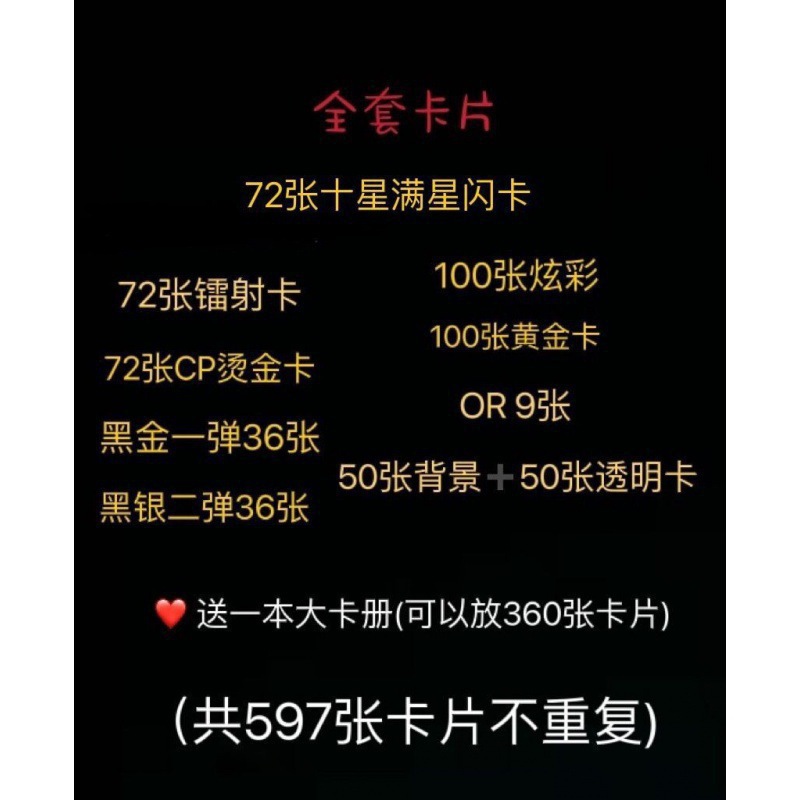 Флэш-карты (72 недубликатных карт); 144 флэш-карты (не повторяются); 144 блестящие карты (не повторяются); Прозрачная карта (50 прозрачных + 50 фонов, не повторяющихся); Карты CP (72 недубликатных карт); ИЛИ иллюстративные карты (9 неповторяющихся карт); SP одна бомба (36 недублируемых изображений); SP две бомбочки (36 неповторяющихся изображений); Одна пуля LGR из черного золота (36 неповторяющихся изображений); LGR черное золото две бомбочки (36 неповторяющихся изображений); Одна пуля LGR черного и серебристого цвета (36 неповторяющихся изображений); Флэш-карты SP (100 неповторяющихся карт); Ограниченная карта SP из черного золота; Фиолетовая карта GP (36 недублируемых карт); Красный GP (100 изображений не повторяются); Blue GP (100 недублируемых изображений); Новый фиолетовый GP (100 неповторяющихся изображений); Карты подписи (36 неповторяющихся карт); Одна бомба золотых карточек с короной (20 неповторяющихся карт); Карта Golden Crown Две пули (20 недублируемых карт); Боевые карты Golden Crown (20 неповторяющихся карт); Карты с большой головкой (20 недублируемых карт); Горизонтальные карты Golden Crown (20 неповторяющихся карт); Карты героев (20 недубликатных карточек); 100 карточек с золотой короной (не повторяются); 100-звездочные флэш-карты, которые не повторяются (без версий монстра); Маленькая карточная книга (80 слотов для карт) со случайной обложкой; Большая карточная книга (180 слотов для карт) со случайной обложкой.; 100 прозрачных карт не повторяются.; 100 смешанных (комплексных) карточек; 100 карточек SP + 50 золотых карточек (не повторяются); 100 карт SP + 50 карточек подписи; Радужные карты XR (50 неповторяющихся карт); Полный набор карт (всего 97 карт) поставляется с большой карточной книгой, вмещающей 360-карт.; Большой роскошный полный набор карточек (всего 1091 карт) включает в себя 2 большие карточные книги.; 50 3D-телевизионных карточек (не повторяются); 10 3D-телевизионных карточек (не повторяются); 44 3D-карты (не повторяются); Разноцветная зеркальная фотокамера (набор из 100 листов)