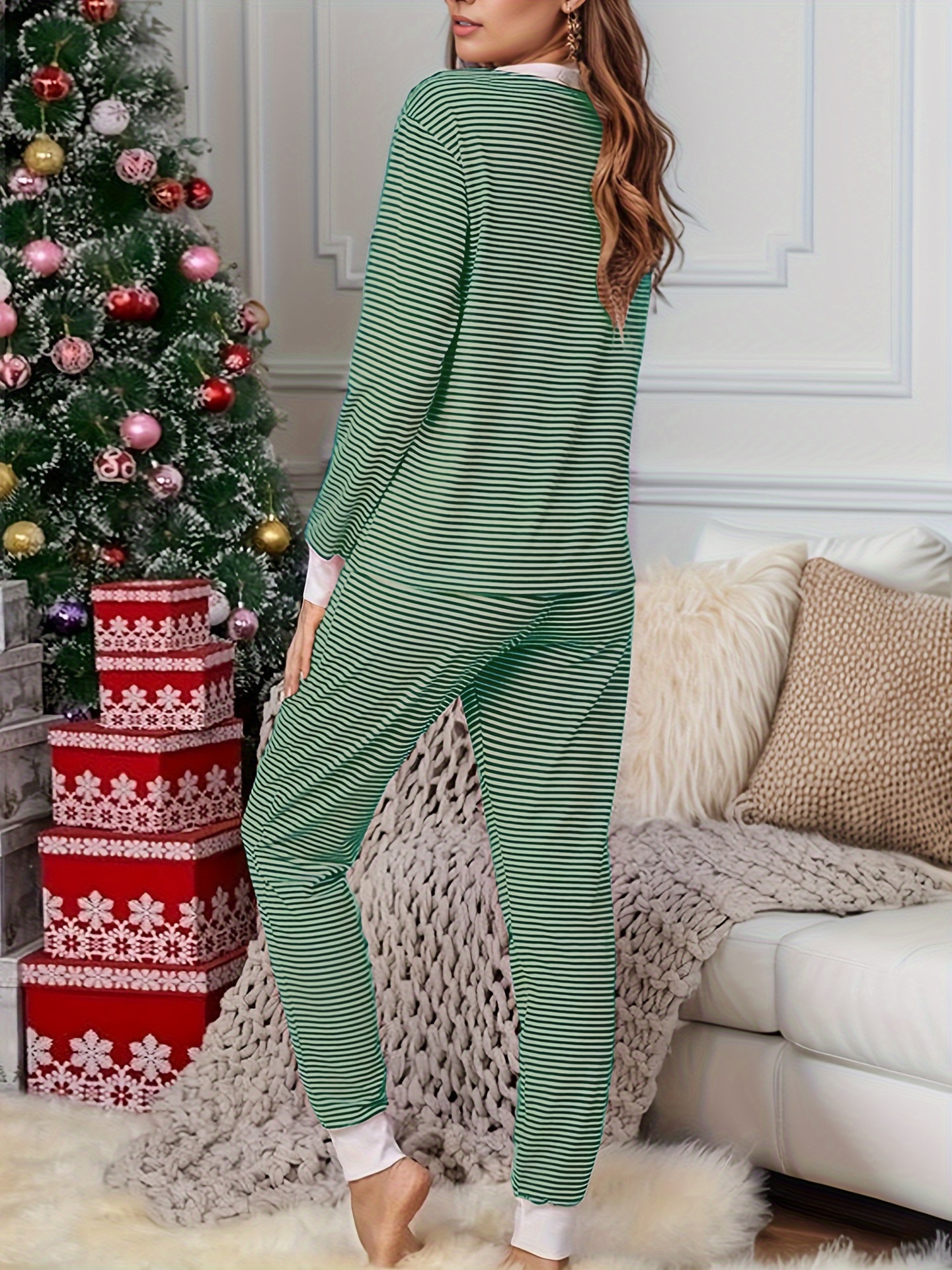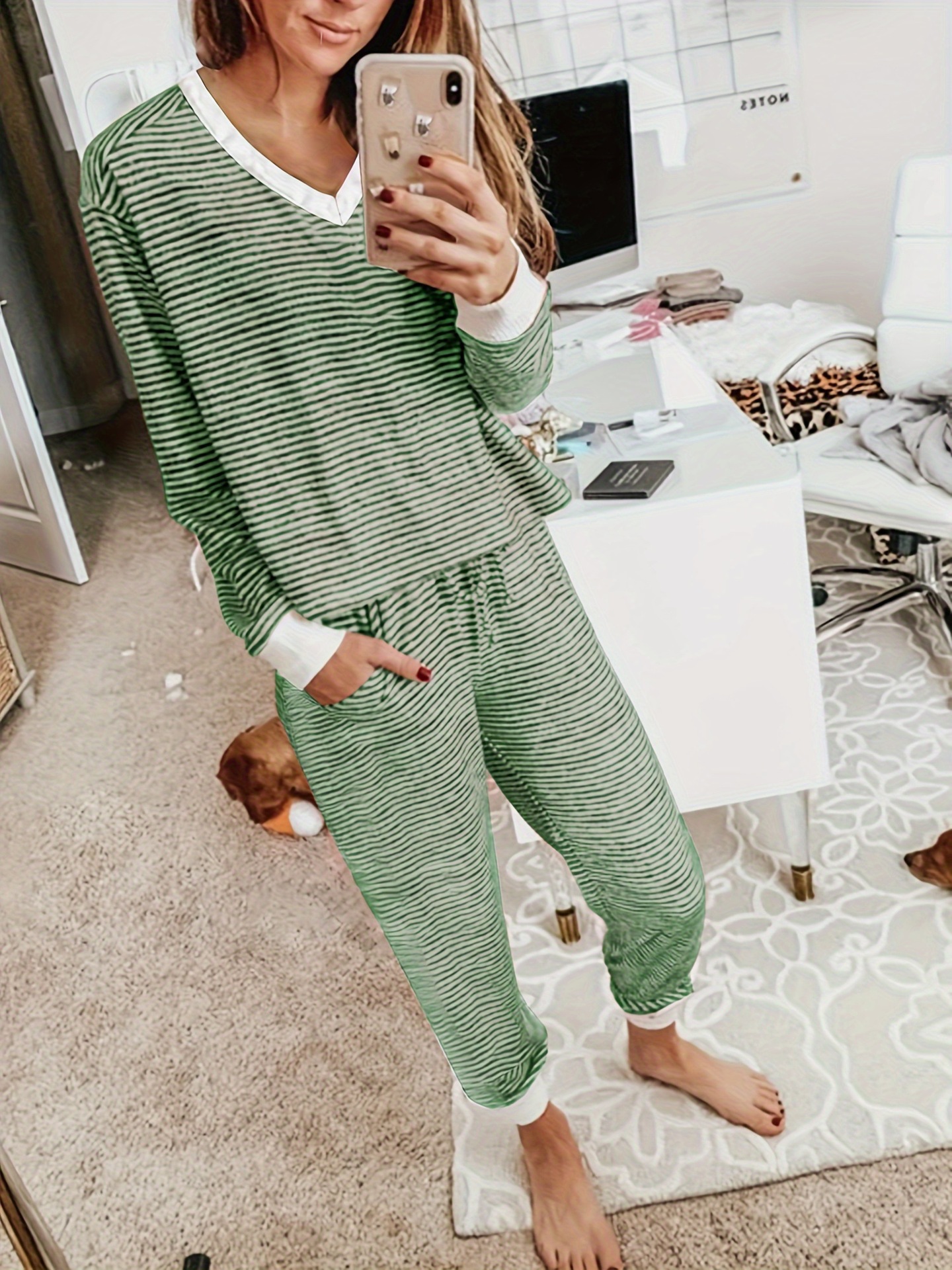 2024 Amazon AliExpress Европа и США рождественские полоски с контрастным цветом с V-образным вырезом с длинными рукавами брюки повседневный набор