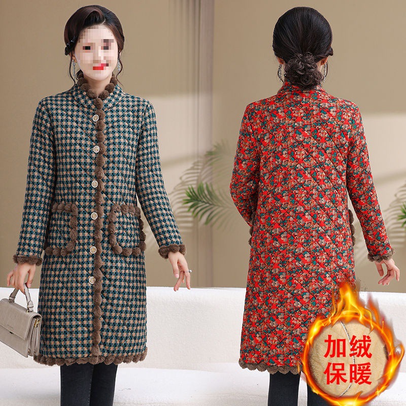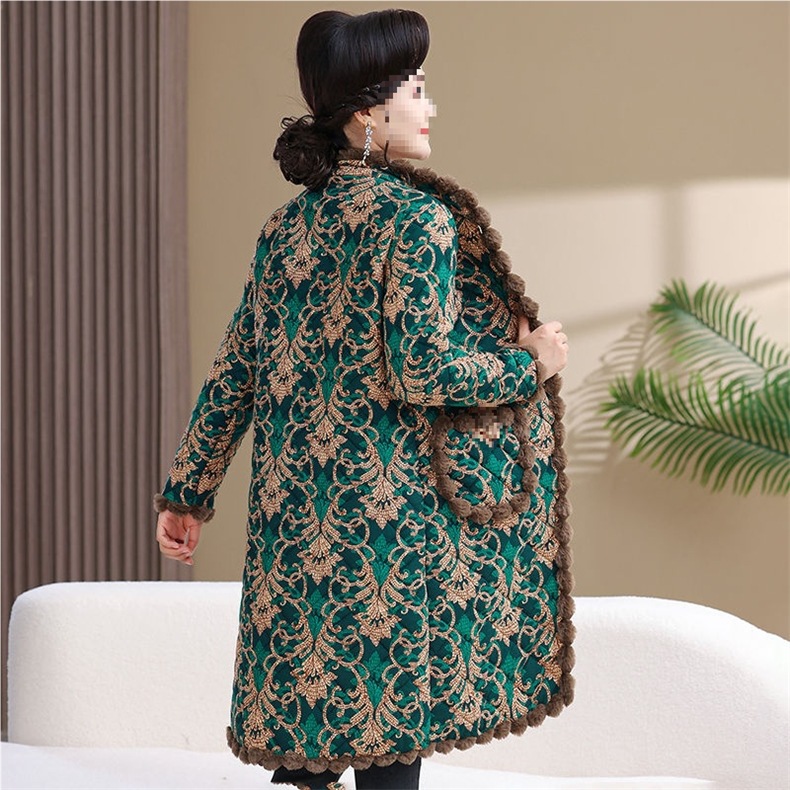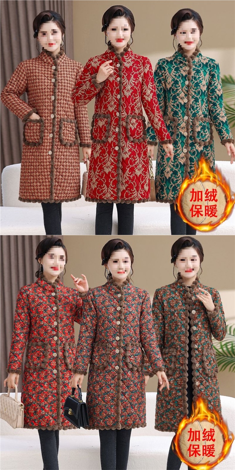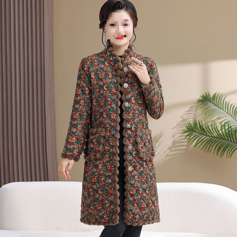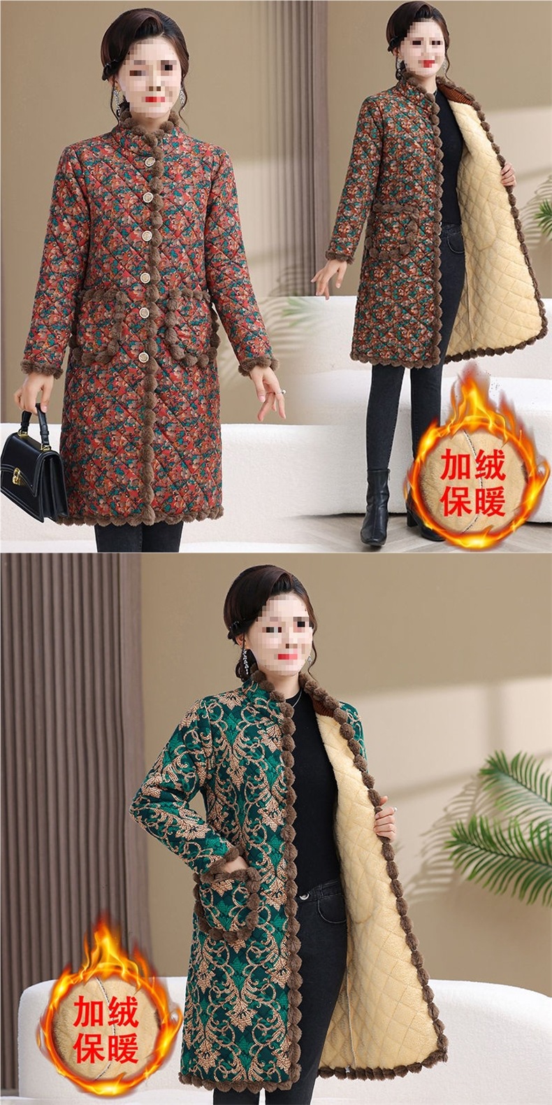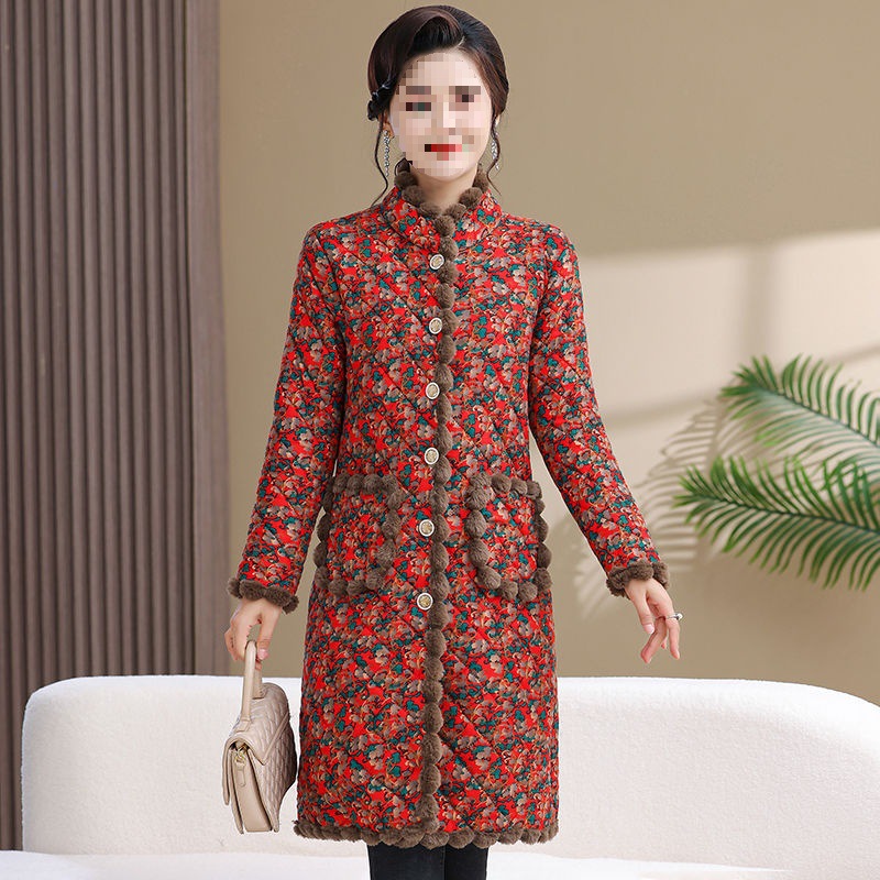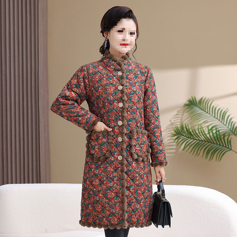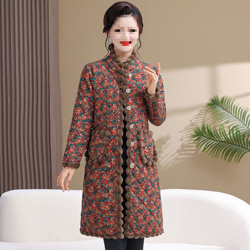 Мама осень и зима новый бархатный толстый длинный большой размер свободный средний и пожилой хлопчатобумажная куртка теплая цветочная хлопчатобумажная куртка