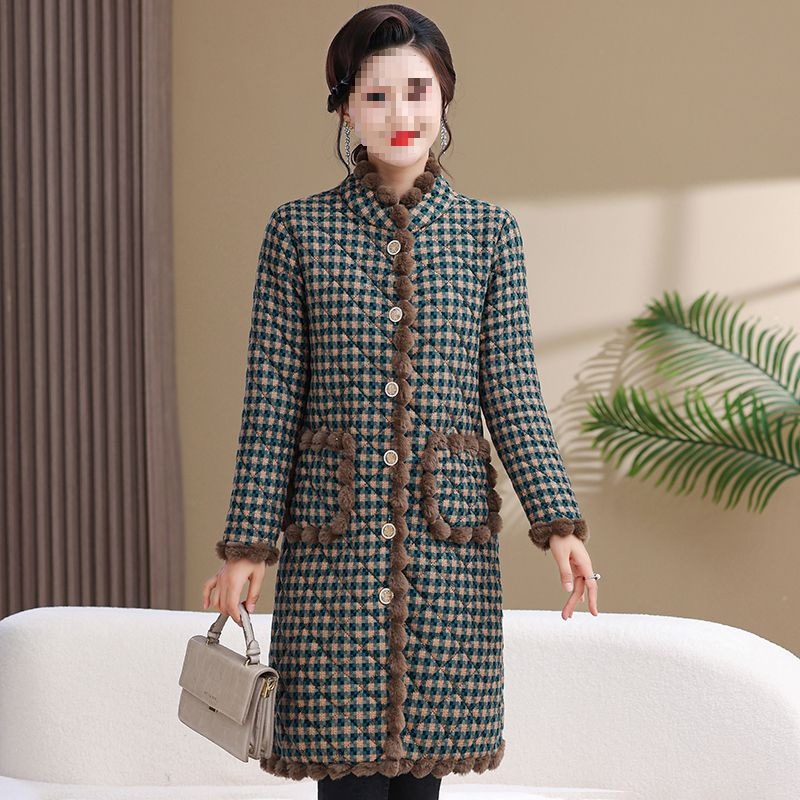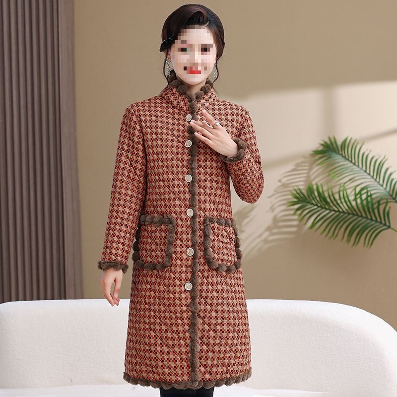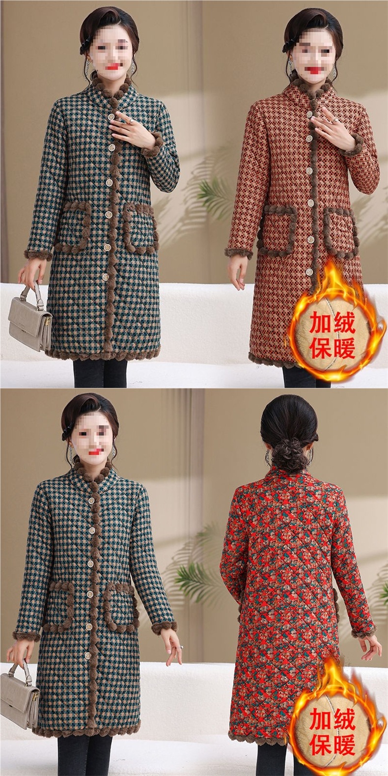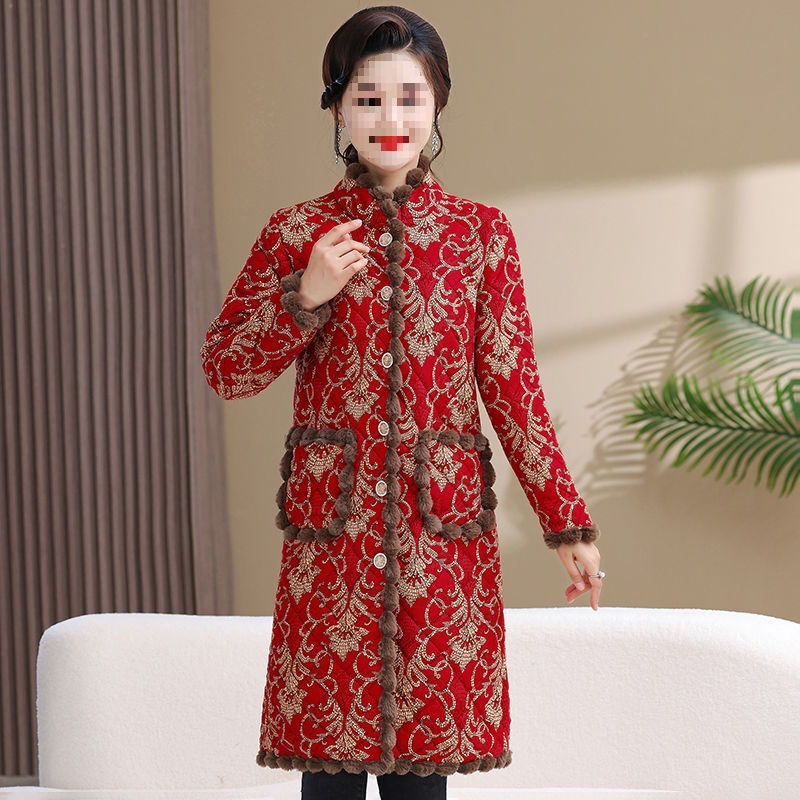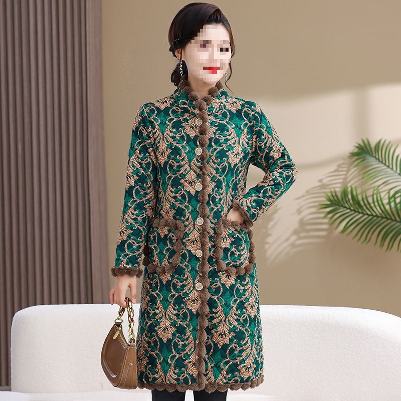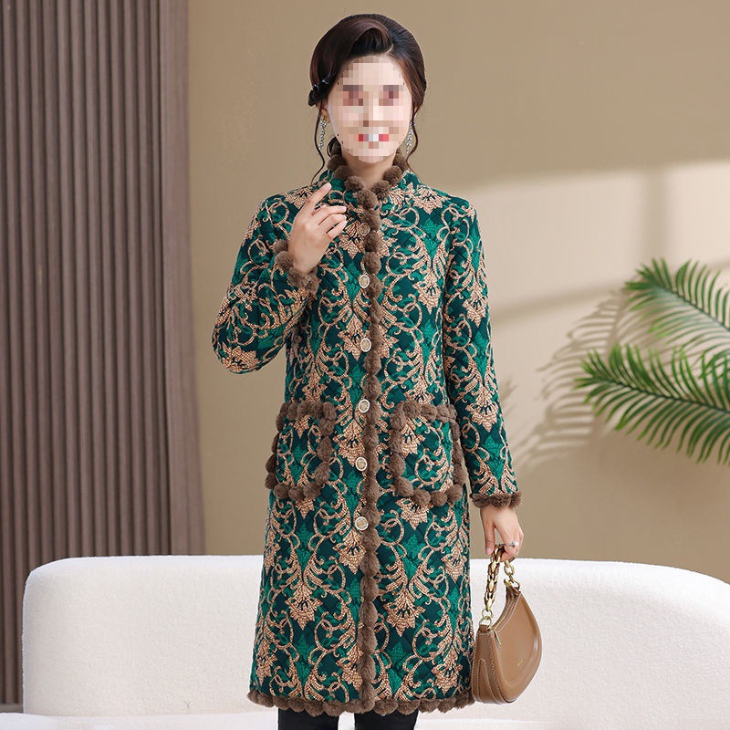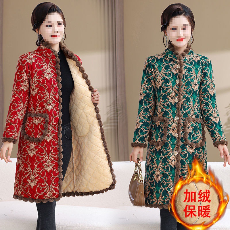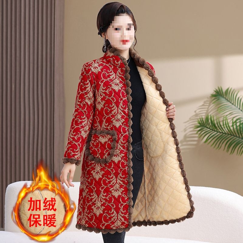 Мама осень и зима новый бархатный толстый длинный большой размер свободный средний и пожилой хлопчатобумажная куртка теплая цветочная хлопчатобумажная куртка