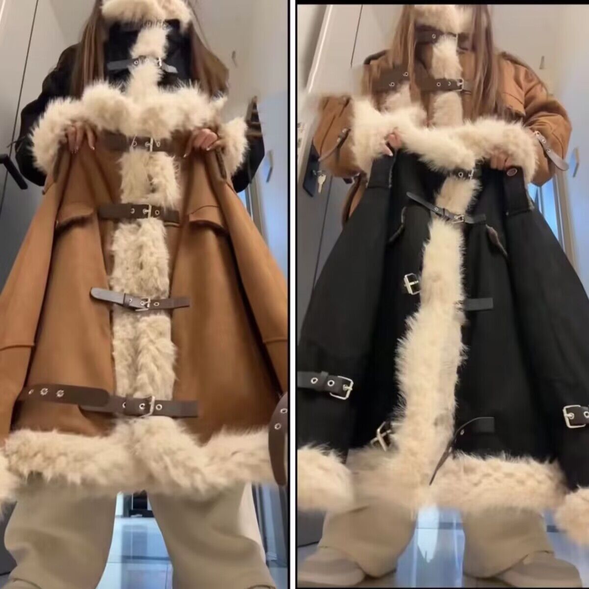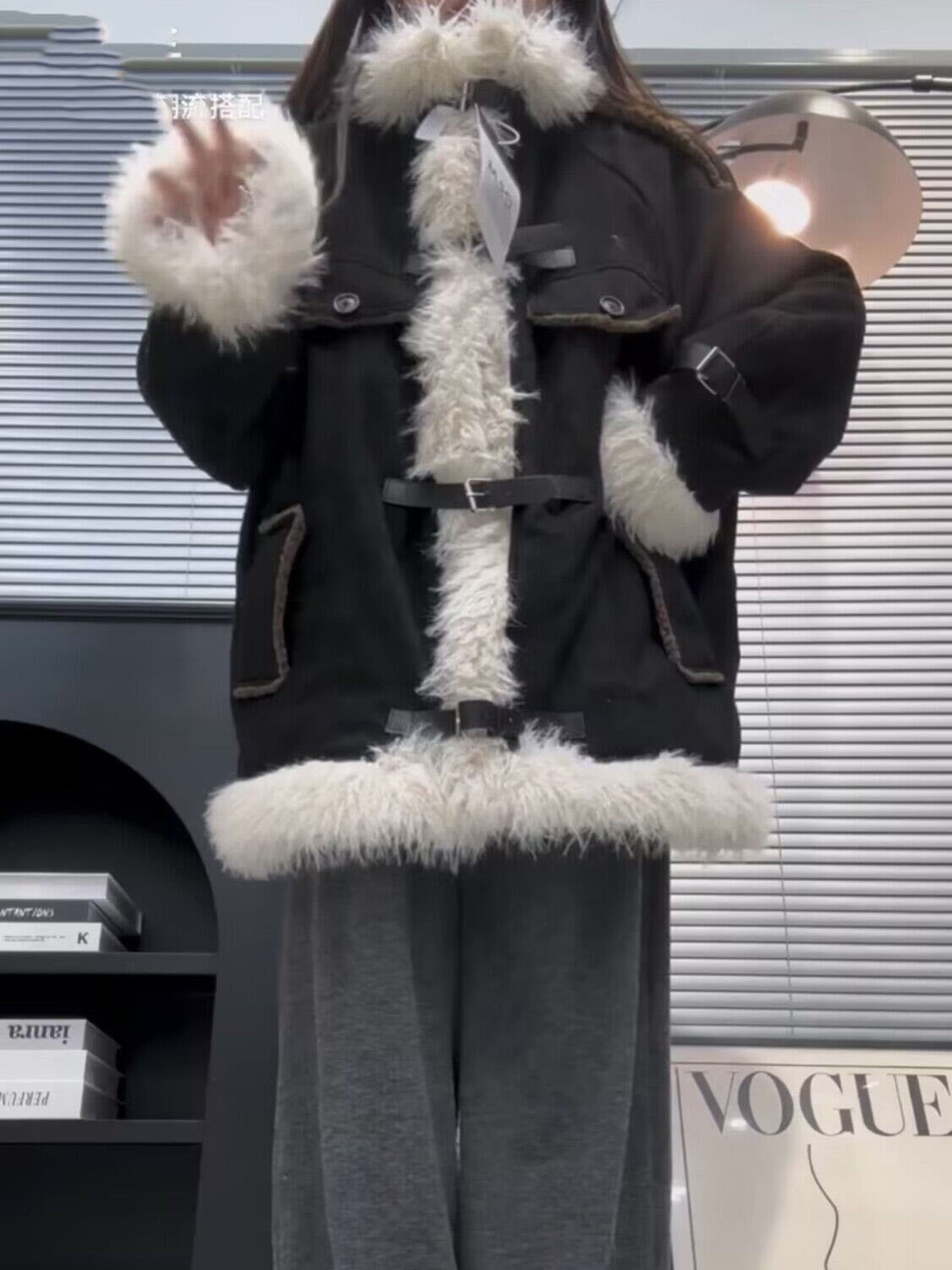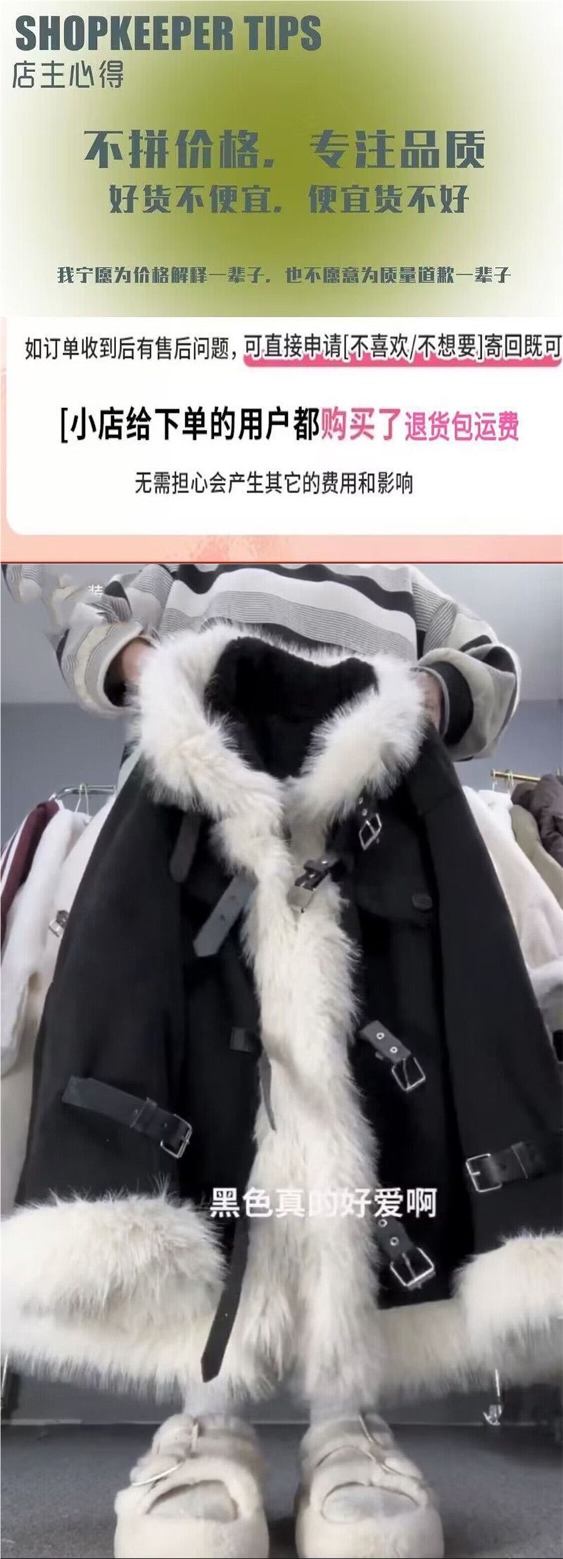 Флоат из оленьей кожи пара американский ретро теплая бархатная утолщение зимний интегрированный пушистый воротник шерстяная куртка кожаная пряжка дизайн