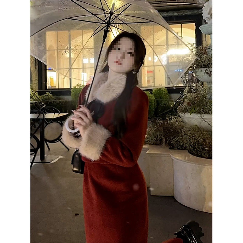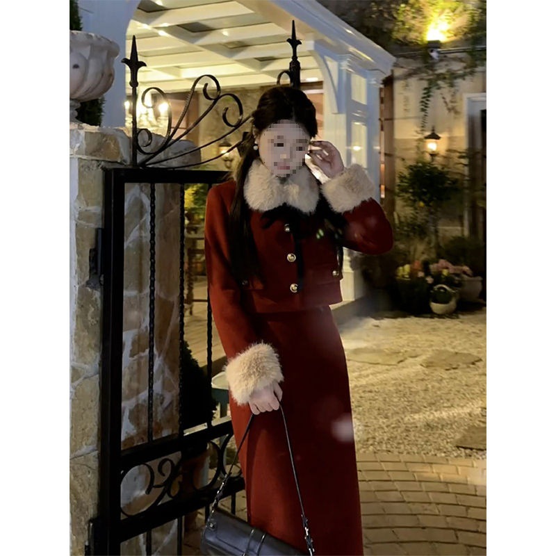 Красная рубашка мм шерстяная матовая французская ретро новый маленький ароматный ветер осень и зима короткая куртка леди полуюбка женский набор из двух частей