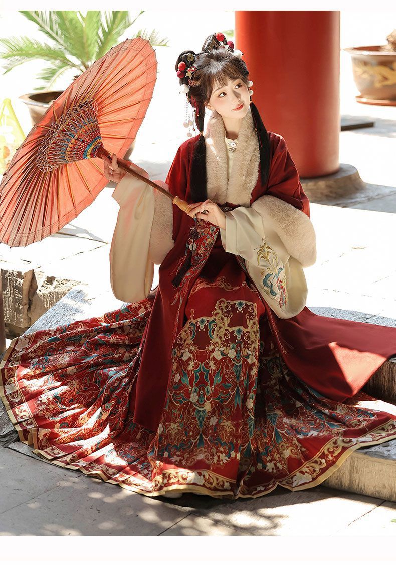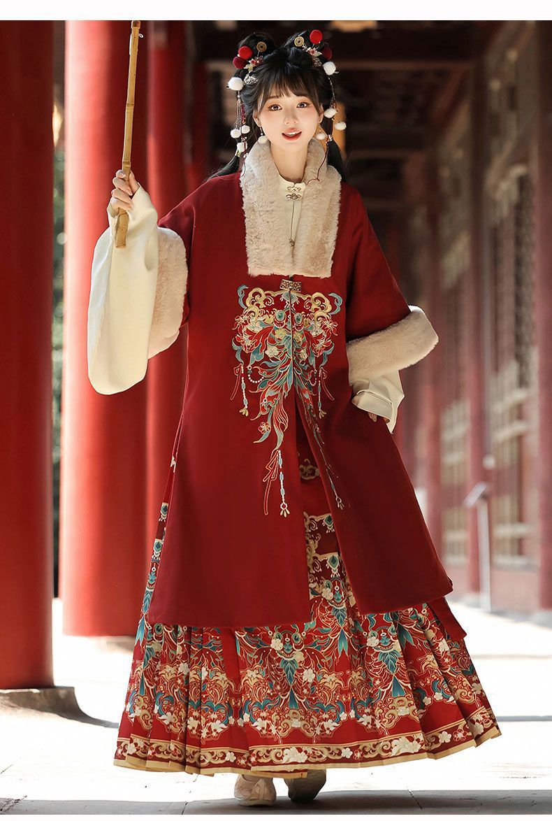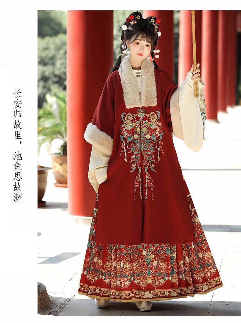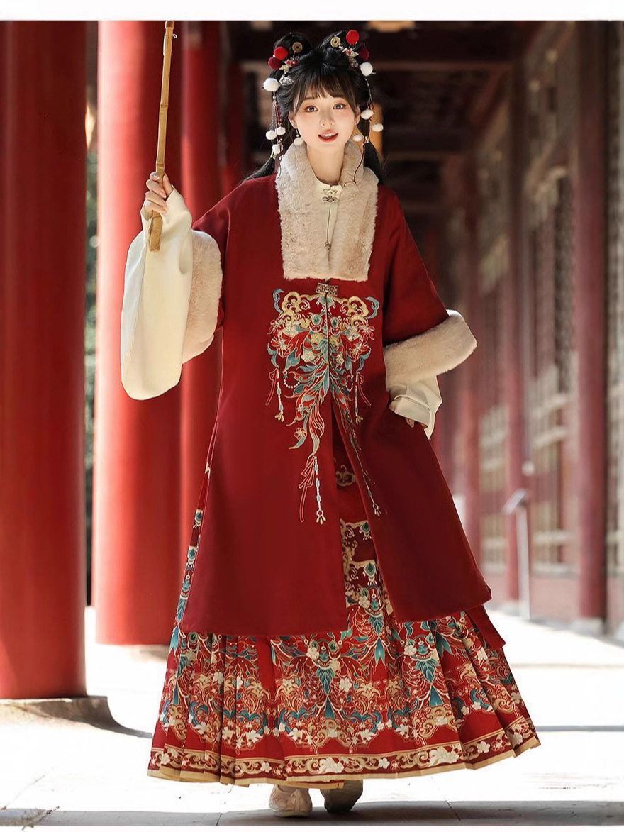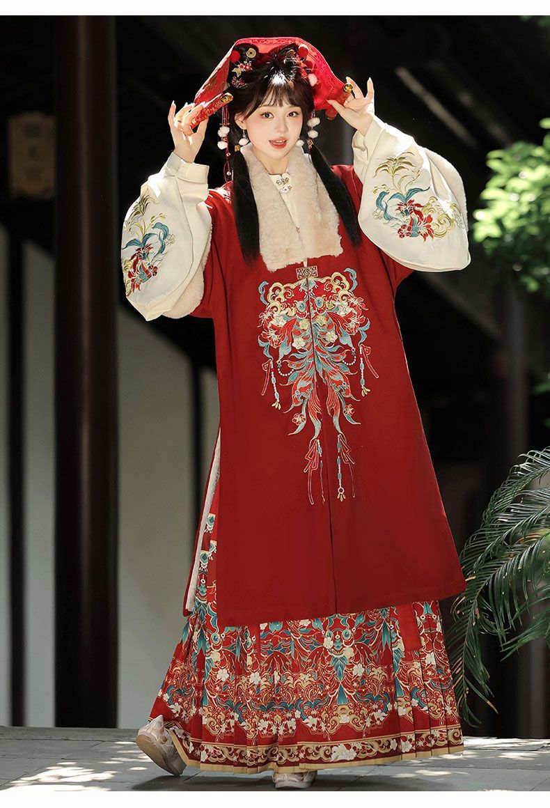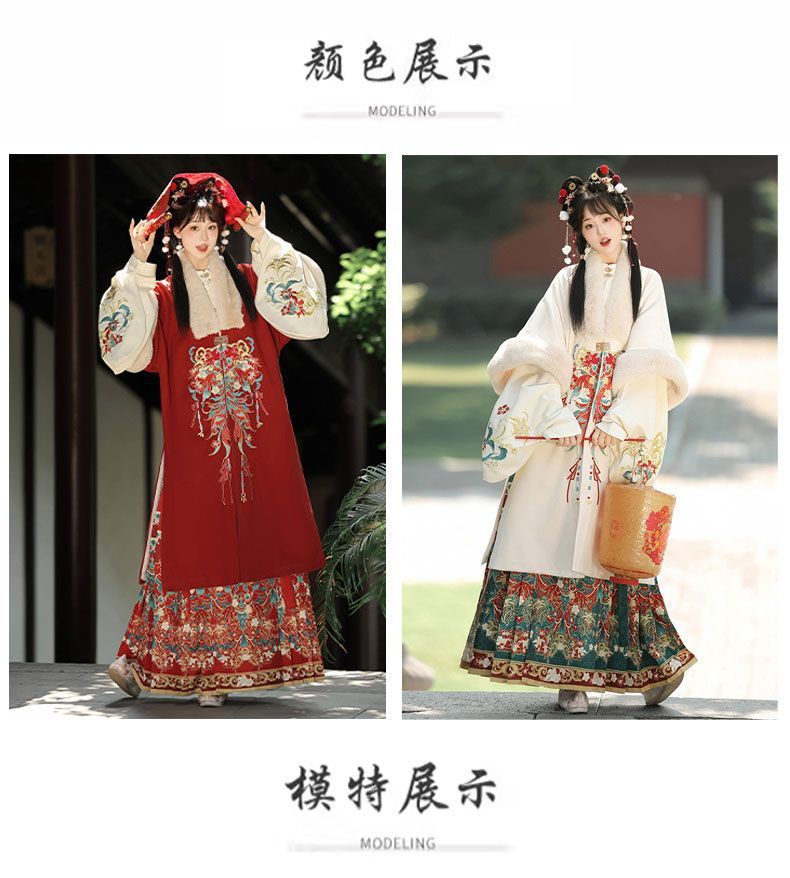 Бежевая одежда + подкладка + зеленая юбка для лошади.; Цегляно-красная одежда + подкладка + поверхность красной лошади.; Бежевая комбинированная одежда с воротником; Одежда с кирпичным красным воротником