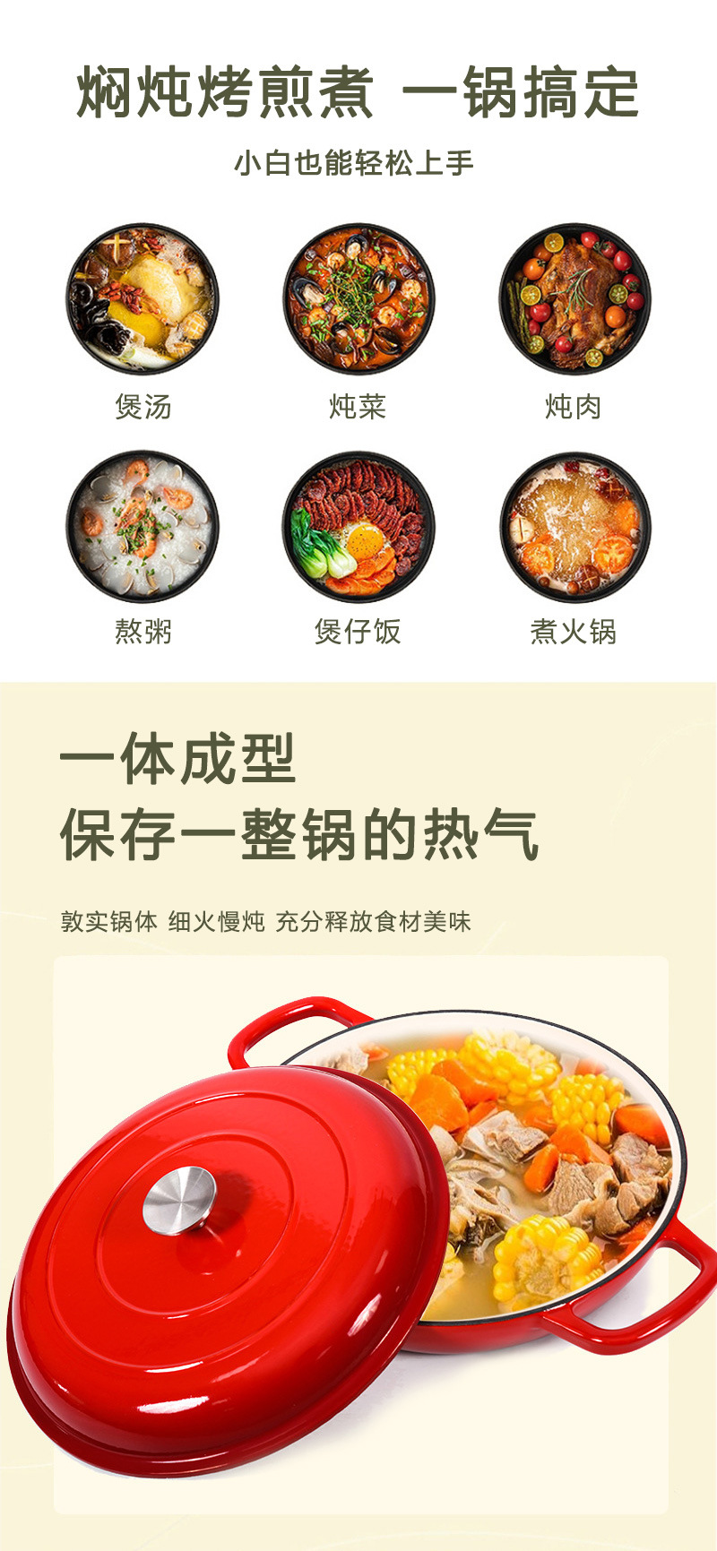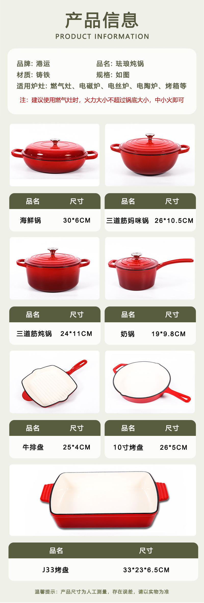 30 горшков для морепродуктов (3,5 литра) Горшок для морепродуктов 30 см; 26 горшок для мамы с тремя ребрами (3,82 литра) круглый горшок 26x10,5 см; 24 кастрюли с тремя ребрами (4 литра) круглые кастрюли диаметром 24 см.; 19 молочница (1,85 литра) молочница 19х9,8см; 10inch Форма для выпечки (2,1 л) Круглая сковорода диаметром 10 футов; 25 сковороды для стейков (1,4 л) Квадратная сковорода-гриль 25 см; J33форма для выпечки (3,5 л) Форма для выпечки 33x23 см; Набор посуды из чугуна и эмали, 7 шт. Набор посуды из чугуна и эмали, 7 шт.