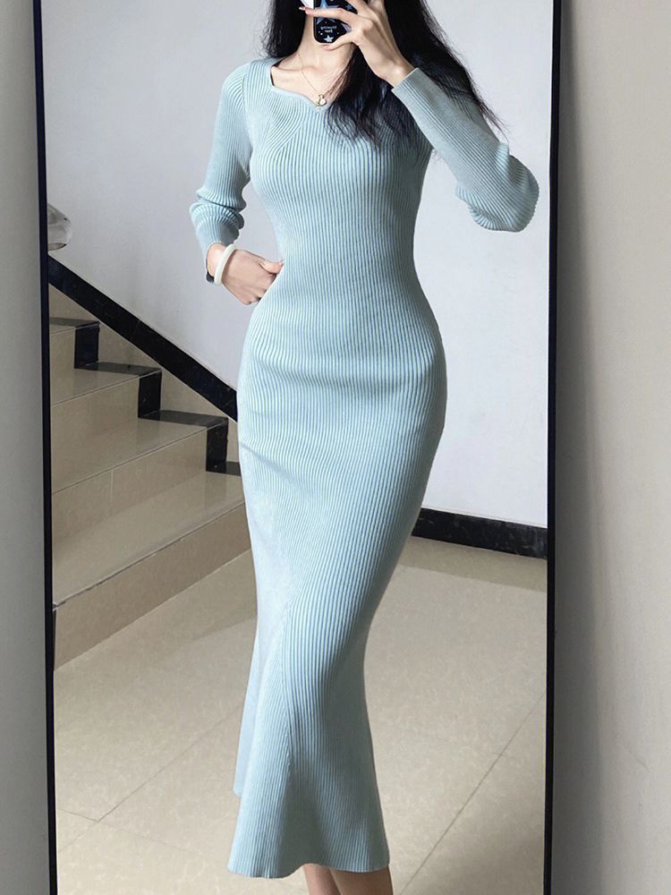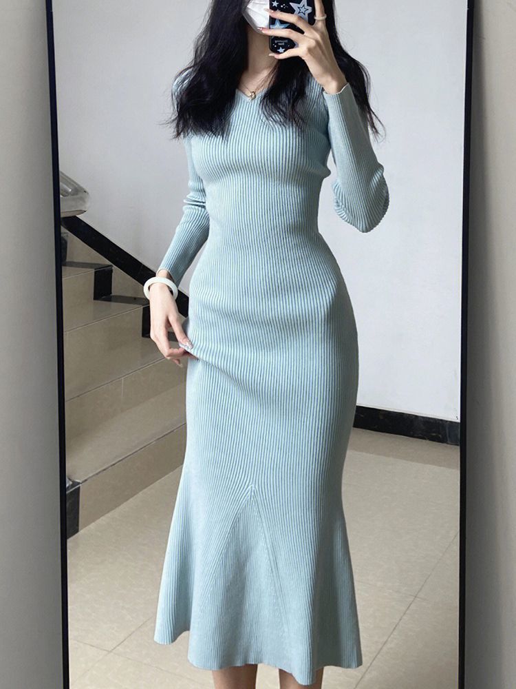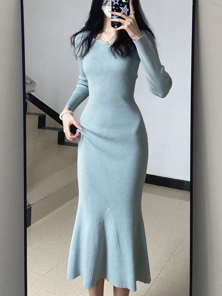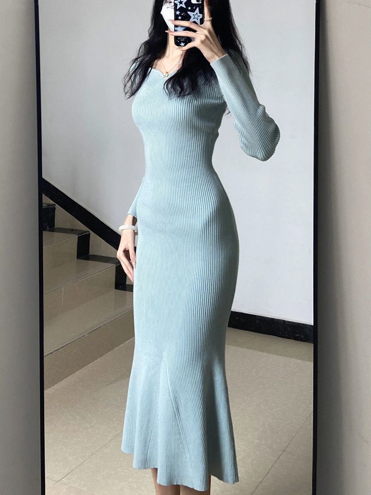 Синее трикотажное платье с эффектом "рыбьего хвоста" для женщин, весенне-осенне-зимний вариант с внутренним слоем, облегающая юбка, длинное платье с зауженной талией, черного цвета.