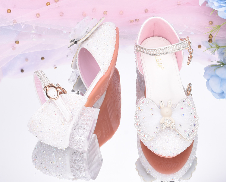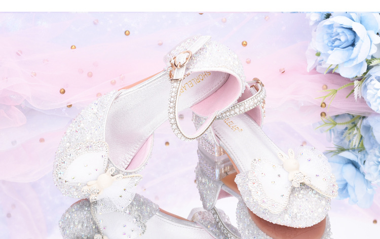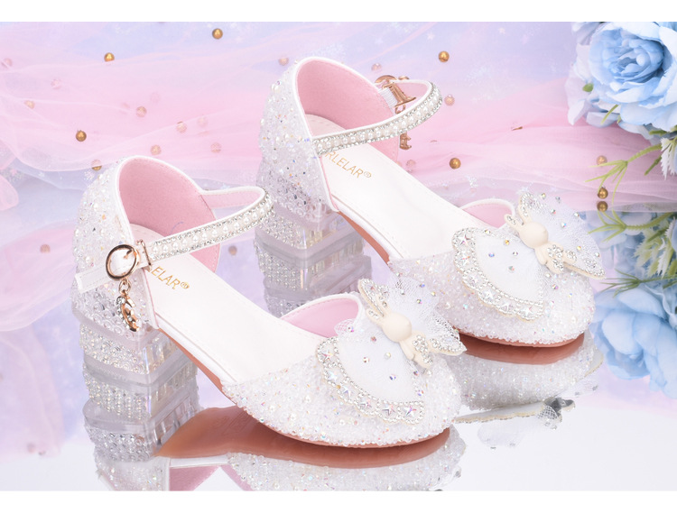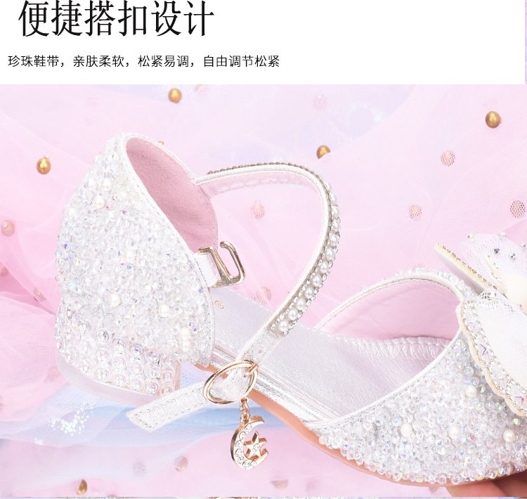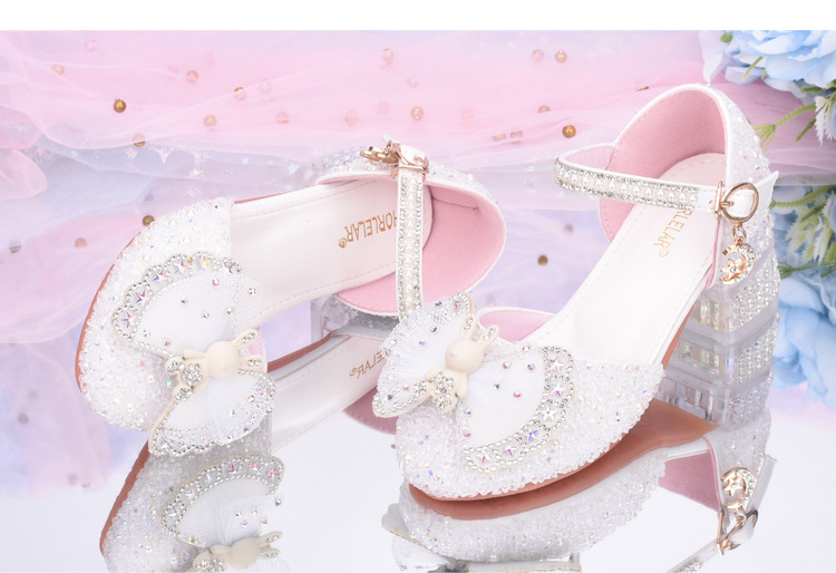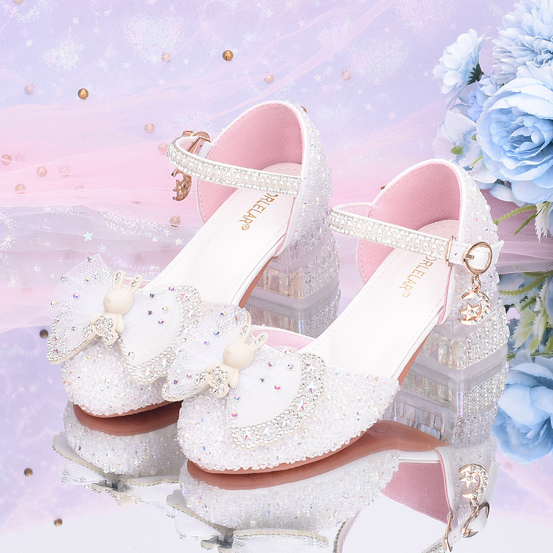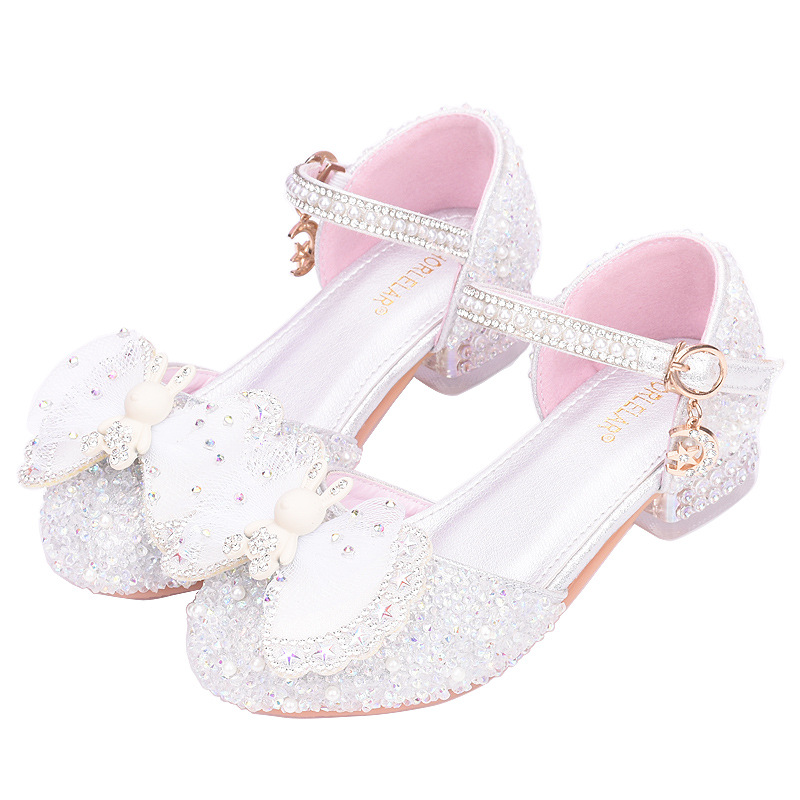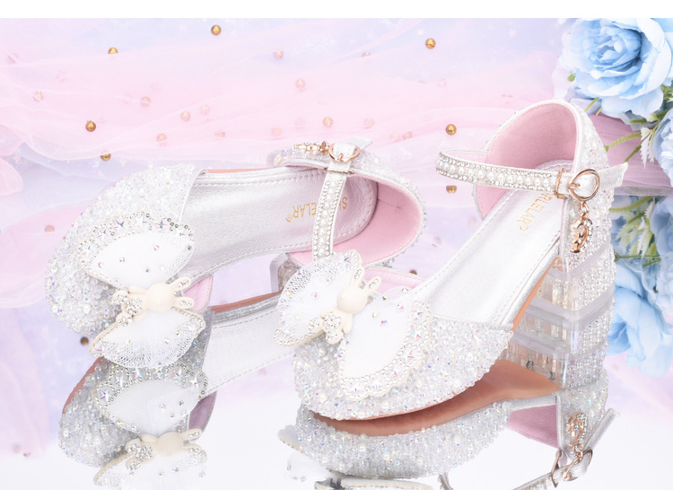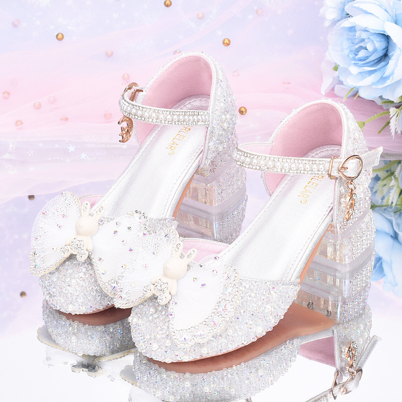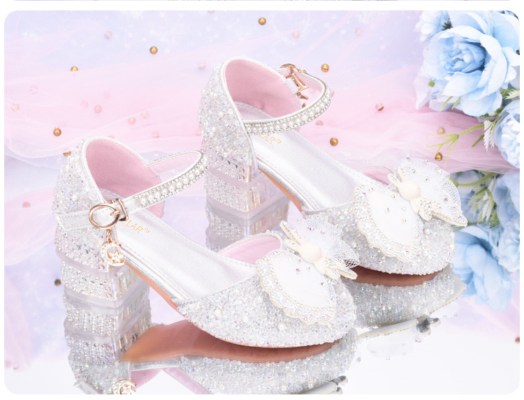 Серебряные детские туфли на высоком каблуке белые кожаные туфли для девочек кроссовки принцессы весной и летом на низком каблуке хрустальные туфли для девочек