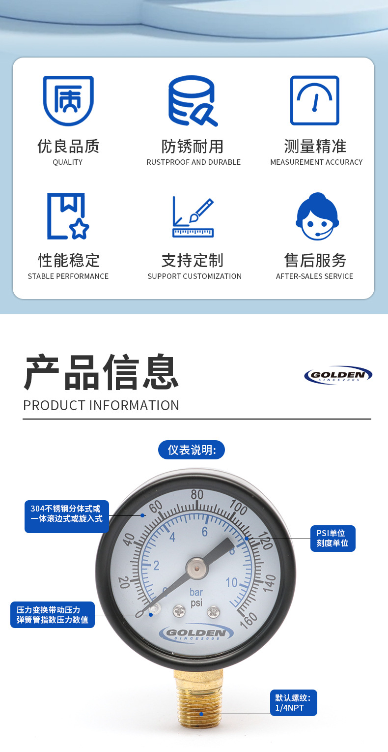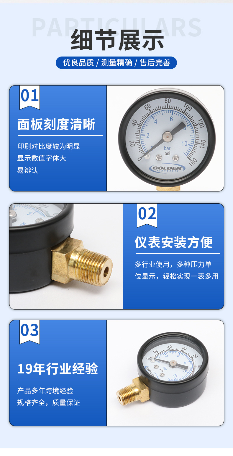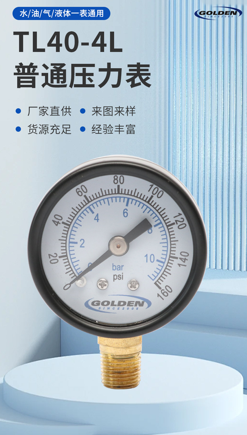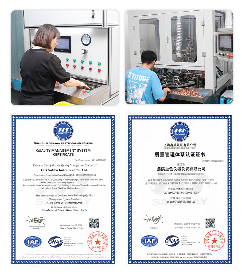 大家好,欢迎来到慈溪金色仪器仪表有限公司,我公司成立于2005年专业设计制造出口型压力表生产型企业。具有全新的管理体系及技术力量,从2006年开始产品远销美洲,欧洲等各国,并与知名品牌长期合作。